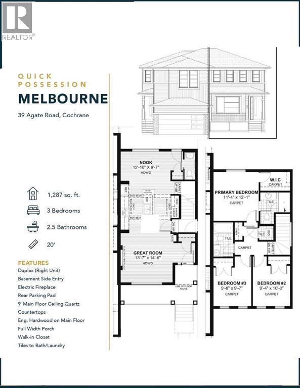 IMMEDIATE POSSESSION! BRAND NEW HOME by Douglas Homes, Master Builder in central Greystone, short walking distance to the Bow River, shopping & interconnected pathway system. Featuring the Melbourne with additional SIDE ENTRY. Located down the street from the community Kids Play Park on a sunny west facing backyard, great for entertaining. This gorgeous 3 bedroom, 2 & 1/2 half bath home offers over 1225 sq ft of living space. Loads of Designer/upgraded features in this beautiful, open floor plan. The main floor greets you with a grand glazed 8' front door, soaring 9' ceilings, oversized windows , & 8' 0" passage doors. Distinctive Engineered Hardwood floors flow through the Foyer, Hall, Great Room, Kitchen & Nook adding a feeling of warmth & style. The two sided Kitchen is completed with an oversized entertainment island (9'0" single level island) & breakfast bar, roomy cabinet pantry, Quartz Countertops, 42" Cabinet Uppers accented by decorative drywall bulkhead, Pots & Pans Drawers, soft close doors & drawers throughout, new stainless appliance package including Microwave/Hood Fan combo over the stove , smooth top electric Range, Fridge & built-in Dishwasher. The main floor is completed with an expansive, open Great Room with Napoleon "Entice" fireplace, spacious Nook finished with over height windows, rear entry with full French Door & transom above, closet & 1/2 bath . Upstairs you'll find a well sized Primary Bedroom with 3 piece Ensuite including separated Quartz vanity with undermounted sink & oversized 5'0" x 3'0" shower with tiled walls & ceramic tile flooring. There is also a generous sized walk-in closet accessed from the bedroom. There are two additional good sized bedrooms with roomy closets. The second floor is completed by a main bathroom with combination Tub/Shower with tiled walls, Quartz countertop with undermounted sink & in-vanity drawer all completed by ceramic tile flooring. You're certain to love the convenience of the 2nd Laundry for stacked washer/dryer also completed with tile flooring. This is a very popular plan, great for young families or for the sizing down crowd. Spacious, Beautiful and Elegant! The perfect place for your perfect home. Call today! Photos are from prior build & are reflective of fit, finish & included features. Note: Front elevation of home & interior photos are for illustration purposes only. Actual elevation style, interior colors/finishes, & upgrades may be different than shown & the Seller is under no obligation to provide them as such. Directions: Come to the Show Home first at 500 River Avenue. THIS HOME IS UNDER CONSTRUCTION (id:53676)