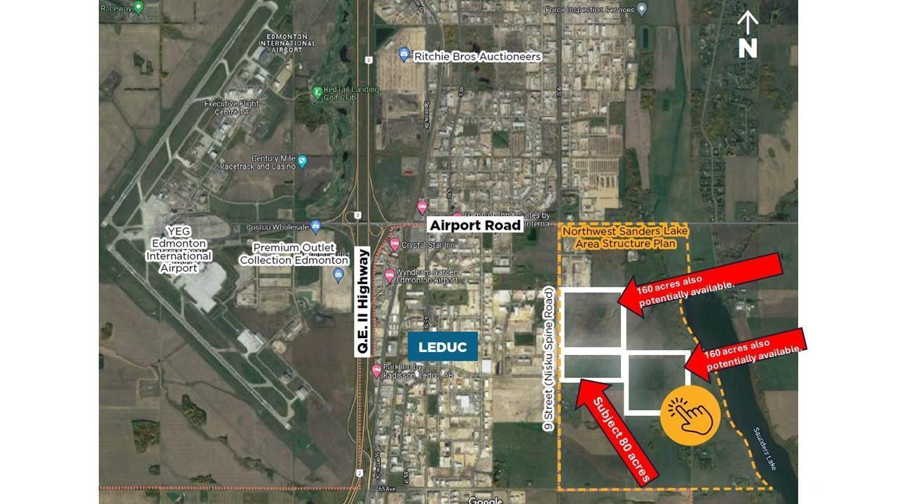 80 Acres. Located in the Northwest Saunders Lake ASP; Five minute drive to Edmonton International Airport; Adjacent to Leduc city limits and 10 minutes to Leduc core; Parcels can be purchased together or separately; Located south of Nisku Business Park; ; Parcel Size: 80 AC + 160 AC + 160 AC=400 Acres. Zoning: AG (Agriculture). Legal Description: West 80 - 4;24;50;6;NW East 160 - 4; 24;50;6;NE - West 160 - 4;24;50;7;SW. Information herein and auxiliary information subject to becoming outdated in time, change, and/or deemed reliable but not guaranteed. . (id:53676)