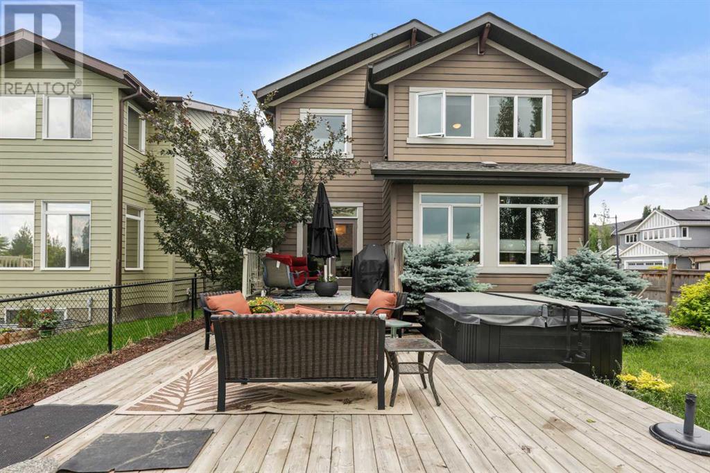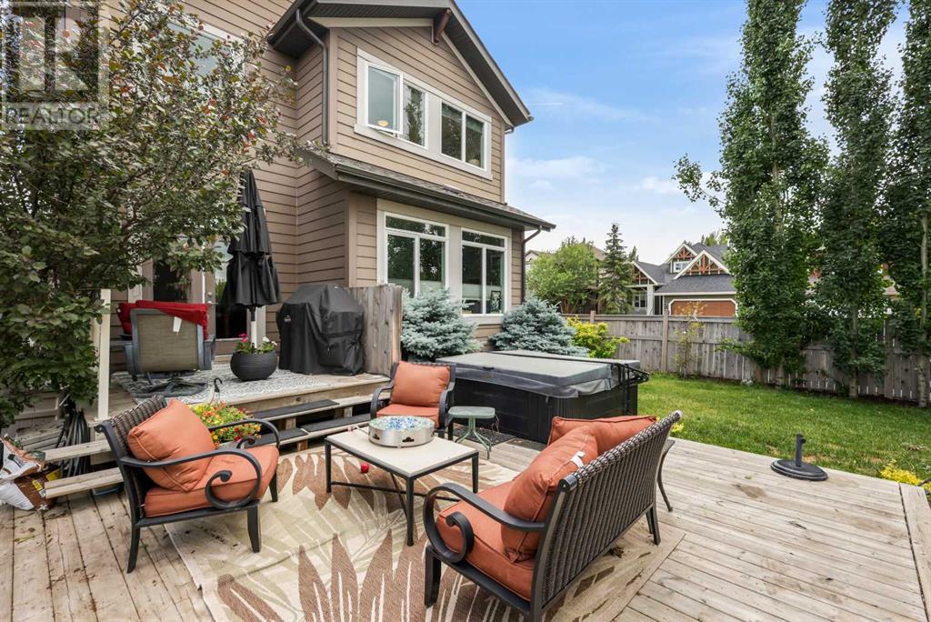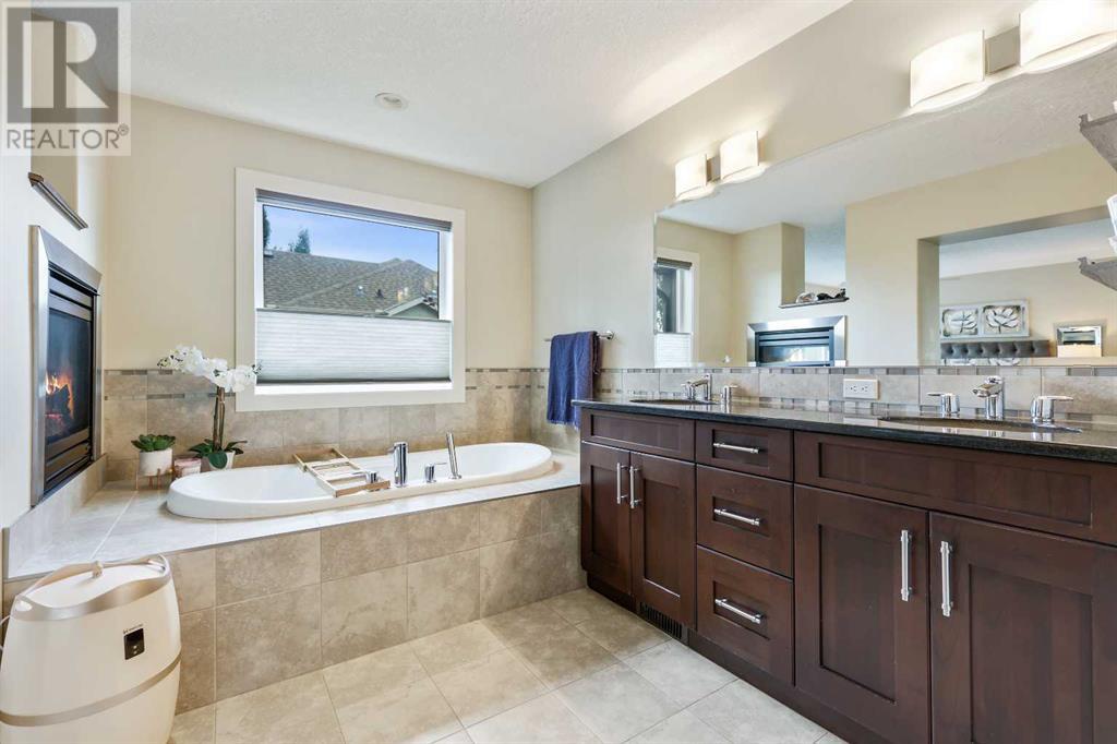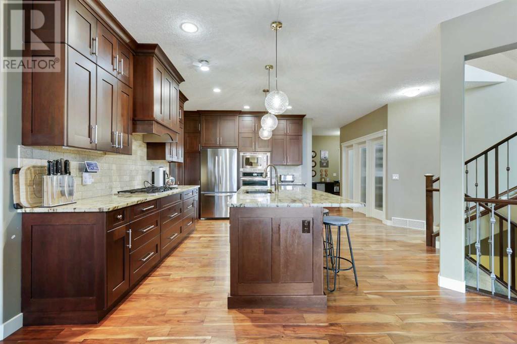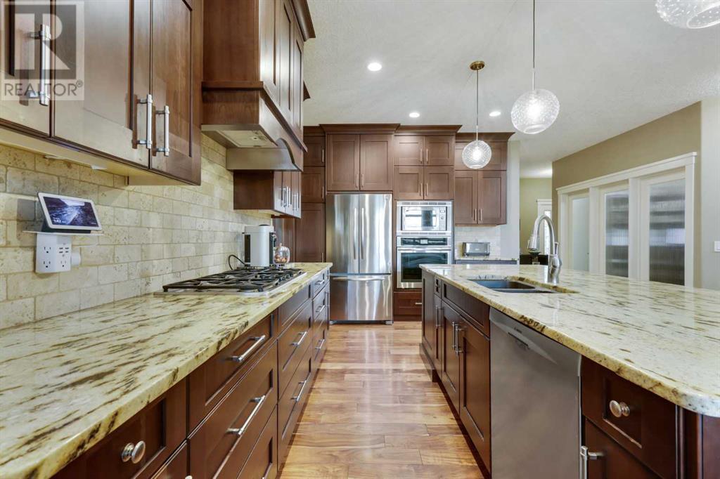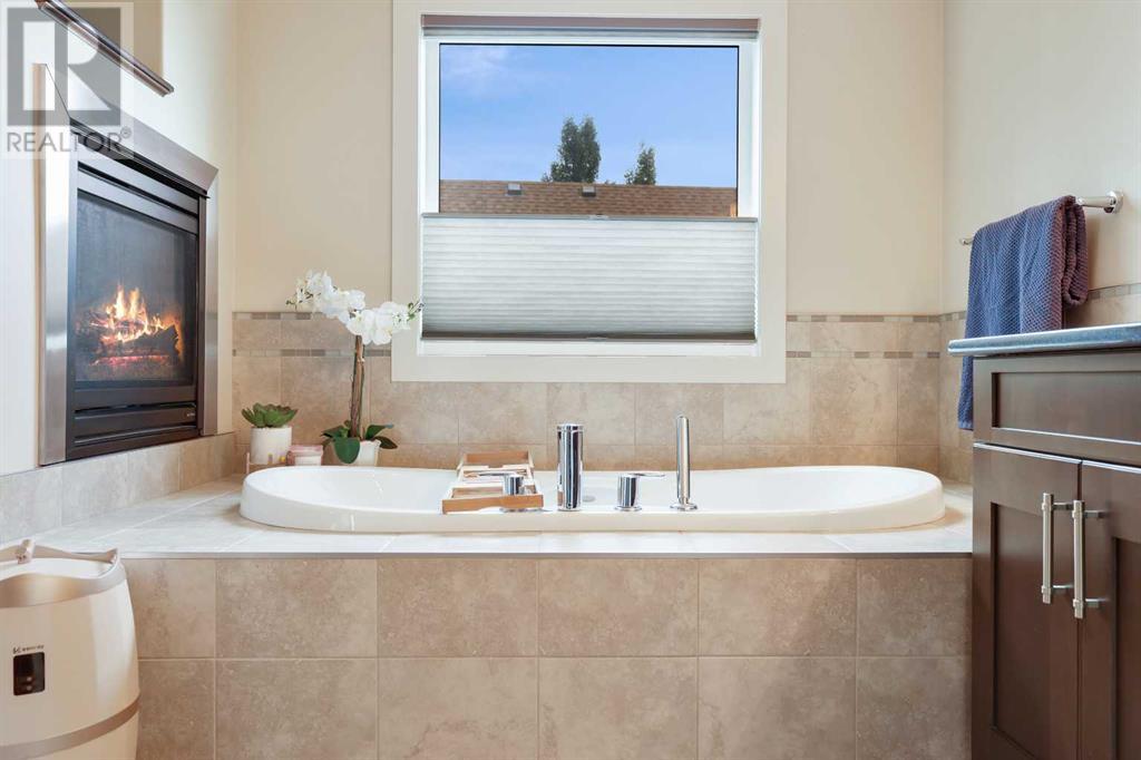 Custom-Built ALBI Executive Home | Stunning Corner Lot on a Quiet Cul-de-Sac | Over 2,620+ Sq Ft of Luxurious Living Space. Welcome to this meticulously designed and extensively upgraded ALBI-built executive home—a perfect blend of elegance, function, and comfort. Situated on a premium corner lot in a quiet cul-de-sac, this air-conditioned gem offers breathtaking west-facing views of mature trees and a serene pond backdrop on the side. From the moment you arrive, you'll be impressed by the home’s rich curb appeal: dramatic roof peaks, Hardie Board siding, a covered front verandah, stone-faced columns, and a 24' x 22' oversized double garage with wood-trimmed door and extended concrete driveway. Every detail has been thoughtfully designed for lasting beauty and performance. Step inside to discover over 2,620 sq ft of finely finished space with 9' ceilings, real hardwood flooring, oversized windows, and high-end finishes throughout. The heart of the home is the chef-inspired gourmet kitchen—complete with ceiling-height custom shaker cabinetry, granite countertops, a five-burner gas cooktop, stainless steel appliances, recessed lighting, and a walk-in pantry room. The large central island with a flush eating bar and undermount sink makes entertaining and everyday living a joy. A spacious breakfast nook offers captivating views and direct access to the upper 10' x 10' deck—ideal for summer barbecues and sunsets. Below, enjoy the lower 18' x 14' patio and hot tub for relaxing evenings with friends and family. The inviting main floor layout includes a generous family room with a stone-faced gas fireplace, custom wood mantel, an executive-style home office near the front entry, and an expansive open foyer—creating a welcoming space to gather and connect. Upstairs, you'll find three generously sized bedrooms, a shared walk-through laundry room with ample storage, and a bonus room perfect for a playroom, media zone, or cozy retreat. The primary bedroom suite is a true sanctu ary featuring large west-facing windows, a two-sided gas fireplace, and a custom walk-in closet. The stunning ensuite includes dual sinks, a deep soaker tub, a frameless glass shower, and a private powder room—designed for ultimate relaxation. This home is loaded with thoughtful upgrades and built-in conveniences, making it move-in ready for your family to enjoy this summer. Pride of ownership is evident in every corner, from the pristine finishes to the intelligent layout and serene location. Homes of this quality and location are rare—don’t miss out! Call your favourite REALTOR® today to schedule your private viewing! (id:53676)