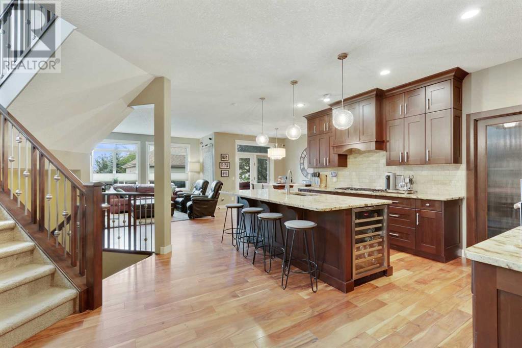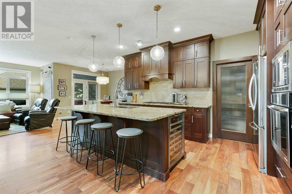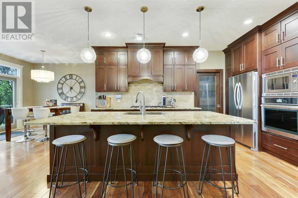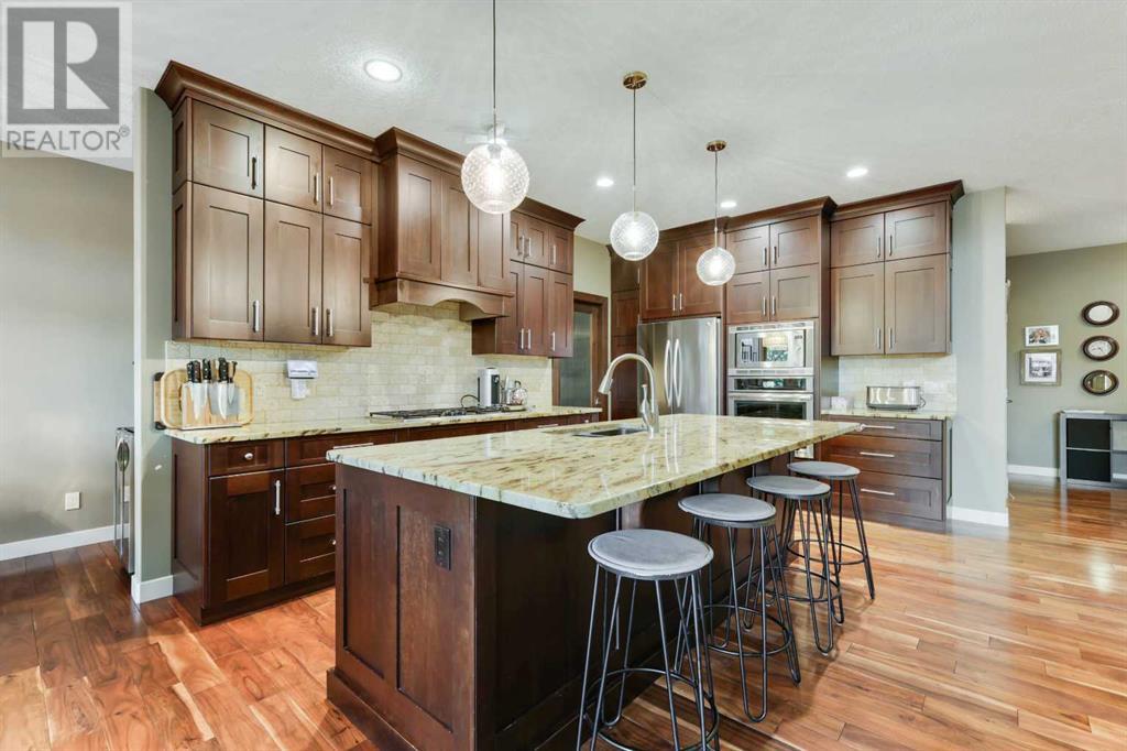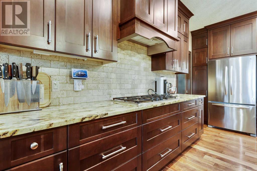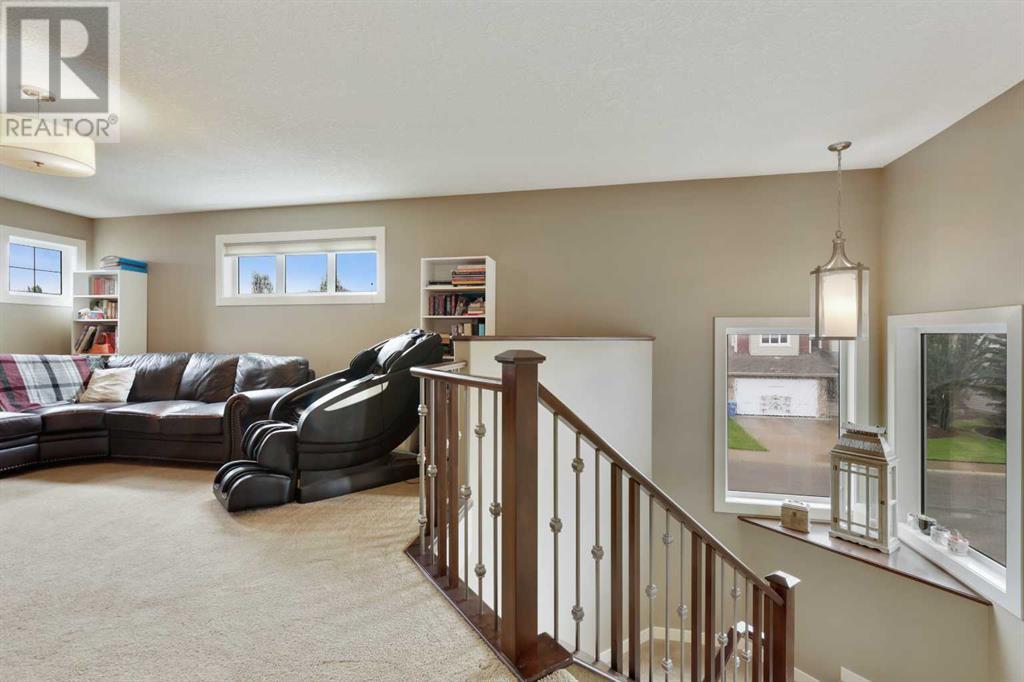 Custom-Built ALBI Executive Home | Stunning Corner Lot on a Quiet Cul-de-Sac | Over 2,620+ Sq Ft of Luxurious Living Space. Welcome to this meticulously designed and extensively upgraded ALBI-built executive home—a perfect blend of elegance, function, and comfort. Situated on a premium corner lot in a quiet cul-de-sac, this air-conditioned gem offers breathtaking west-facing views of mature trees and a serene pond backdrop on the side. From the moment you arrive, you'll be impressed by the home’s rich curb appeal: dramatic roof peaks, Hardie Board siding, a covered front verandah, stone-faced columns, and a 24' x 22' oversized double garage with wood-trimmed door and extended concrete driveway. Every detail has been thoughtfully designed for lasting beauty and performance. Step inside to discover over 2,620 sq ft of finely finished space with 9' ceilings, real hardwood flooring, oversized windows, and high-end finishes throughout. The heart of the home is the chef-inspired gourmet kitchen—complete with ceiling-height custom shaker cabinetry, granite countertops, a five-burner gas cooktop, stainless steel appliances, recessed lighting, and a walk-in pantry room. The large central island with a flush eating bar and undermount sink makes entertaining and everyday living a joy. A spacious breakfast nook offers captivating views and direct access to the upper 10' x 10' deck—ideal for summer barbecues and sunsets. Below, enjoy the lower 18' x 14' patio and hot tub for relaxing evenings with friends and family. The inviting main floor layout includes a generous family room with a stone-faced gas fireplace, custom wood mantel, an executive-style home office near the front entry, and an expansive open foyer—creating a welcoming space to gather and connect. Upstairs, you'll find three generously sized bedrooms, a shared walk-through laundry room with ample storage, and a bonus room perfect for a playroom, media zone, or cozy retreat. The primary bedroom suite is a true sanctu ary featuring large west-facing windows, a two-sided gas fireplace, and a custom walk-in closet. The stunning ensuite includes dual sinks, a deep soaker tub, a frameless glass shower, and a private powder room—designed for ultimate relaxation. This home is loaded with thoughtful upgrades and built-in conveniences, making it move-in ready for your family to enjoy this summer. Pride of ownership is evident in every corner, from the pristine finishes to the intelligent layout and serene location. Homes of this quality and location are rare—don’t miss out! Call your favourite REALTOR® today to schedule your private viewing! (id:53676)