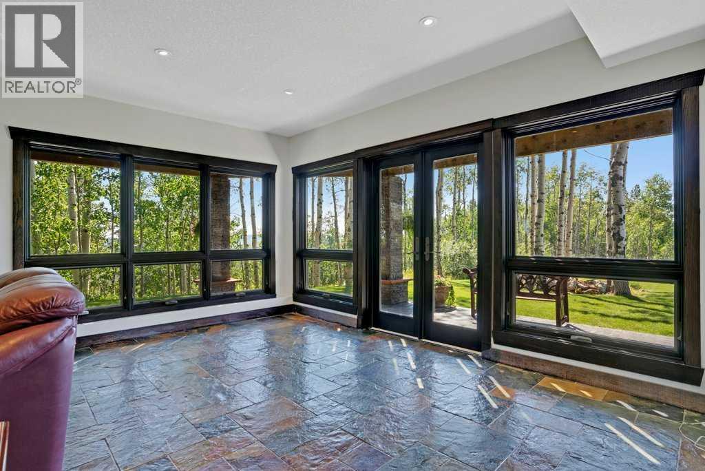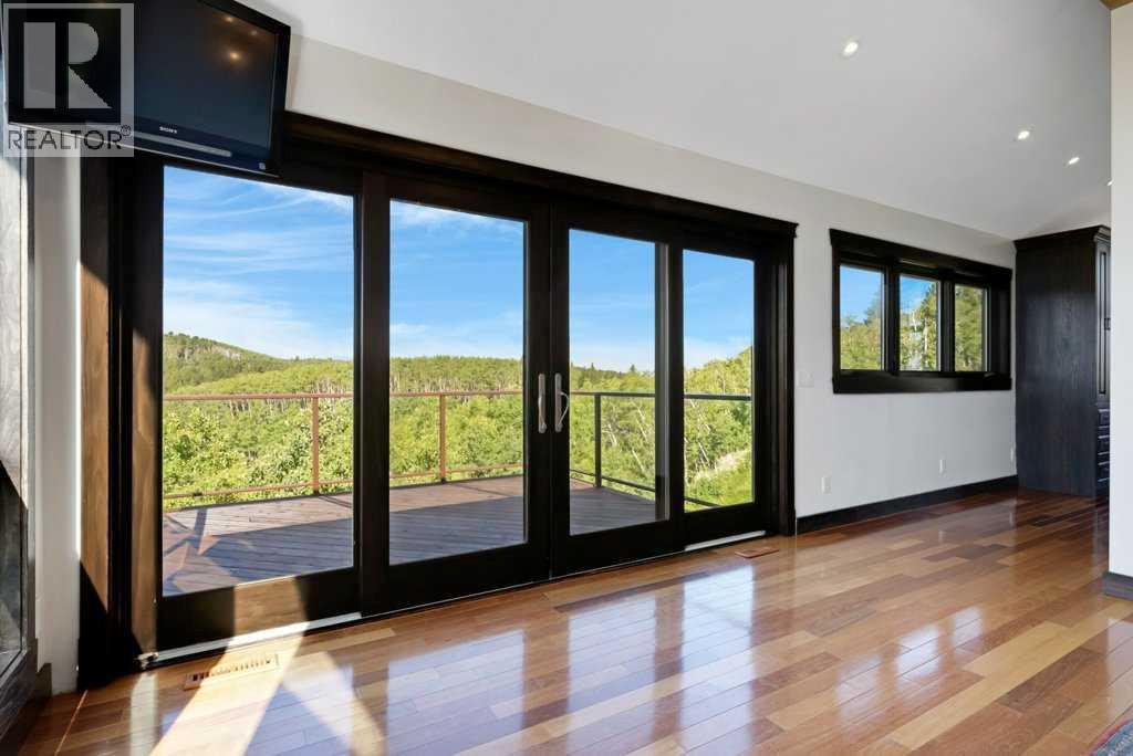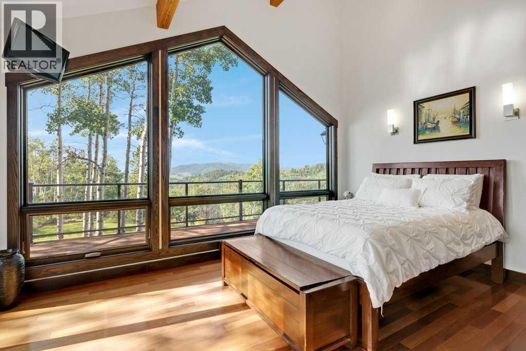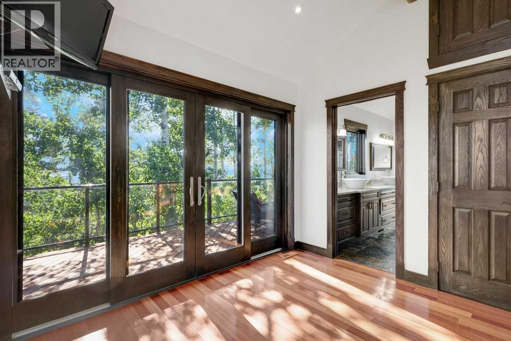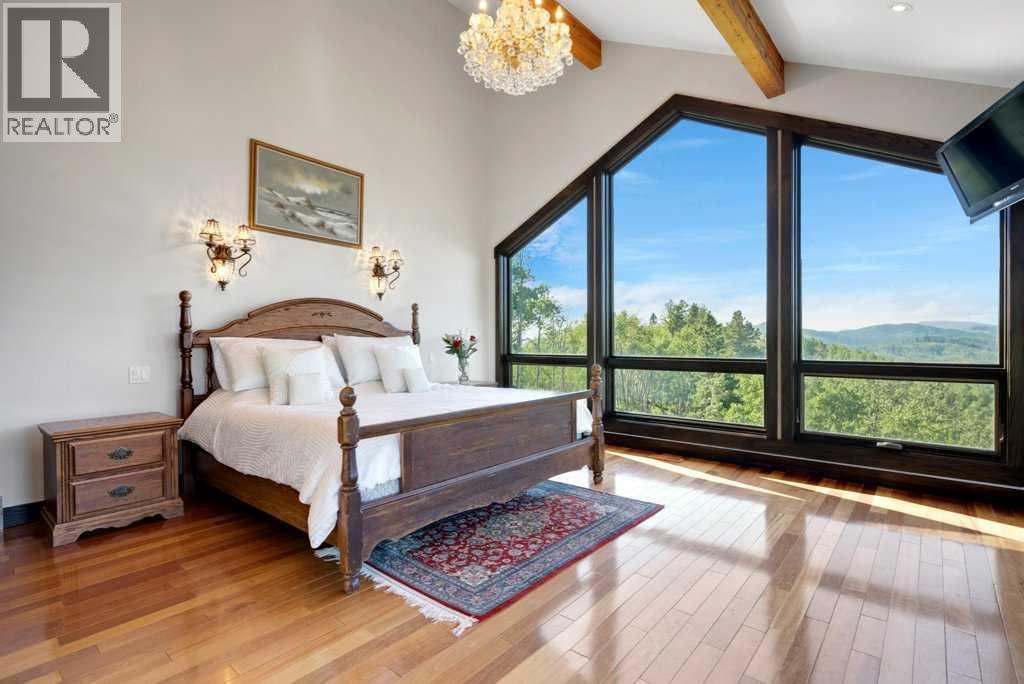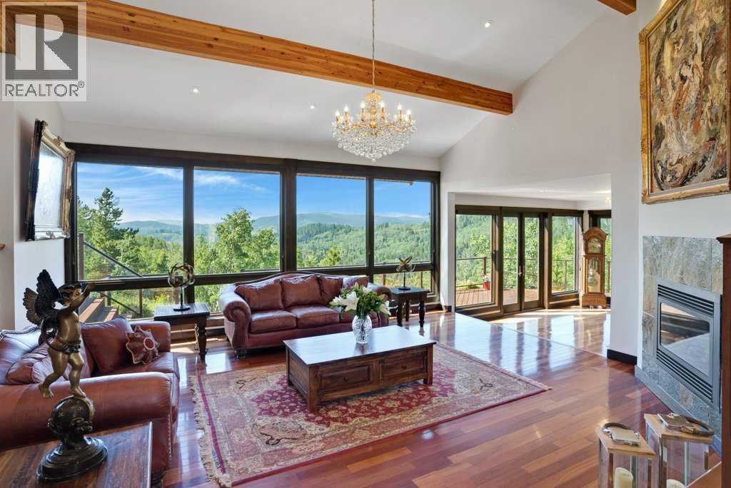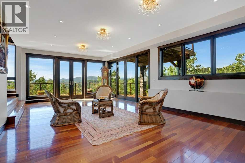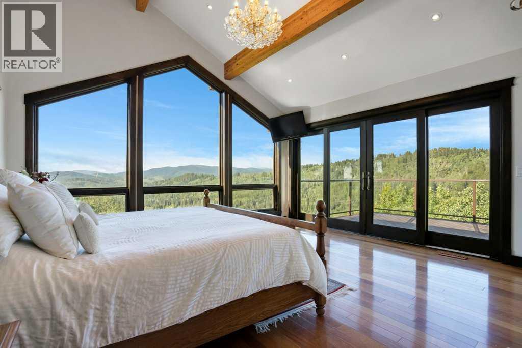 The Bragg Creek Trifecta: many properties have one of these three coveted things, but very few have it all! First, a beautiful home. Redesigned by award winning, internationally acclaimed designer, John Haddon, the 3968 sq. ft. of living space was taken down to the studs and rebuilt, inside and out, with the finest materials and craftsmanship. Second, incredible views of the mountains and forest. Given the seclusion and privacy, not a single curtain on any of the 55 windows impedes the breathtaking views afforded from every room. The third and most rare attribute of all, the thing that makes this “the hat trick”, is direct access to Kananaskis Country! That’s right, there is a private gate that connects to one of the most famous, beautiful, backcountry areas in Alberta, where you can hike or bike or ride for days. This home, sitting on 23 acres, is part of a small exclusive development of properties which span a ridge and directly border K-Country - the biggest backyard of all! Entering the home, the first thing you notice is the airy interior space, with cathedral ceilings and huge windows. The slate foyer gives way to Brazilian cherry hardwood floors, flowing throughout the balance of the home. Resisting the urge to immediately rush to the windows and deck system, to the left is the dining room and kitchen with quartz countertops and high-end appliances. Further on are two high-ceiling bedrooms, each with their own access to the wrap-around deck and connected by a large Jack and Jill 5-piece en suite. The upstairs is entirely devoted to the primary suite, which is unparalleled, with the huge windows and private deck all giving a new perspective to the vistas beyond. The 6-piece bathroom and walk-in closet complete this lofty sanctuary. The walk out lower level features a bar, exercise room, office area, expansive rec room with gas fireplace, 3-piece bath, and French doors to the walk-out patio and huge deck beyond. The property is completed by an insulated and dr ywalled triple car garage. You’re intrigued, I can tell, and further investigation is needed. Explore using our streaming video and 3-D tour; and then take the next step and make the Trifecta your own. (id:53676)