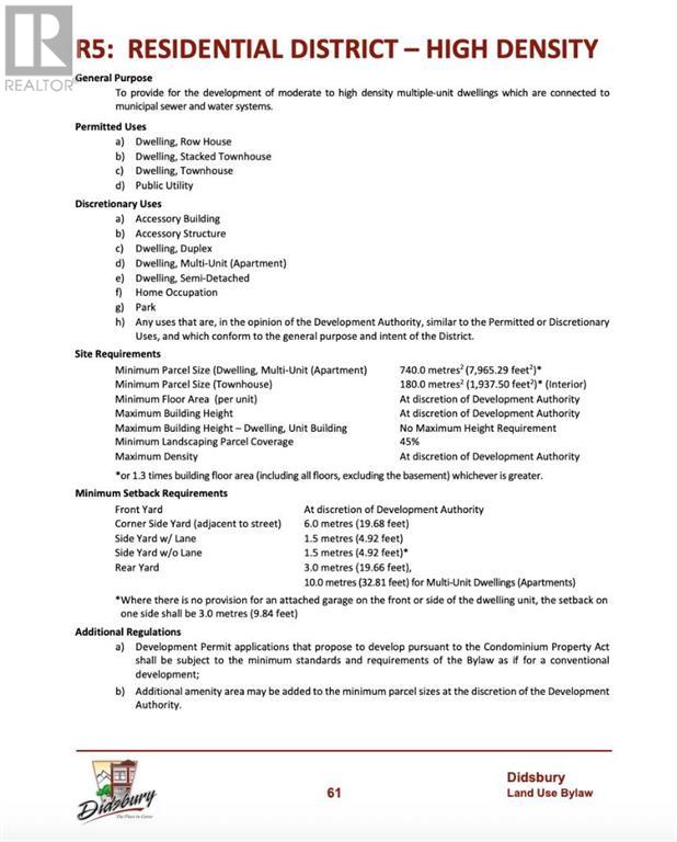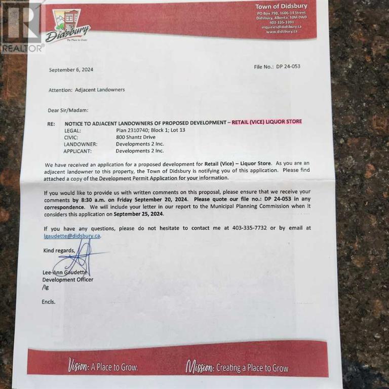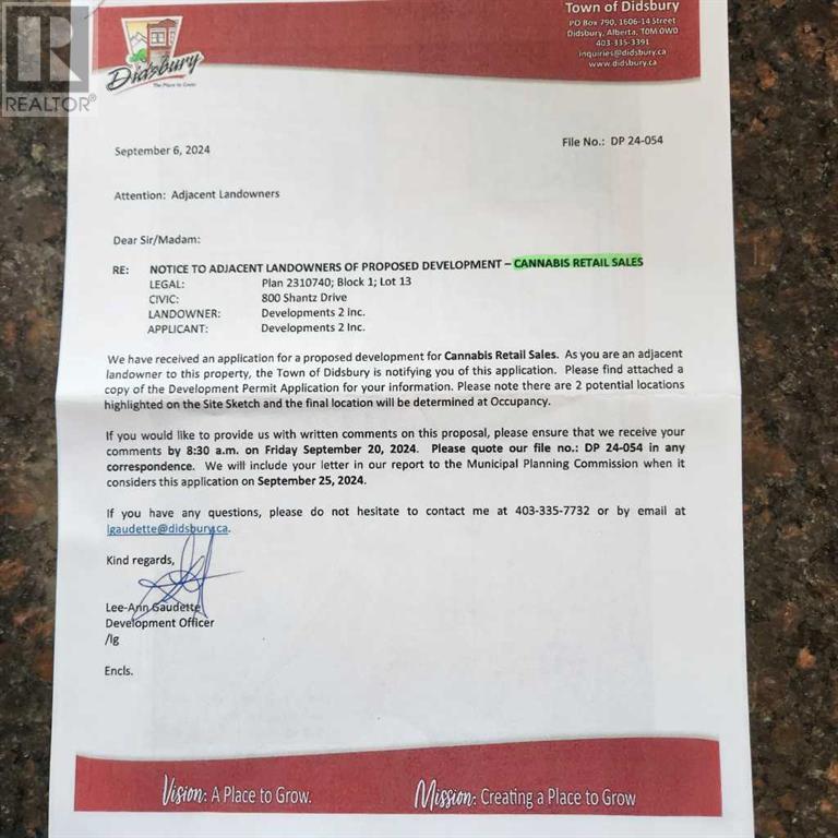 Three commercial lots for sale in Shantz Village Phase 2 totalling 5.98 Acres. Asking price is $299,000 per Acre. Lot 4 (400 Shantz Village 2024 tax: $8,340.00 | Size: 3.010 AC | LINC: 0035569277). Lot 5 (500 Shantz Village 2024 tax: $4,239.44 | Size: 1.530 AC | LINC: 0035569285) Lot 6 (600 Shantz Village 2024 tax: $3,990.09 | Size: 1.440 AC | LINC: 0035569293). Land Use: C-1 General Commercial. Anchored By Buy-Low Foods, Dollarama & Pet Valu. Retail stores, walking paths, mixed use commercial. Proposed LIquor store and Cannabis outlet. Didsbury is located just off of QEII Highway, approx 70 km from the Calgary International Airport, or 47 minutes drive. There is a 9-hole golf course, aquatic centre, two ice rinks, softball/baseball diamonds, parks and playgrounds. There is also a hospital, an RCMP detachment as well as the Olds-Didsbury Airport, primarily for small aircraft, general aviation, and a helipad for STARS air ambulance to land. (id:53676)