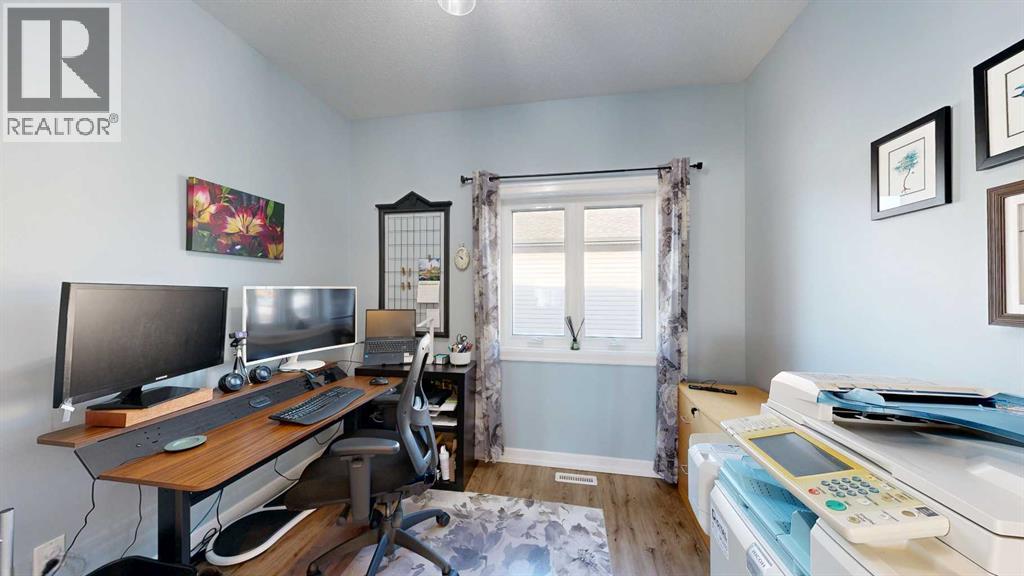 This impressive custom-built home offers a perfect balance of space, style, and functionality, ideally located in a desirable area of town with an open field to the south and beautiful greenspace behind. Thoughtful design, modern fixtures, and quality finishes create a contemporary yet welcoming living environment throughout. The bright and spacious front entry features convenient coat closets and sets the tone for the home’s light-filled interior, highlighted by warm wood-look flooring and neutral tones. The open-concept main living area seamlessly connects the kitchen, dining, and living spaces, making it ideal for both everyday living and entertaining. The kitchen is well appointed with dark wood cabinetry, stainless steel appliances including a double oven, a large island with sink, and a walk-through pantry with space for an additional fridge or freezer. The dining area offers abundant windows and patio door access to the back deck, while the living room is anchored by a beautiful gas fireplace. The primary bedroom is a true retreat, presenting a spa-inspired ensuite with freestanding tub, walk-in shower, and an organized walk-in closet. A home office with French doors is conveniently located on the main floor, along with a 2-piece bathroom, a laundry room with sink and front-load washer and dryer, and direct access to the attached garage. The staircase with wood handrail and metal balusters adds architectural interest and leads to the fully developed basement with 9’ ceilings. This open yet well-defined space features a wet bar with cabinetry, sink, and mini fridge, two additional bedrooms, and a bright 4-piece bathroom. Enjoy the comfort of air conditioning in this home and in-floor heat in the basement. The heated, oversized 24’ x 26’ garage provides excellent storage and workspace. Outside, enjoy a covered raised deck with panoramic countryside views, plus a lower ground-level deck with built-in planters—perfect for relaxing or entertaining. This immaculate home offers exceptional comfort, thoughtful design, and stunning surroundings. (id:53676)