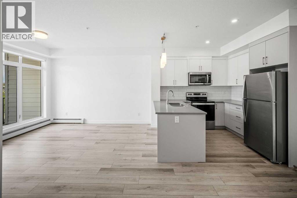 Welcome to this new upscale build in Springbank Hill! Immediate Possession! This very bright and open-concept 2 bedroom, 2 bath unit on the TOP FLOOR offers affordable luxury and convenient living near the Aspen Landing Shopping Centre, the new Aspen Village (being built) plus miles of walking paths and environmental reserves. Open floor plan features a peninsula kitchen with eating bar, high-quality cabinets, soft-close doors, under-mounted double sink, & Whirlpool stainless steel appliances. Full, private ensuite with double sinks off the main bedroom and a huge walk-in closet. Second bedroom with large window and easy access to second full bath and stacked washer/dryer with storage. Thoughtfully designed with expansive double pane windows, 9ft ceiling, warm coloured luxury vinyl plank flooring throughout, a spacious living /dining room, and bright windows and glass door to the balcony with BBQ gas line. The Orion Condos are bordered by a serene natural reserve with abundant walking trails and bike paths that connect throughout this vibrant and sought-after community. It comes with a titled underground parking stall with over-sized storage locker. Amenity room available. Amenities within walking distance include Safeway, Blush Lane, Royal Bank, TD, Starbucks, Cob's bread, Original Joe’s restaurant, Lady Bug Cafe and many more! Close to the 69 Street C-Train, Westside Rec Centre plus easy access downtown and to the mountains! Pets allowed. Fees include heat, water etc. (id:53676)