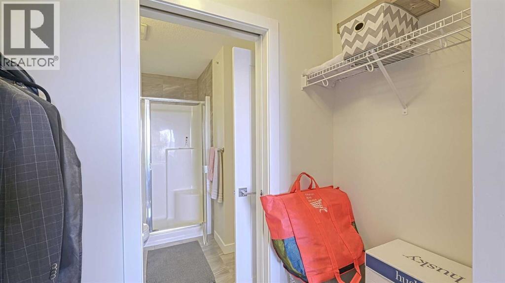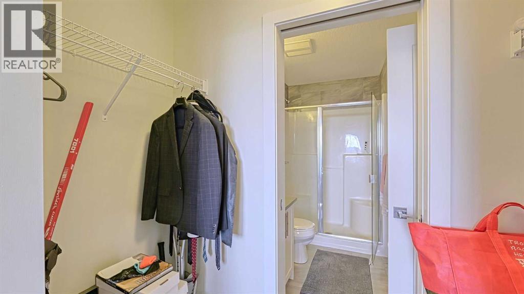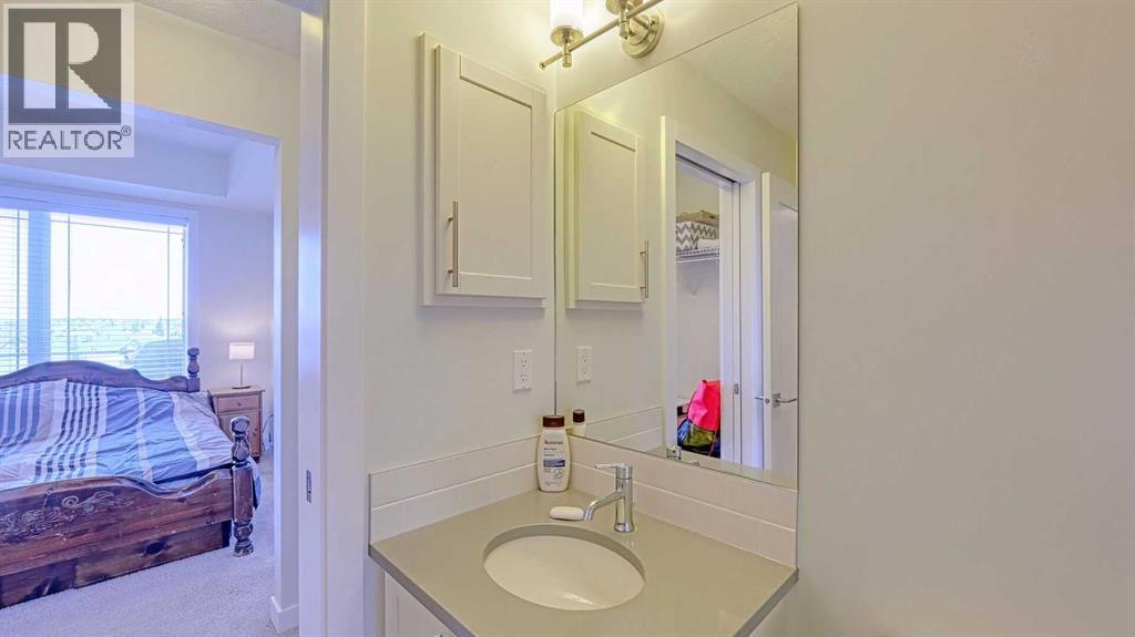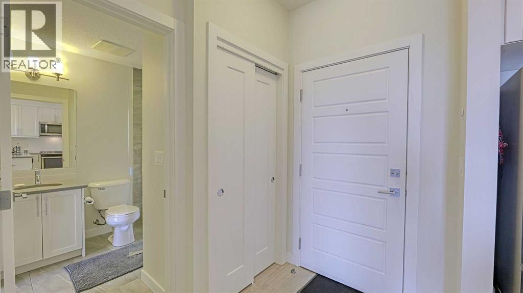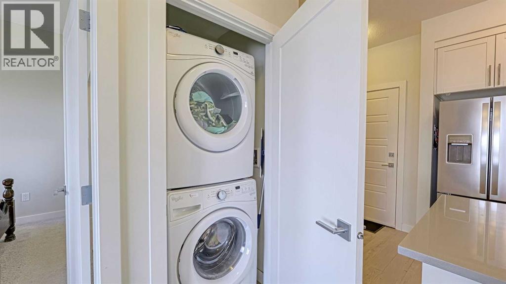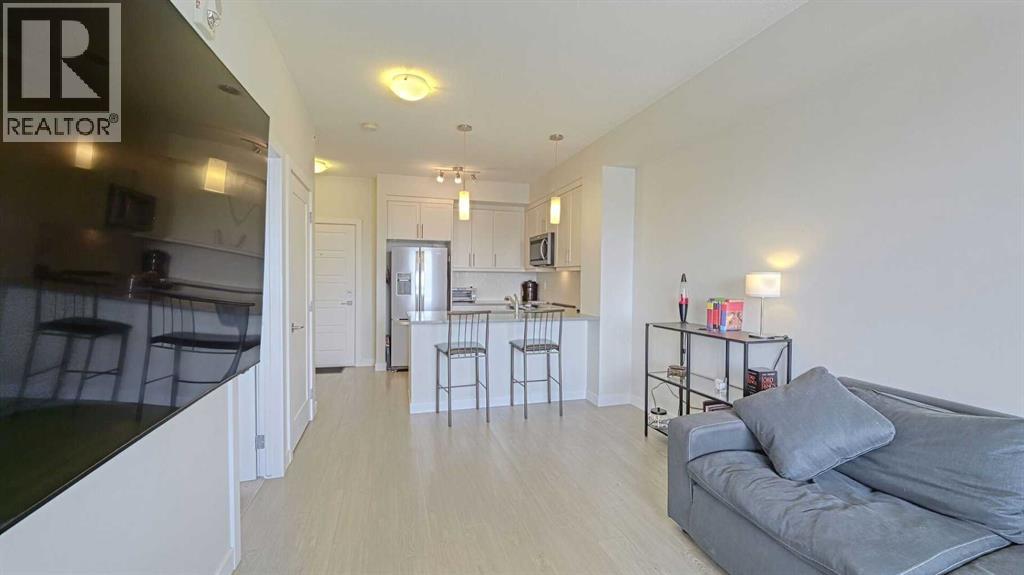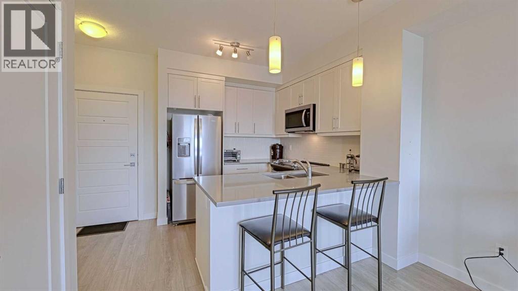 This lovely one bedroom – one bathroom home has everything you need. As you enter the unit, there is a coat closet and washer and dryer to your right. The kitchen to your left with quartz counters and stainless-steel appliances, opens to the dining/living area and has a breakfast bar too. Whilst enjoying the light from the large windows the unit has air conditioning for your comfort. The Bedroom has a walk- thru closet to give direct access to the 3-piece bathroom. Relax on your west-facing deck overlooking the green space below and with a gorgeous view of the mountains. Dinner is not an issue, as there is a gas hookup for your barbeque! To top everything off, there is an Underground parking stall and a storage cage in a secure area. Plus, the building has a bocce ball court and a common patio area that can be booked for your private use.Auburn Bay is an amazing community, with a 43-acre lake in a 13 acre park. A 7000sq ft. private residents facility and a 5 acre off-lease dog park! (id:53676)