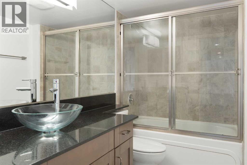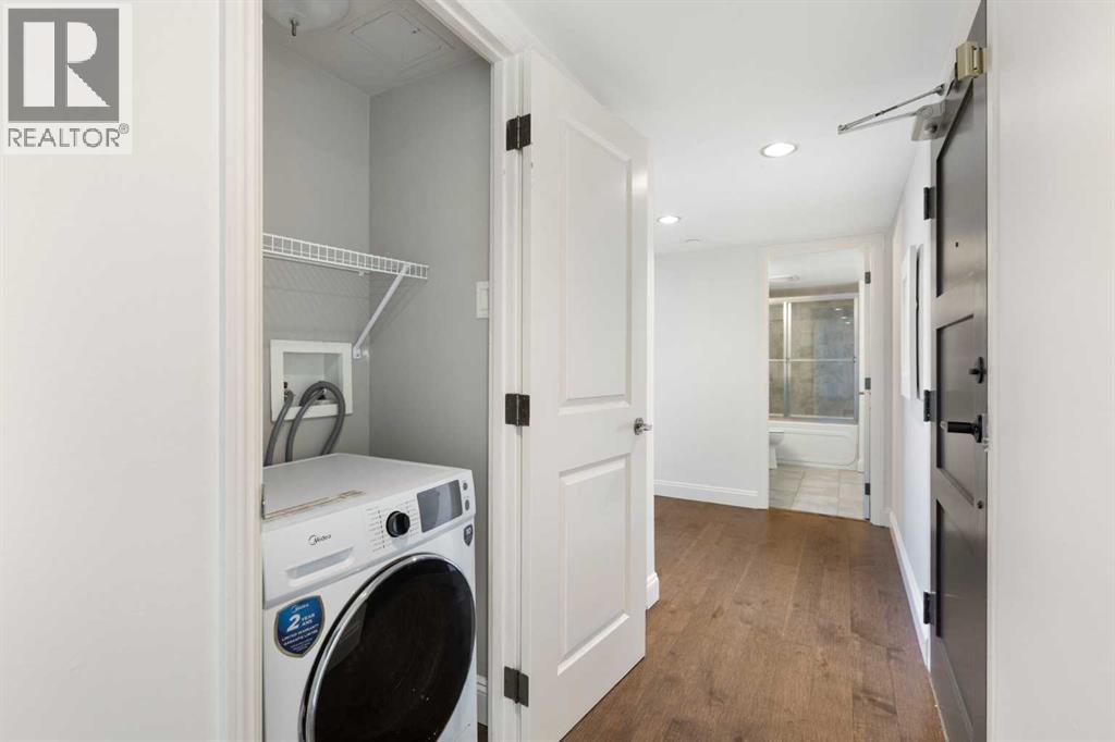 ELECTRICITY INCLUDED | STORAGE UNIT | GYM AND PARTY ROOM | WALK TO 17TH AVE | Centro 733 is a perfect location to enjoy the many nearby green spaces, walk to the bow river or pop over to trendy and vibrant 17th Ave for great food and entertainment. This 2-bedroom, 1 bathroom home offers an open floor plan featuring modern finishes such as hardwood floors, contemporary trim package, granite counter tops and stainless-steel appliances. In the kitchen you will enjoy stylish cabinetry with glass doors, an eat up bar and loads of storage for all your kitchen gadgets. The dining area allows for a dining table big enough for all your family gatherings. Both bedrooms are large enough for a queen bed. The bathroom boasts a large vanity, great for storage, a modern glass sink, tile surround in the shower with glass shower doors. This fabulous unit also comes with in suite laundry, a parking stall, gym, party room and the condo fees include electricity. (id:53676)