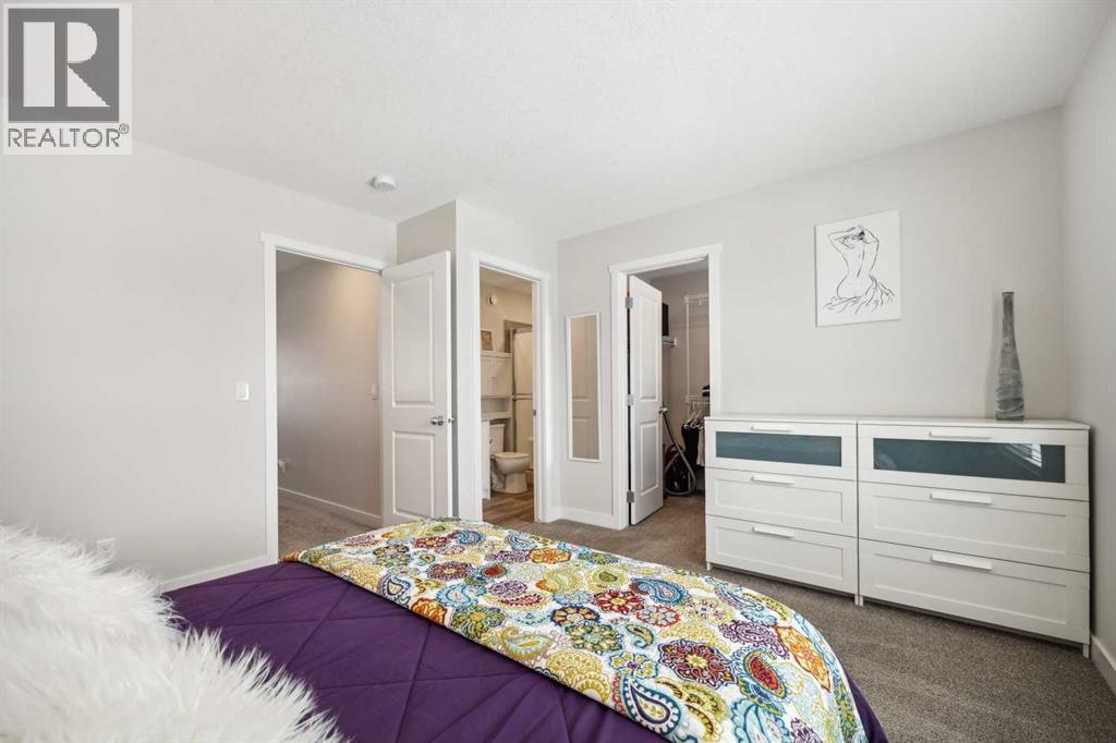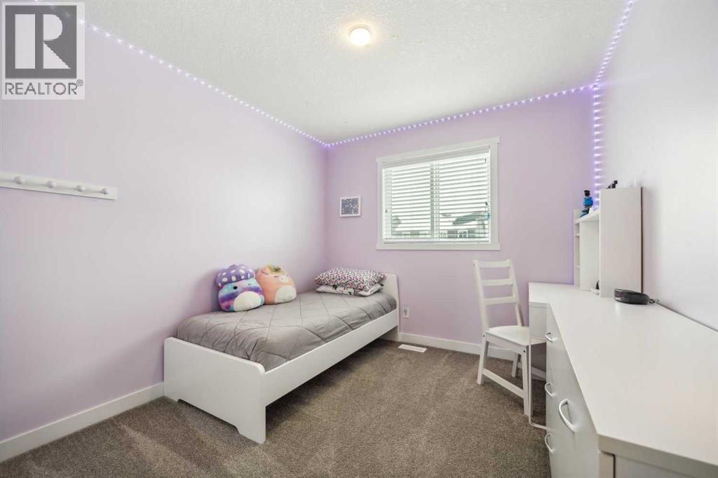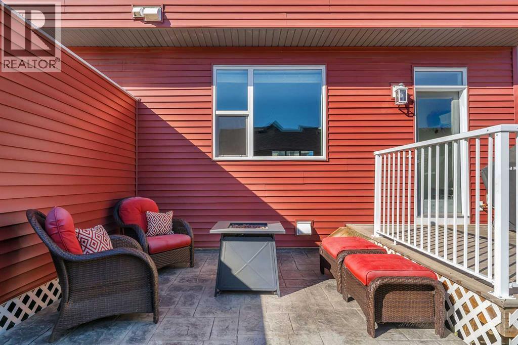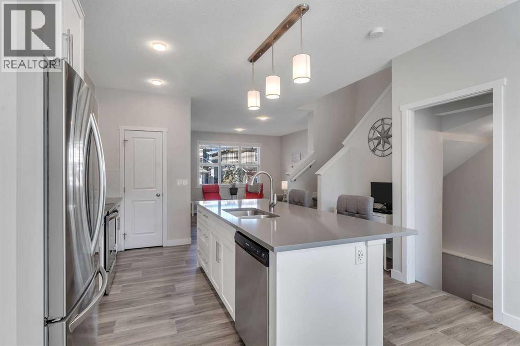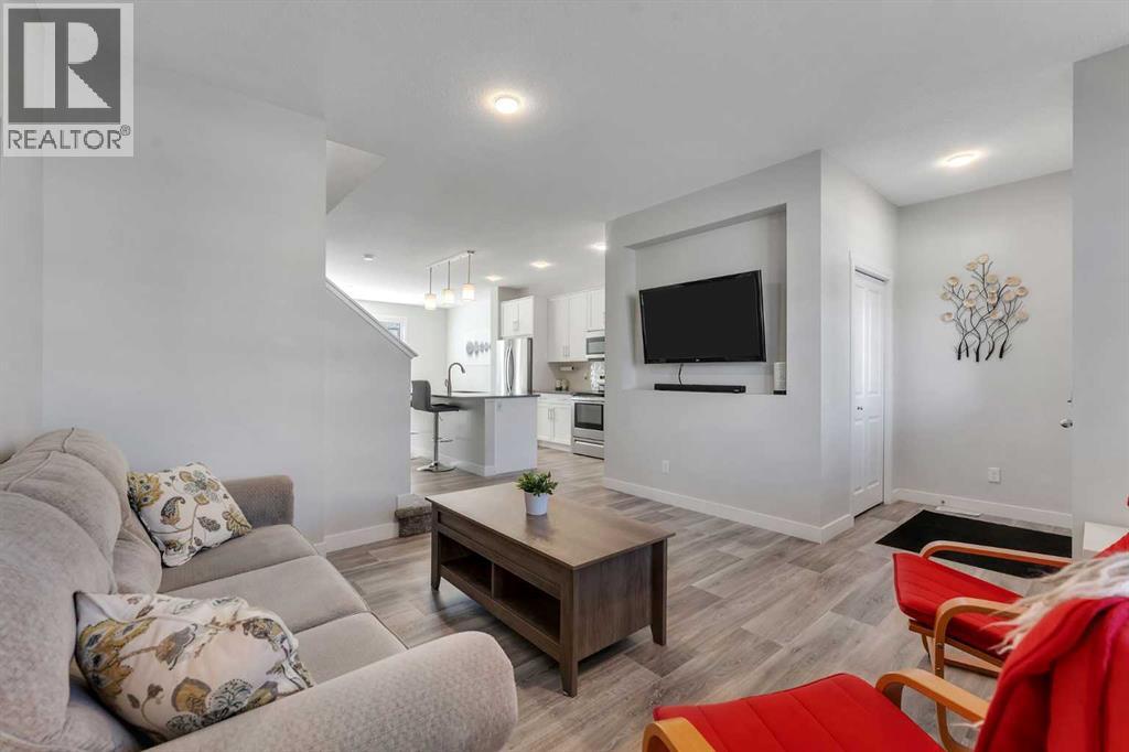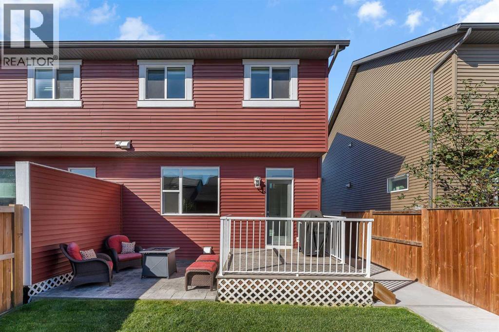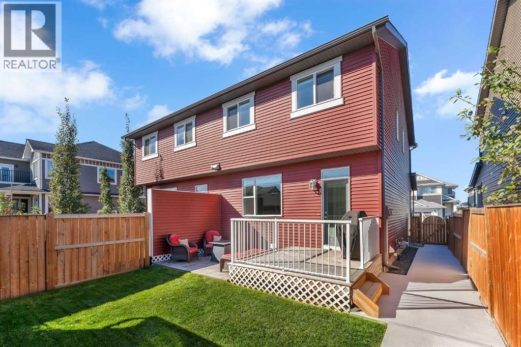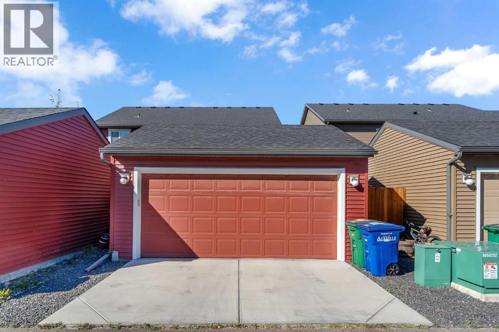 Whether you're looking to move up, downsize, or step into the market for the first time, this gorgeous duplex in the desirable community of King's Heights truly ticks all the boxes. Featuring a fully finished basement and over 2100 sq. ft. of developed living space, a beautifully landscaped private back yard, a sunny front porch, and a detached double garage, this home is move-in ready and has everything you need. As you step inside, you're greeted by a crisp, bright colour palette, beautiful laminate flooring, 9' ceilings, and an airy open floor plan. The spacious front living room flows seamlessly into the kitchen, which features ample white cabinetry, quartz countertops, sleek stainless steel appliances, and an adjacent dining area, perfect for entertaining. A convenient powder room, additional storage, and direct access to your private fenced backyard complement the main floor living space. Out back, a great deck and stamped concrete patio provide a wonderful place to relax and unwind. The addition of a poured concrete walkway to the double garage, along with a parking pad for extra parking, makes life even more convenient. Upstairs, the inviting primary suite features a walk-in closet and a private en-suite. Two additional bedrooms, a full four-piece bathroom, and the convenience of upper-floor laundry complete this level. The fully developed basement offers extra living space, featuring a recreation room, a fourth bedroom or home office, a full bathroom with heated floors, and ample storage. No need to worry about finishing it yourself, it's already done! This home has been lovingly maintained and is situated in the family-friendly community of King's Heights. You'll enjoy quick access to and from Airdrie, as well as nearby shopping, schools, parks, ponds, and scenic walking paths. It's a neighbourhood you'll be proud to call home. (id:53676)