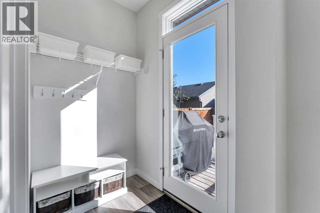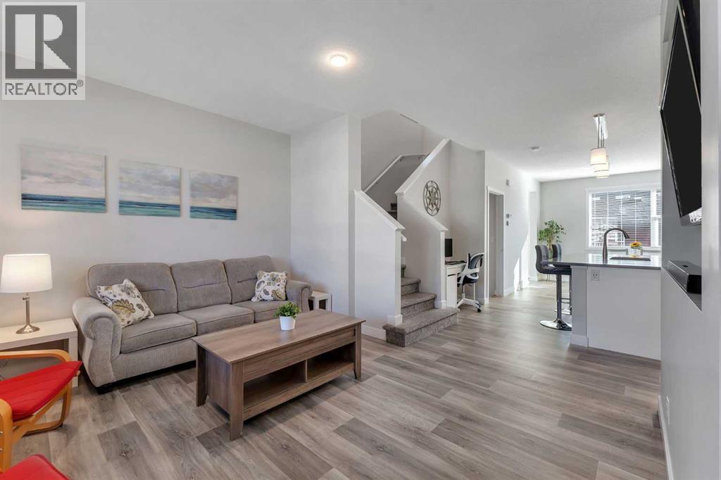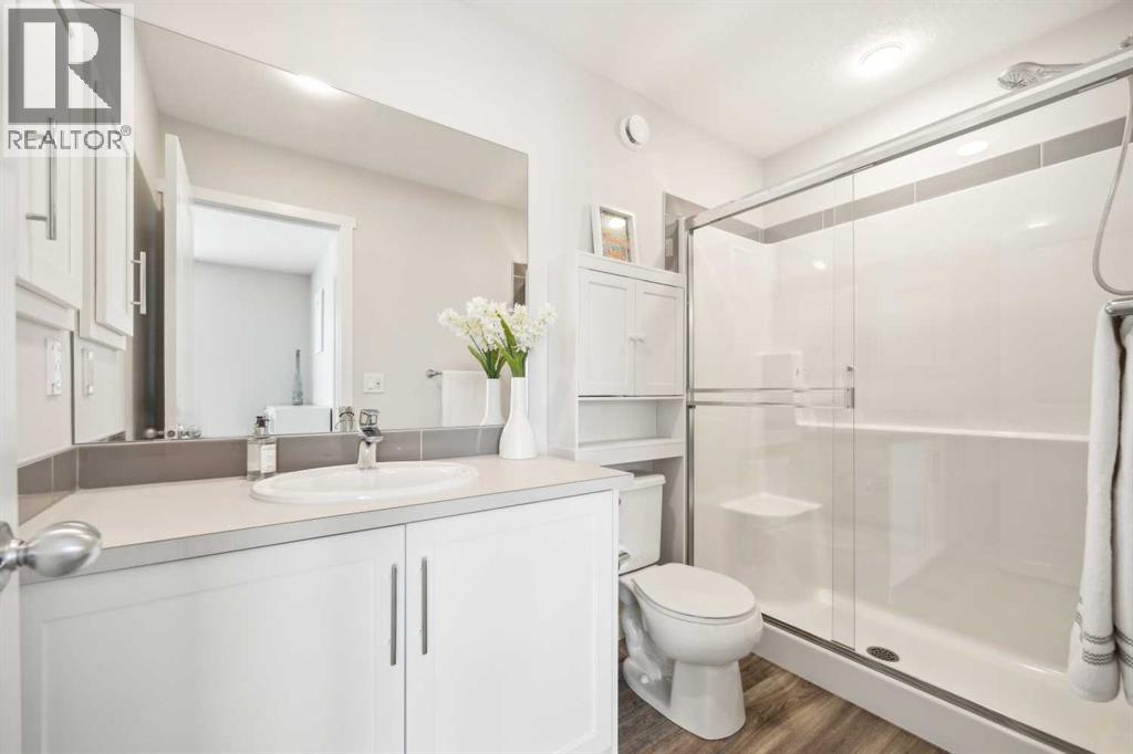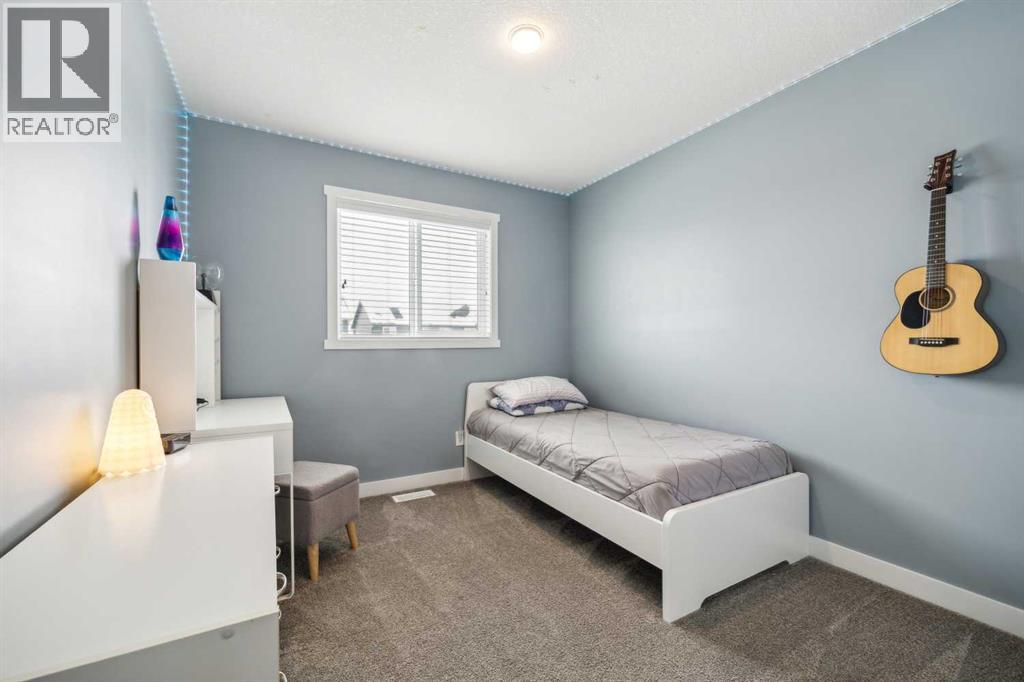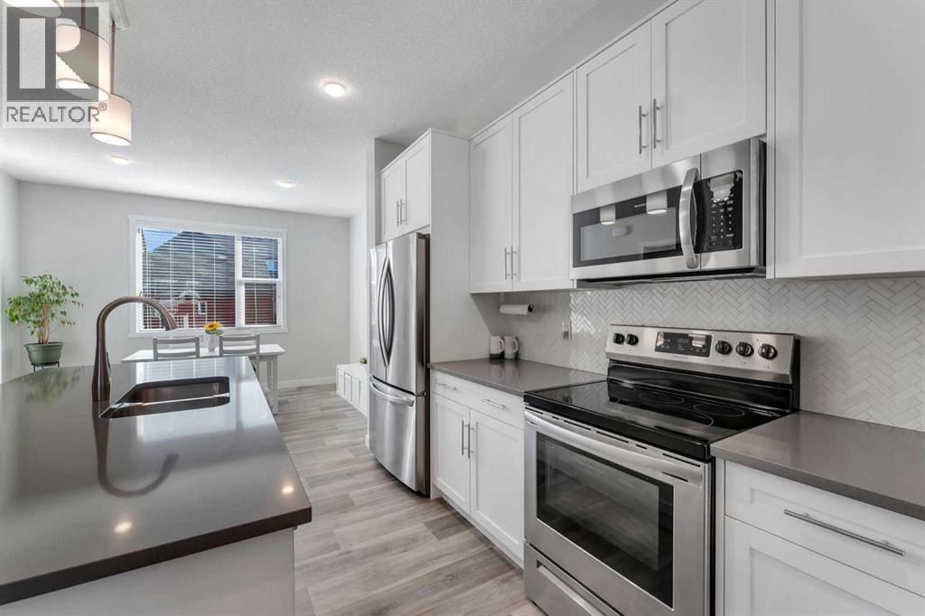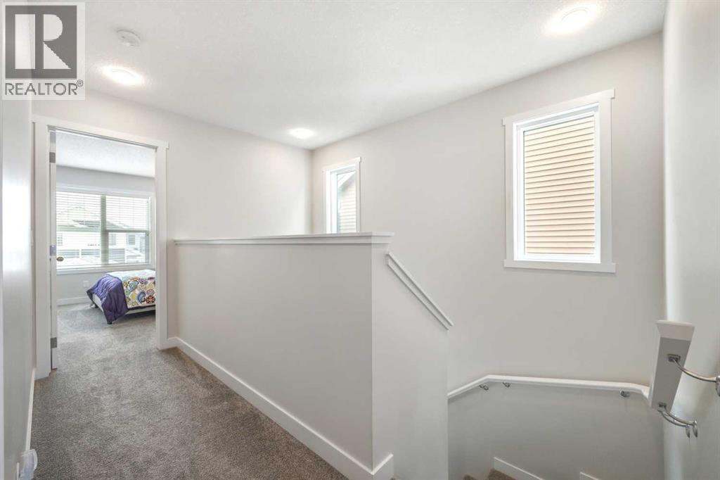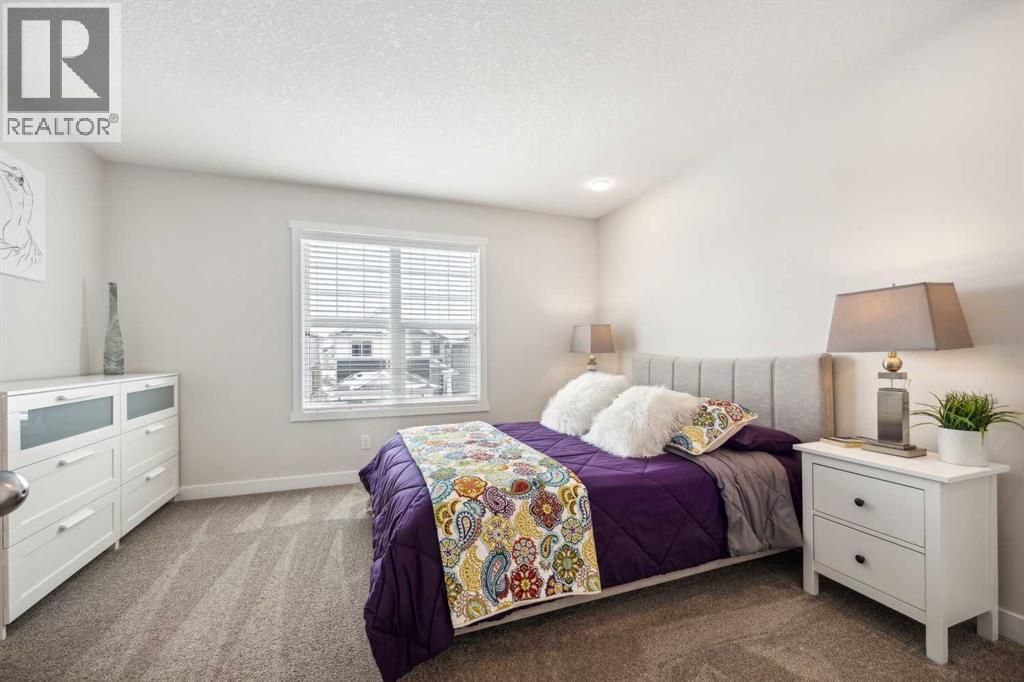 Whether you're looking to move up, downsize, or step into the market for the first time, this gorgeous duplex in the desirable community of King's Heights truly ticks all the boxes. Featuring a fully finished basement and over 2100 sq. ft. of developed living space, a beautifully landscaped private back yard, a sunny front porch, and a detached double garage, this home is move-in ready and has everything you need. As you step inside, you're greeted by a crisp, bright colour palette, beautiful laminate flooring, 9' ceilings, and an airy open floor plan. The spacious front living room flows seamlessly into the kitchen, which features ample white cabinetry, quartz countertops, sleek stainless steel appliances, and an adjacent dining area, perfect for entertaining. A convenient powder room, additional storage, and direct access to your private fenced backyard complement the main floor living space. Out back, a great deck and stamped concrete patio provide a wonderful place to relax and unwind. The addition of a poured concrete walkway to the double garage, along with a parking pad for extra parking, makes life even more convenient. Upstairs, the inviting primary suite features a walk-in closet and a private en-suite. Two additional bedrooms, a full four-piece bathroom, and the convenience of upper-floor laundry complete this level. The fully developed basement offers extra living space, featuring a recreation room, a fourth bedroom or home office, a full bathroom with heated floors, and ample storage. No need to worry about finishing it yourself, it's already done! This home has been lovingly maintained and is situated in the family-friendly community of King's Heights. You'll enjoy quick access to and from Airdrie, as well as nearby shopping, schools, parks, ponds, and scenic walking paths. It's a neighbourhood you'll be proud to call home. (id:53676)
