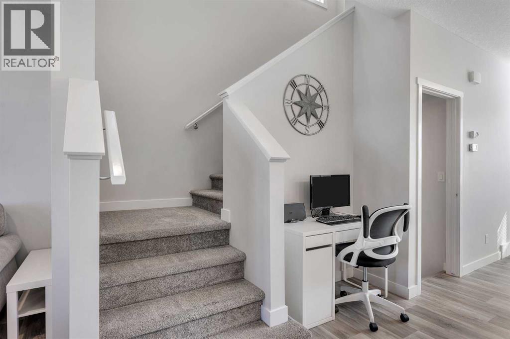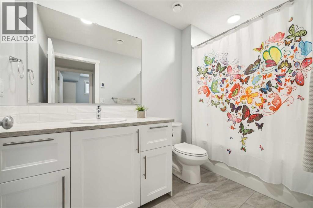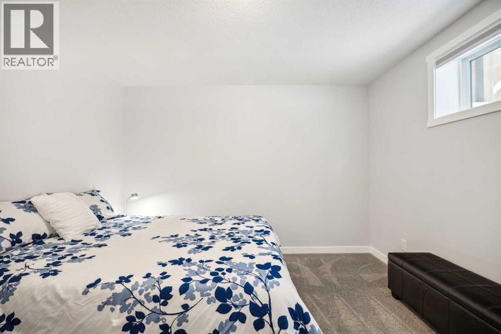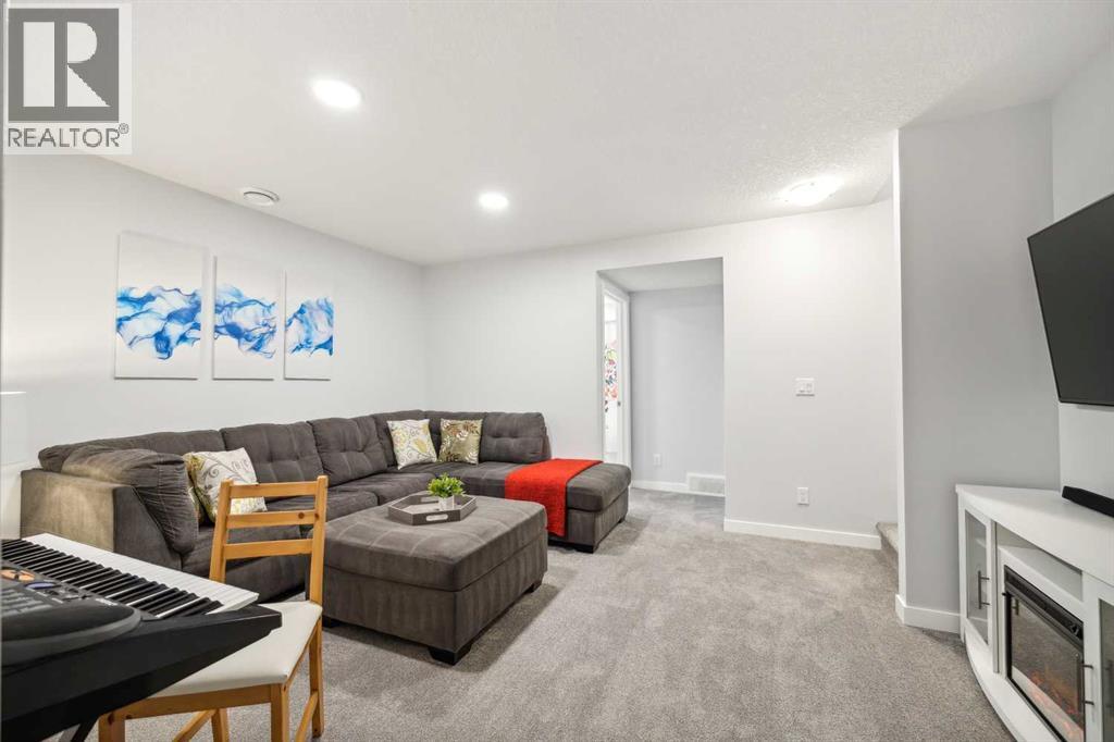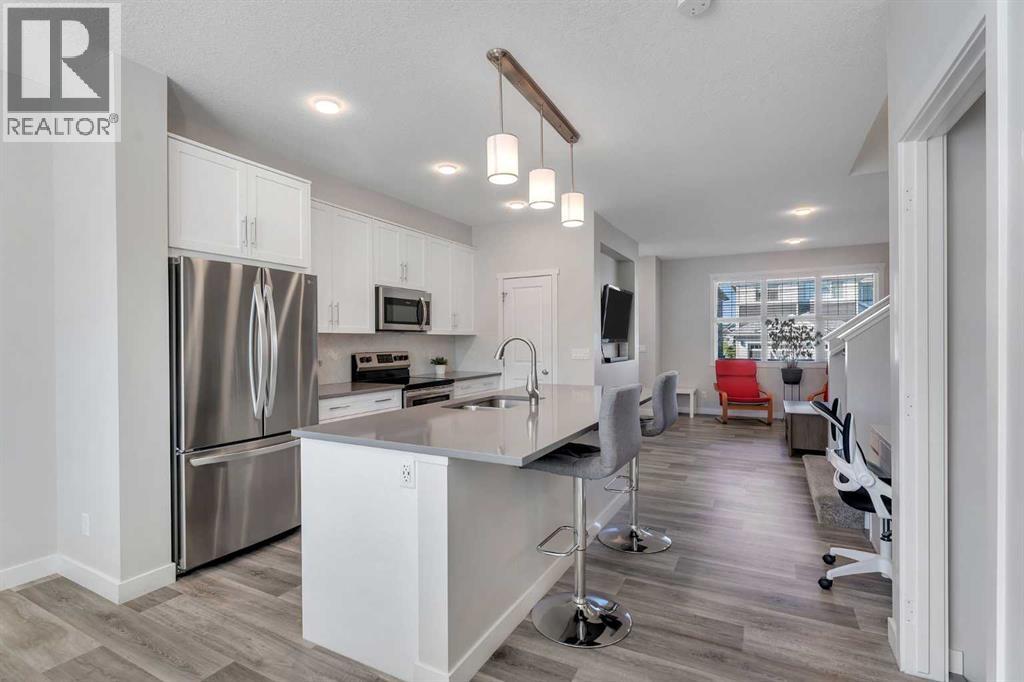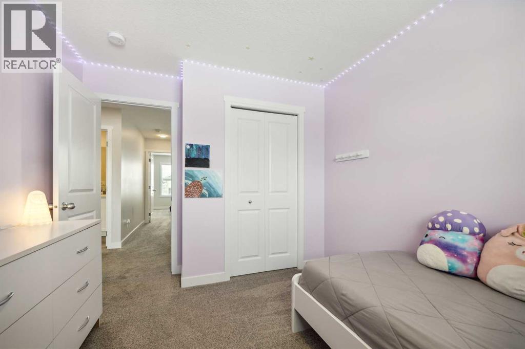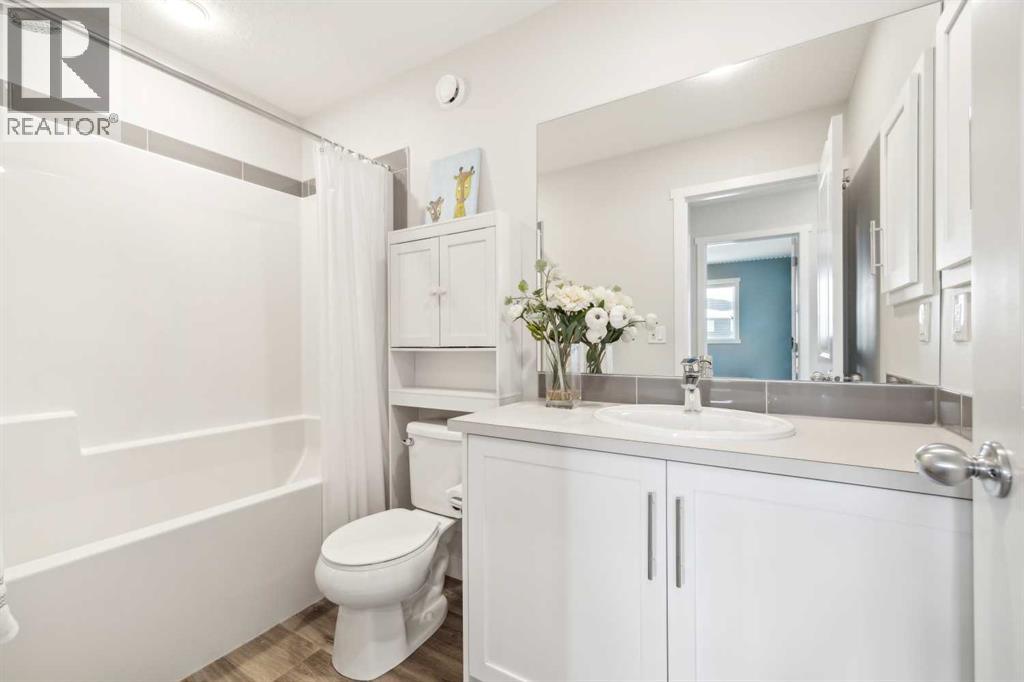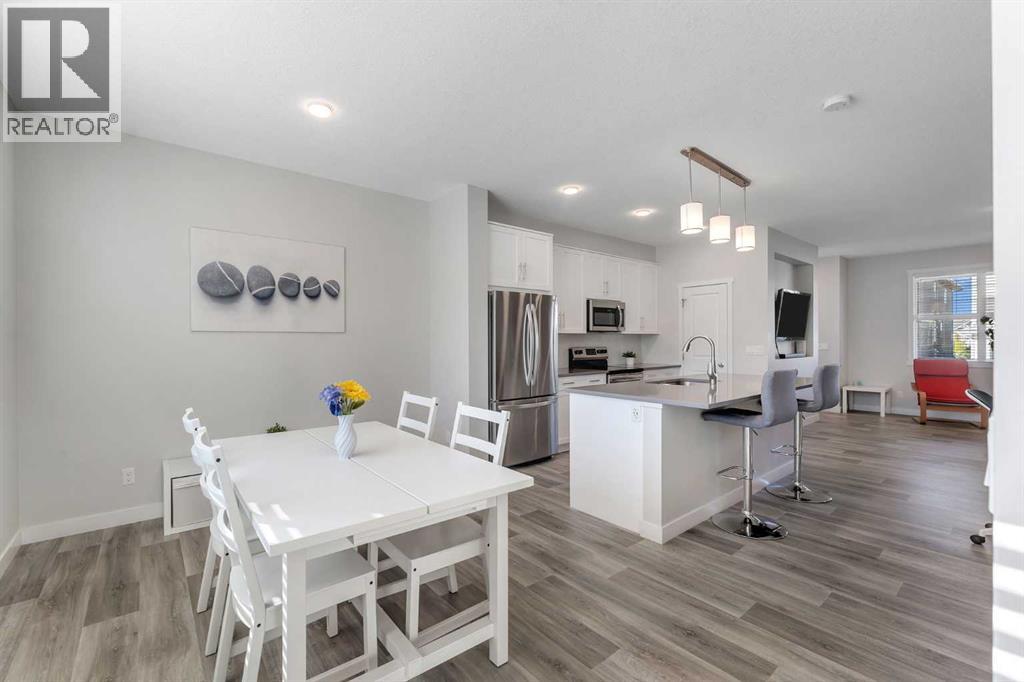 Whether you're looking to move up, downsize, or step into the market for the first time, this gorgeous duplex in the desirable community of King's Heights truly ticks all the boxes. Featuring a fully finished basement and over 2100 sq. ft. of developed living space, a beautifully landscaped private back yard, a sunny front porch, and a detached double garage, this home is move-in ready and has everything you need. As you step inside, you're greeted by a crisp, bright colour palette, beautiful laminate flooring, 9' ceilings, and an airy open floor plan. The spacious front living room flows seamlessly into the kitchen, which features ample white cabinetry, quartz countertops, sleek stainless steel appliances, and an adjacent dining area, perfect for entertaining. A convenient powder room, additional storage, and direct access to your private fenced backyard complement the main floor living space. Out back, a great deck and stamped concrete patio provide a wonderful place to relax and unwind. The addition of a poured concrete walkway to the double garage, along with a parking pad for extra parking, makes life even more convenient. Upstairs, the inviting primary suite features a walk-in closet and a private en-suite. Two additional bedrooms, a full four-piece bathroom, and the convenience of upper-floor laundry complete this level. The fully developed basement offers extra living space, featuring a recreation room, a fourth bedroom or home office, a full bathroom with heated floors, and ample storage. No need to worry about finishing it yourself, it's already done! This home has been lovingly maintained and is situated in the family-friendly community of King's Heights. You'll enjoy quick access to and from Airdrie, as well as nearby shopping, schools, parks, ponds, and scenic walking paths. It's a neighbourhood you'll be proud to call home. (id:53676)