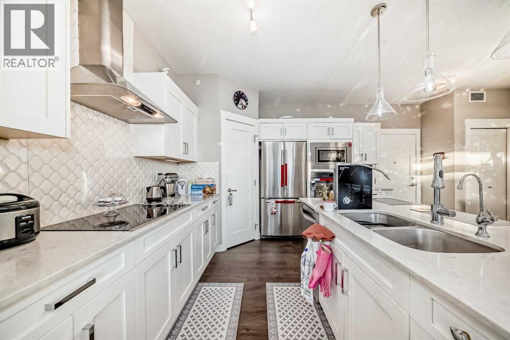 Step into this STUNNING 2 BEDROOM 2 BATH TOP UNIT APARTMENT, where every detail exudes luxury and comfort. The open floor plan sets a welcoming tone, offering a perfect blend of ELEGANCE & CONVENIENCE. The COZY & SPACIOUS GOURMET KITCHEN featuring upgraded stainless steel appliances, including a BUILT-IN OVEN & MICROWAVE, ELECTRIC COOKTOP and a huge PANTRY. The LARGE QUARTZ ISLAND provides ample space for meal preparation and hosting get-togethers. Natural light floods the space, accentuating the wrap-around balcony that showcases stunning views, ideal for watching the sunsets. This unit includes a titled parking stall and assigned storage. Conveniently located near shopping, dining, and parks, this apartment offers a lifestyle of comfort and convenience. Don't miss this opportunity to make this apartment your new home. (id:53676)