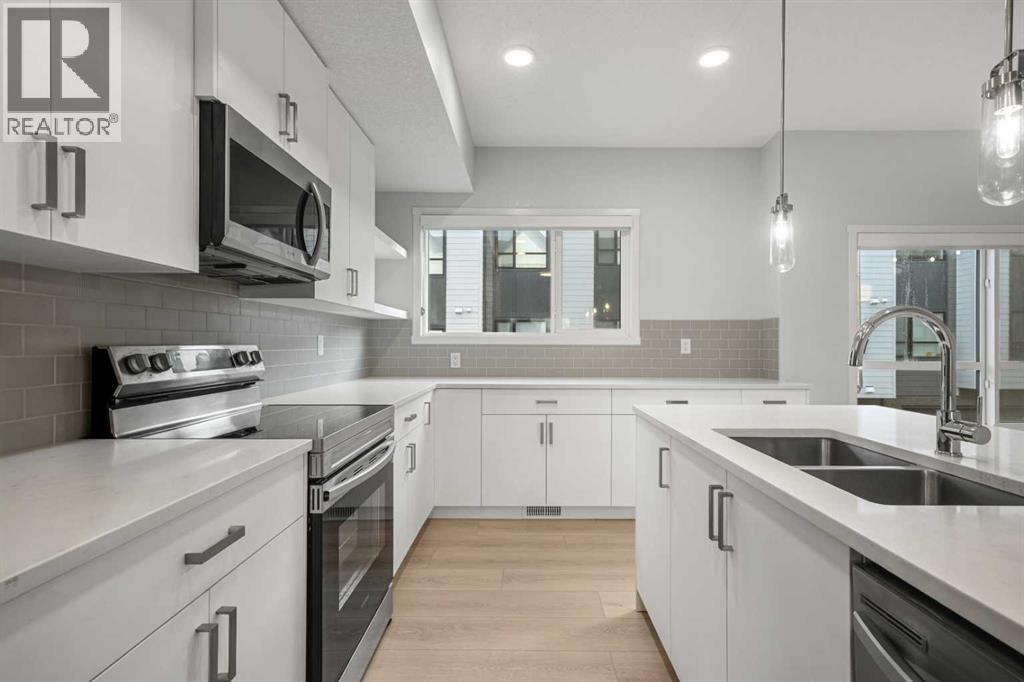 Welcome to Seton Serenity, an exceptional residence in one of Calgary’s most coveted communities, masterfully crafted by the award-winning CedarGlen Living. Offering nearly 1,748.55 sqft of refined living space, this exquisite 3-bedroom, 2.5-bathroom home blends timeless sophistication with modern comfort. Soaring 9' ceilings, expansive windows, and luxury vinyl plank flooring set the stage for an airy, light-filled interior. The north-facing balcony frames captivating views of the tranquil wet pond, creating a seamless connection between indoor comfort and outdoor serenity. The chef-inspired kitchen is nothing short of spectacular, featuring chic white cabinetry, gleaming quartz countertops, a designer subway tile backsplash, premium stainless-steel appliances, and an expansive island with seating—perfect for both intimate dinners and lavish entertaining. Flowing effortlessly into the dining area and spacious living room, the open layout invites gatherings with an air of refinement. The upper level is crowned by the sumptuous primary suite, a private retreat with a large walk-in closet and a spa-like 4-piece ensuite adorned with dual vanities, quartz counters, and an oversized glass-enclosed shower. Two additional bedrooms provide versatile space for children and guests, accompanied by a beautifully appointed 4-piece bath and the convenience of upper-level laundry. The lower level features a large space that can accommodate a home office or gym, while the attached double side-by-side garage offers security and ease. Just steps away, indulge in world-class amenities including the largest YMCA in North America, the renowned South Health Campus, boutique shopping, gourmet dining, and vibrant cafés. This is more than a home—it is a statement of luxury, comfort, and lifestyle in the heart of Seton. (id:53676)