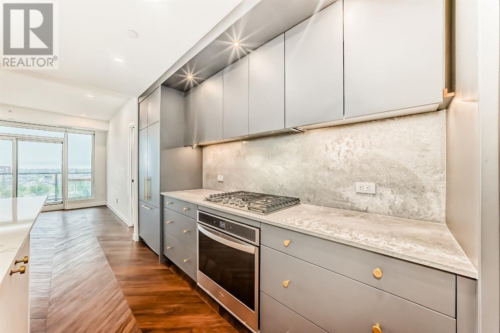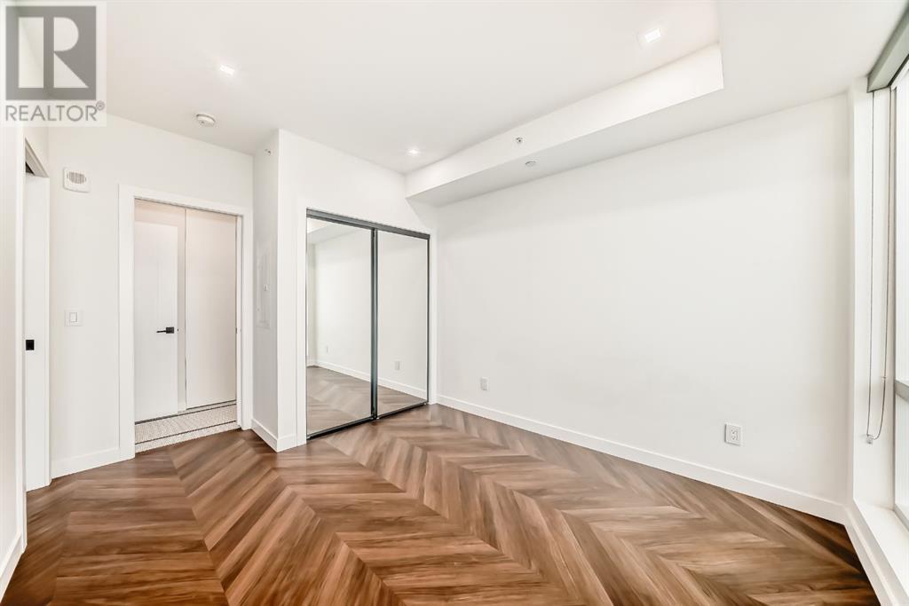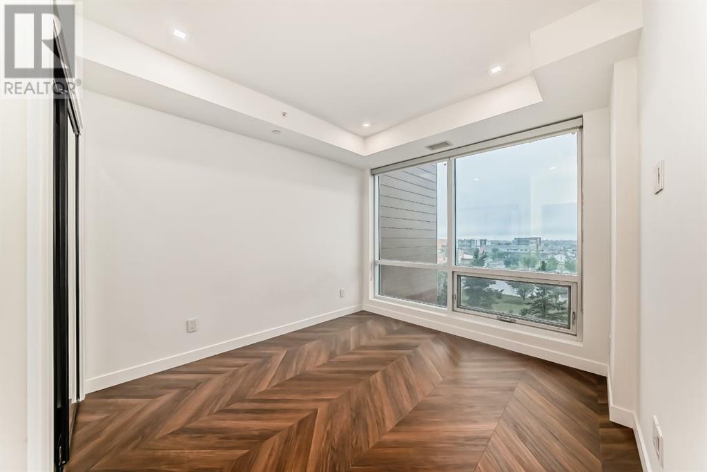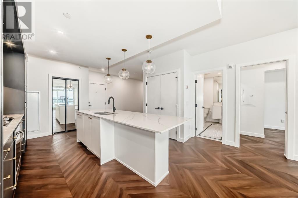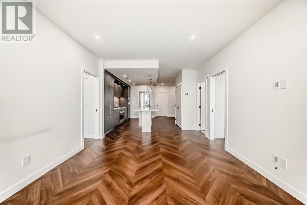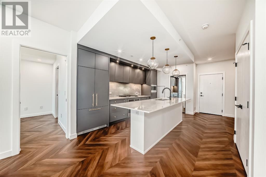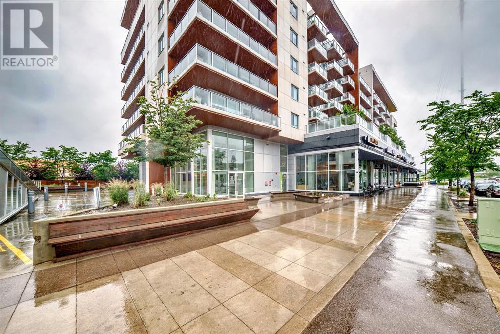 Step into this stunning 2-bedroom, 2-bathroom plus den condo that perfectly blends modern luxury with everyday comfort. Featuring 9-ft ceilings, floor-to-ceiling windows, and stylish herringbone flooring, this bright and open space includes a gourmet kitchen with quartz countertops, full-height soft-close cabinetry, LED lighting, and premium appliances. The spacious primary bedroom boasts a walk-in closet and a 4-piece ensuite, while the second bedroom is paired with a sleek 3-piece bath. Enjoy the convenience of in-suite laundry, a private balcony, and access to amenities like concierge service, a social lounge, bike storage, and vibrant ground-floor retailers. Located just 15 minutes from downtown and 5 minutes from WinSport, with easy access to major roads, this home offers the perfect balance of urban living and outdoor lifestyle. (id:53676)
