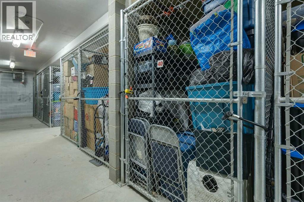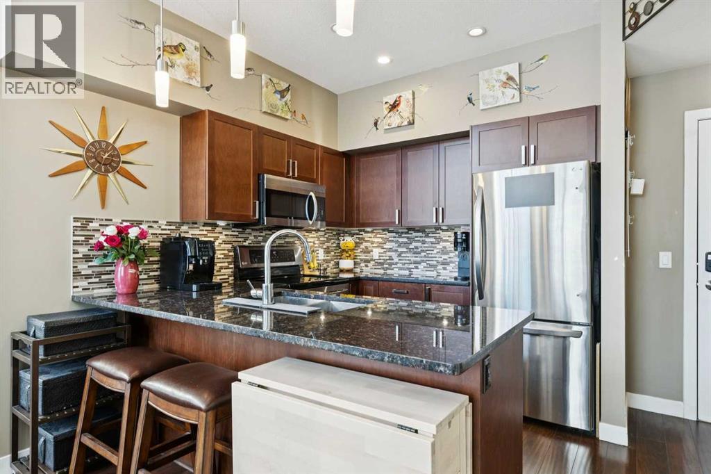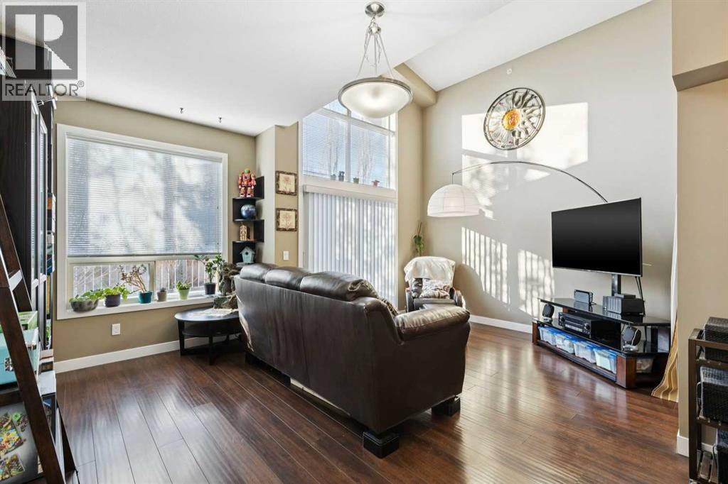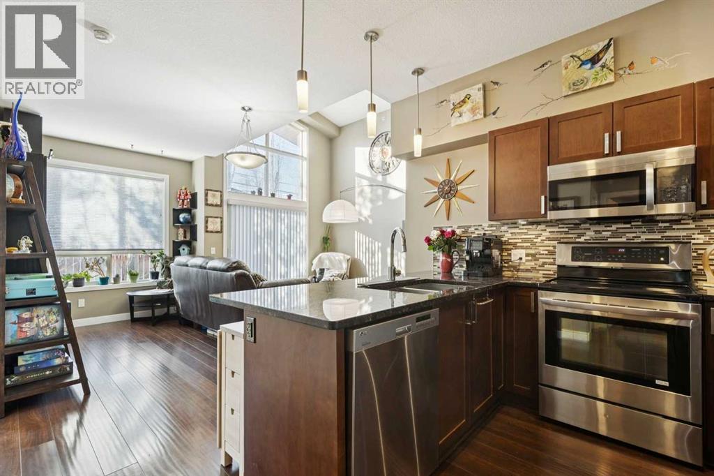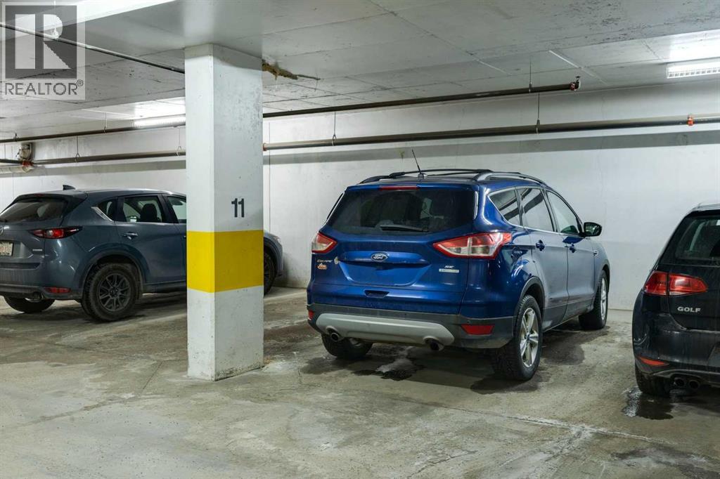 Welcome to Stonecroft Highland Park. Situated on the top floor this single bedroom + den unit features 15ft vaulted ceilings providing a ton of natural light - rare for apartment style condos. Combined with large windows, the height and design create an open, light-filled space that immediately stands out. The functional layout offers thoughtfully designed living throughout. The chefs style kitchen provides excellent cabinet and counter space, complete with granite countertops, stainless steel appliances, and a functional breakfast bar. The primary bedroom is spacious and bright, with large windows and his and hers closets for added storage and organization. A generous 4 piece bathroom and versatile den offer flexibility for a home office, guest area, or additional living space. Additional features include a stacked in-suite washer and dryer, private patio, heated underground parking stall, and separate storage locker. Overall this unit shows pride of ownership throughout! Condo fees include heat and water. The building is well cared for and offers a social room and lots of covered visitor parking. Located on a quiet street next to an off-leash dog park, it provides convenient access to Deerfoot Trail, Centre Street, nearby shops, amenities, and downtown by public transit. An excellent opportunity for comfortable living in a desirable and convenient location. Top floor units in this building don't last long so be sure to schedule your tour before its gone! (id:53676)