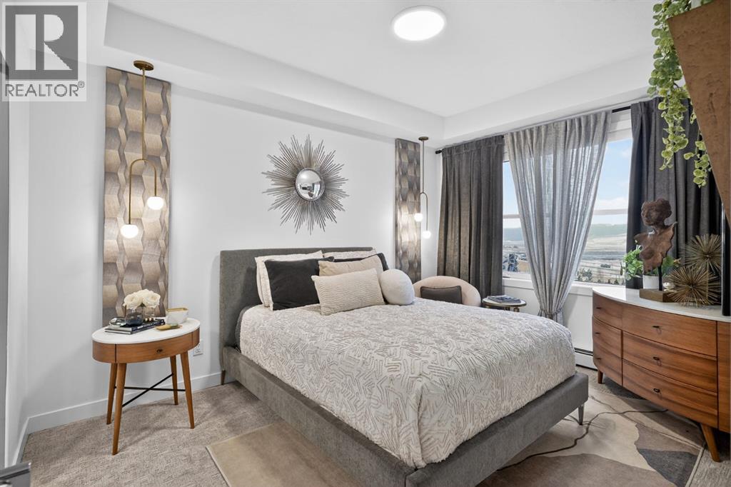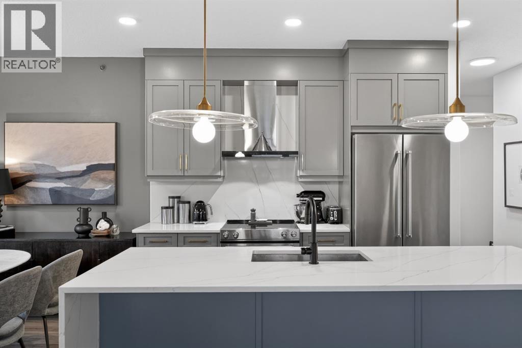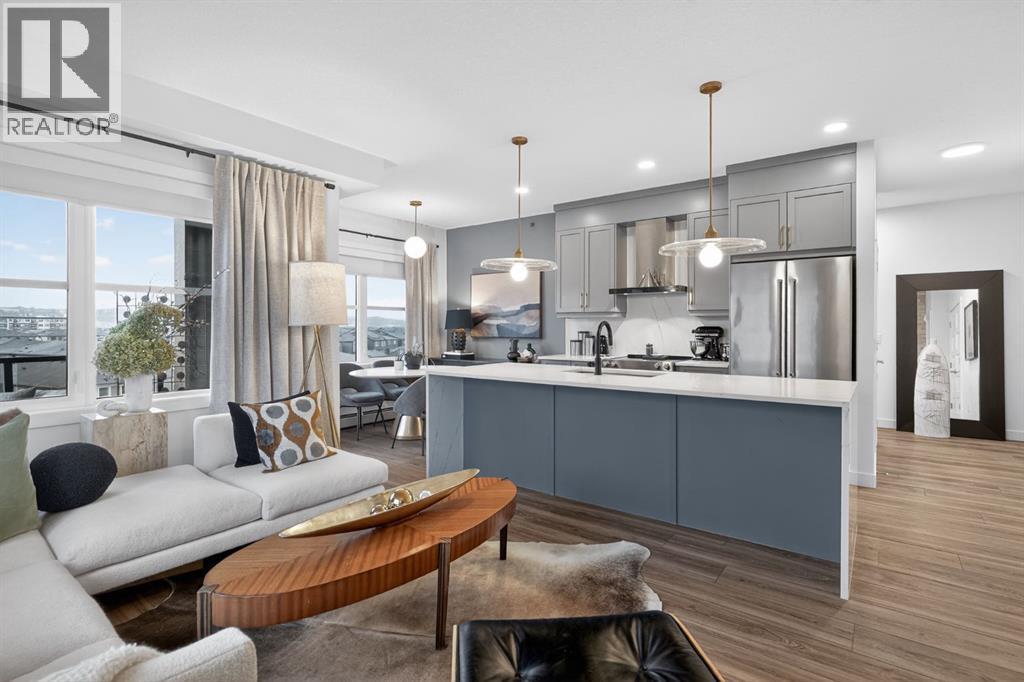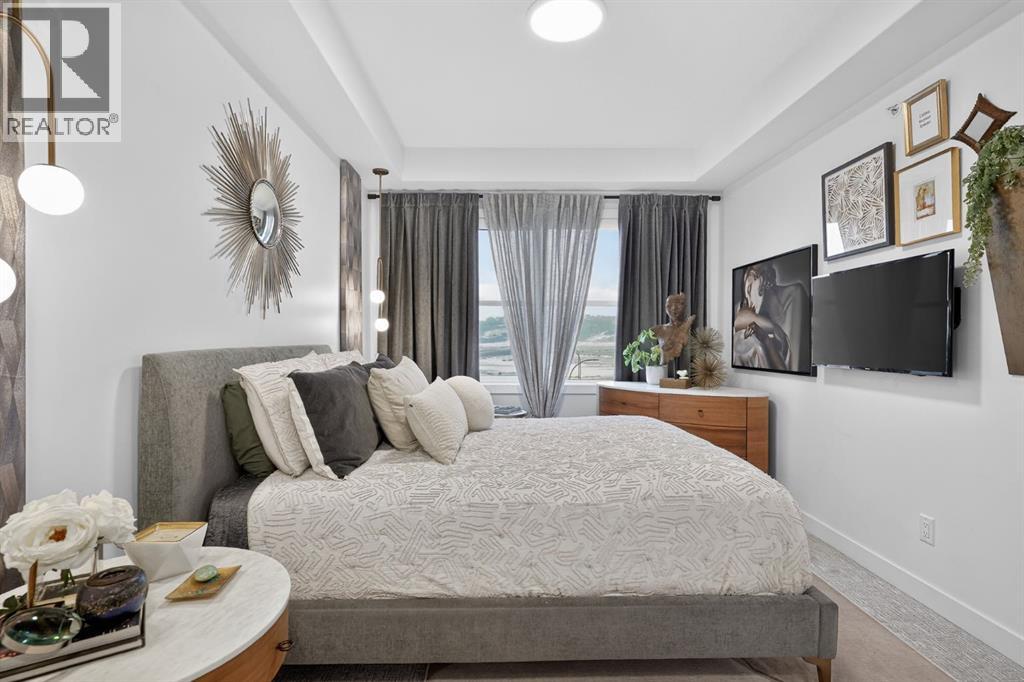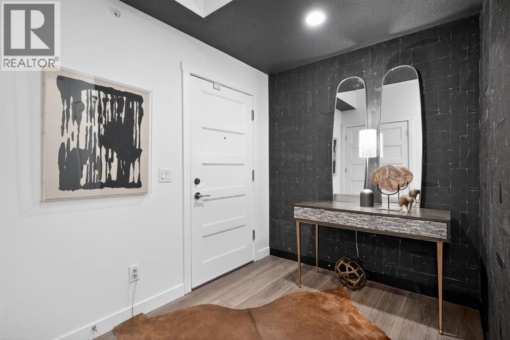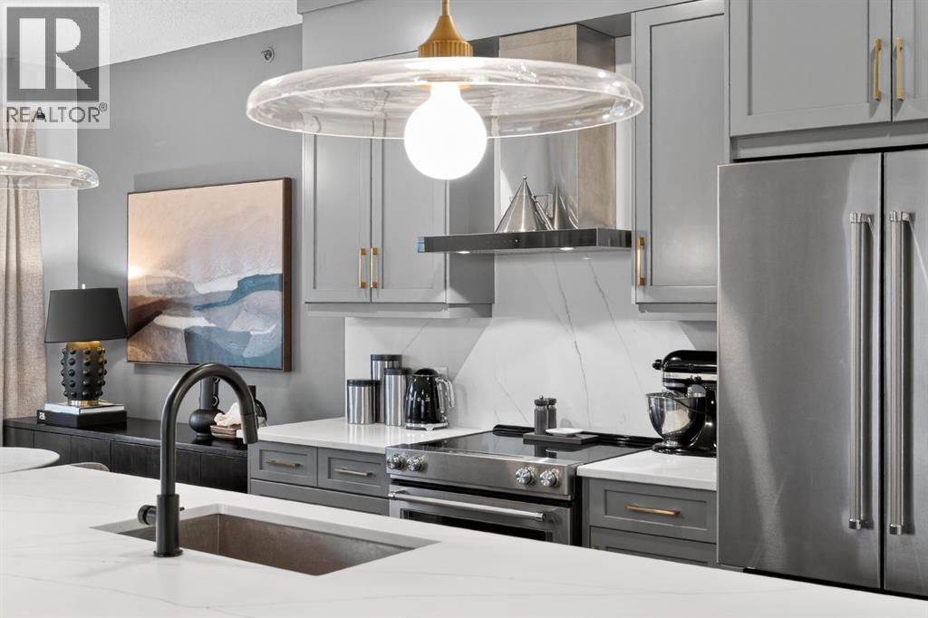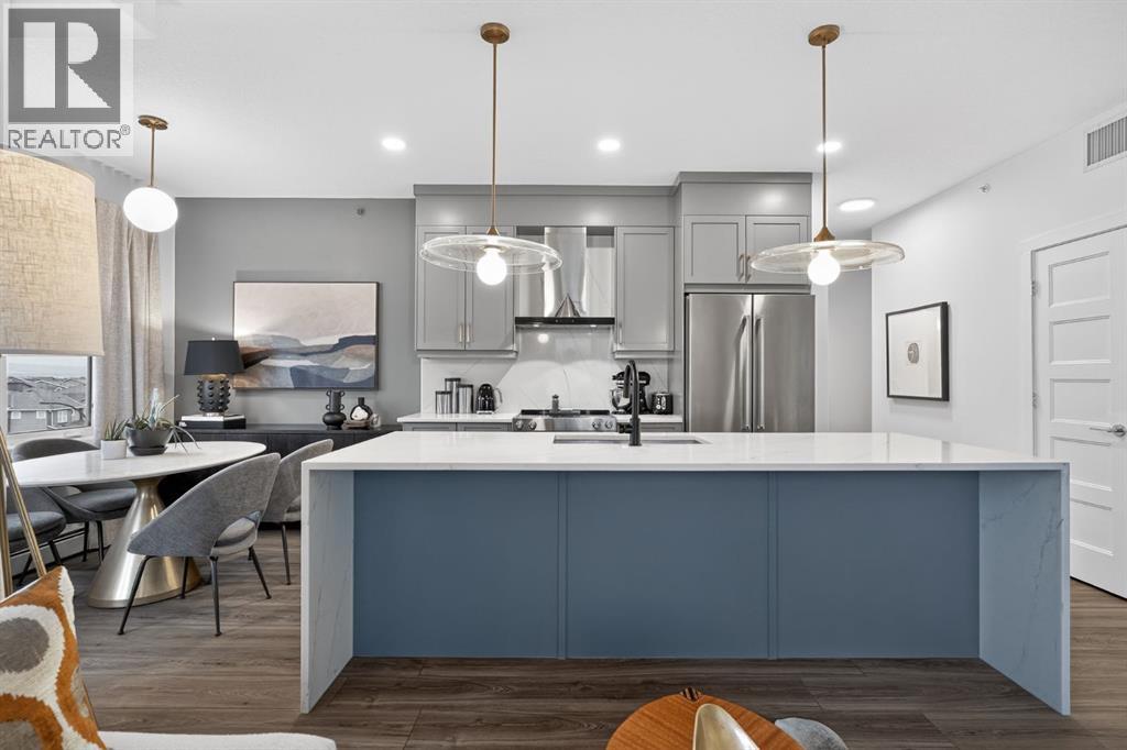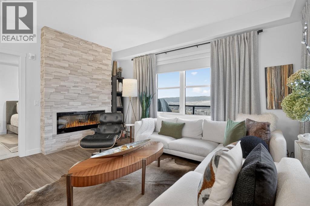 RARE TOP-FLOOR SW CORNER RESIDENCE WITH WRAP-AROUND BALCONY IN BOW360Perched on the top floor of BOW360, this southwest corner home offers elevated living with over $47,000 in builder upgrades, expansive natural light, and one of the most desirable layouts in the building. With no neighbours above and windows on two sides, this residence delivers privacy, sunshine, and a true sense of space that is rarely available in condo living.From the moment you step inside, the difference is clear. The entry has been thoughtfully redesigned to create an impressive, oversized foyer, a feature that immediately sets this home apart. The open-concept living space is bright and refined, anchored by a stunning travertine-wrapped fireplace that adds warmth and architectural sophistication.The kitchen was designed to impress, featuring a dramatic waterfall quartz island, stainless steel appliances, upgraded cabinetry, and elevated designer finishes throughout. Whether entertaining or enjoying a quiet evening at home, the space feels modern, intentional, and effortlessly stylish.The wrap-around southwest-facing balcony extends your living space outdoors, offering open sky views and sunlight throughout the afternoon and evening, perfect for summer evenings and year-round enjoyment.The primary suite provides a private retreat with a walk-through closet and beautifully finished four-piece ensuite. A spacious second bedroom and full bath offer flexibility for guests, a home office, or shared living.Titled underground parking and secure storage add convenience, while condo fees that include heat, water, and gas provide exceptional value.Steps to the Bow River pathways, parks, golf, and off-leash areas, this is an opportunity to own one of the best-positioned and most upgraded homes in BOW360. (id:53676)