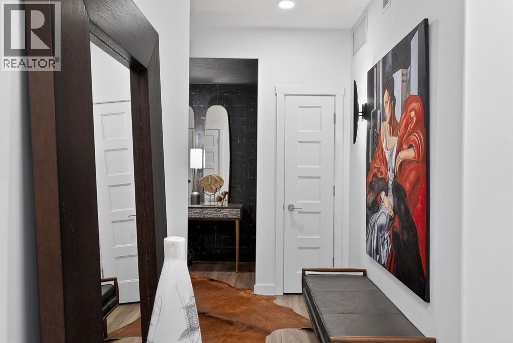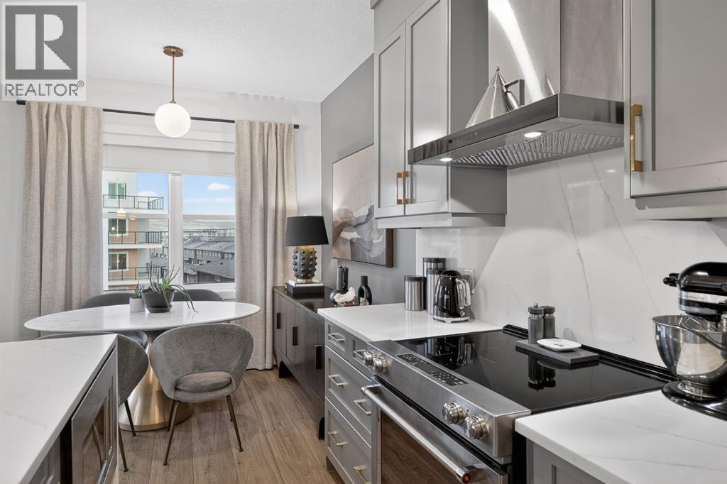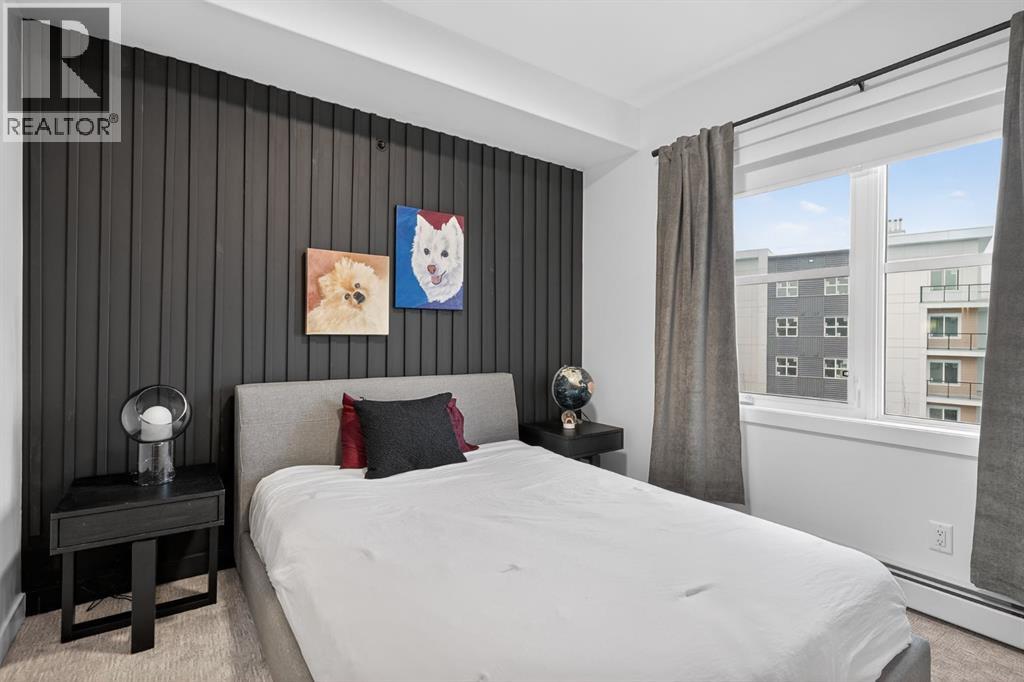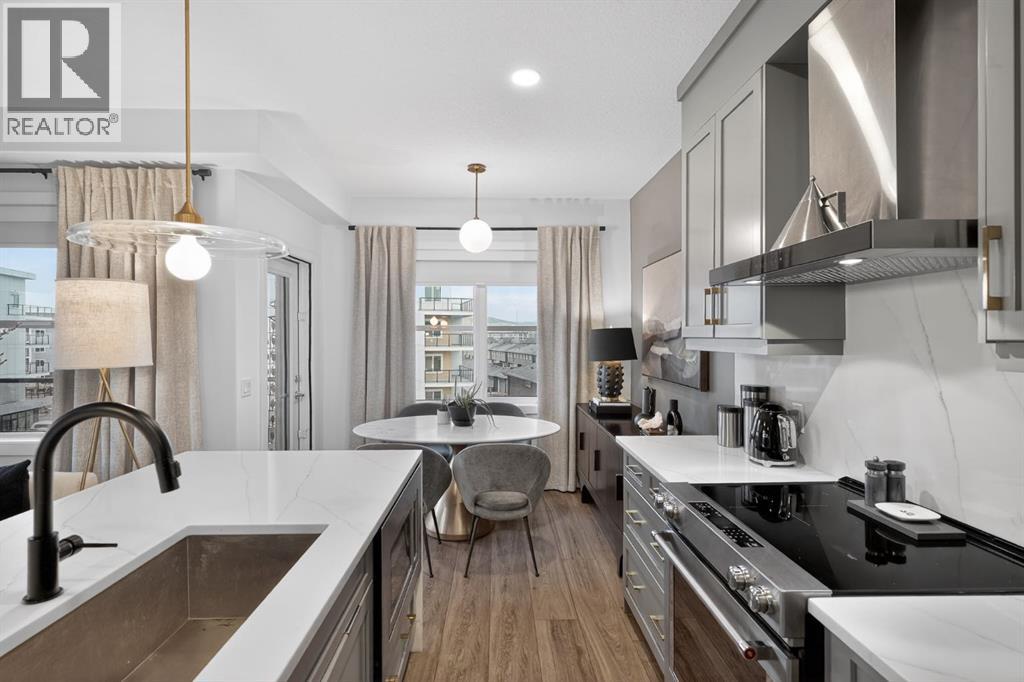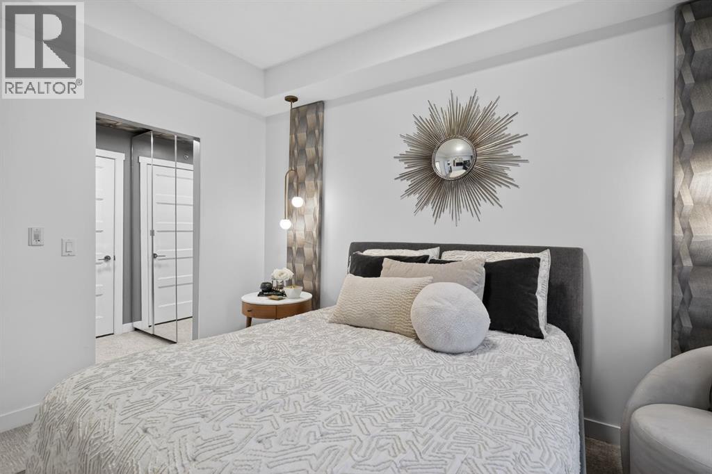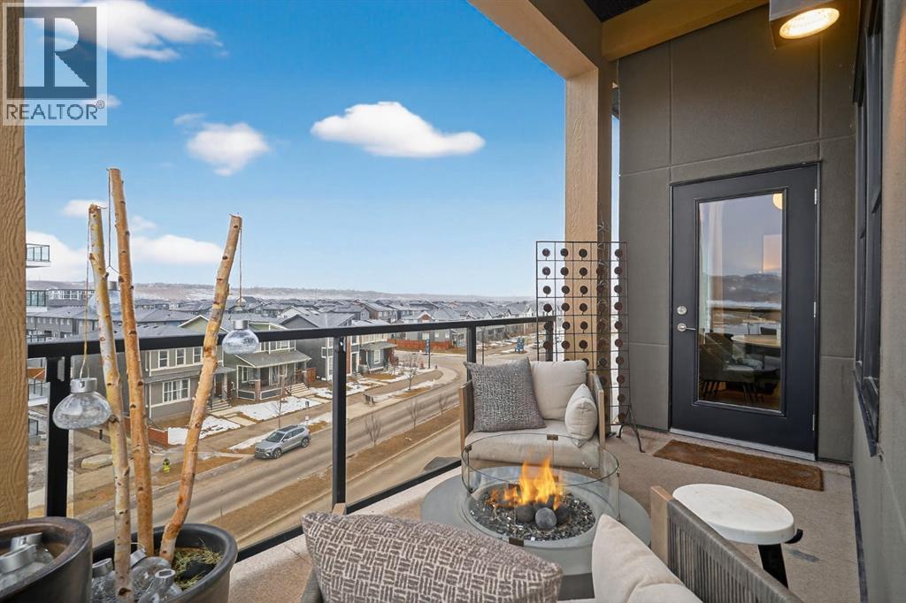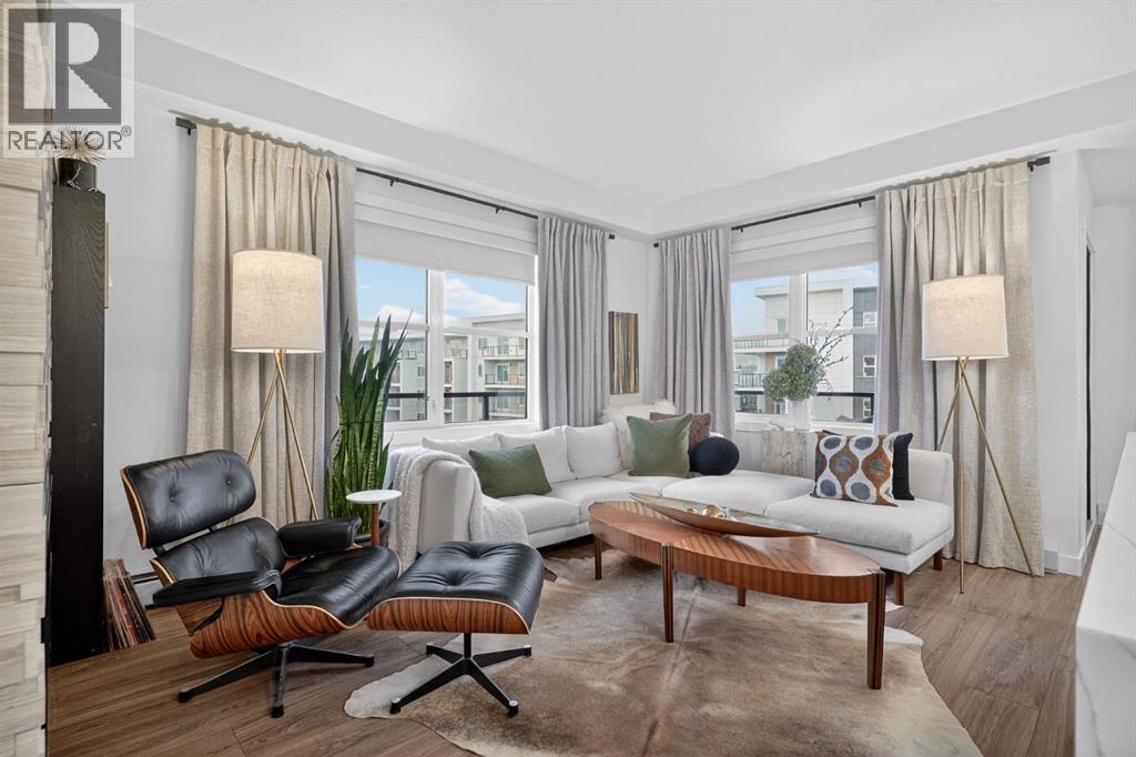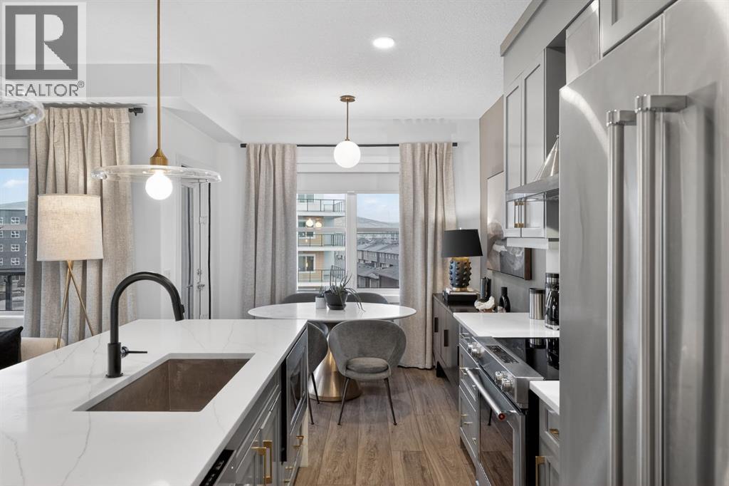 RARE TOP-FLOOR SW CORNER RESIDENCE WITH WRAP-AROUND BALCONY IN BOW360Perched on the top floor of BOW360, this southwest corner home offers elevated living with over $47,000 in builder upgrades, expansive natural light, and one of the most desirable layouts in the building. With no neighbours above and windows on two sides, this residence delivers privacy, sunshine, and a true sense of space that is rarely available in condo living.From the moment you step inside, the difference is clear. The entry has been thoughtfully redesigned to create an impressive, oversized foyer, a feature that immediately sets this home apart. The open-concept living space is bright and refined, anchored by a stunning travertine-wrapped fireplace that adds warmth and architectural sophistication.The kitchen was designed to impress, featuring a dramatic waterfall quartz island, stainless steel appliances, upgraded cabinetry, and elevated designer finishes throughout. Whether entertaining or enjoying a quiet evening at home, the space feels modern, intentional, and effortlessly stylish.The wrap-around southwest-facing balcony extends your living space outdoors, offering open sky views and sunlight throughout the afternoon and evening, perfect for summer evenings and year-round enjoyment.The primary suite provides a private retreat with a walk-through closet and beautifully finished four-piece ensuite. A spacious second bedroom and full bath offer flexibility for guests, a home office, or shared living.Titled underground parking and secure storage add convenience, while condo fees that include heat, water, and gas provide exceptional value.Steps to the Bow River pathways, parks, golf, and off-leash areas, this is an opportunity to own one of the best-positioned and most upgraded homes in BOW360. (id:53676)