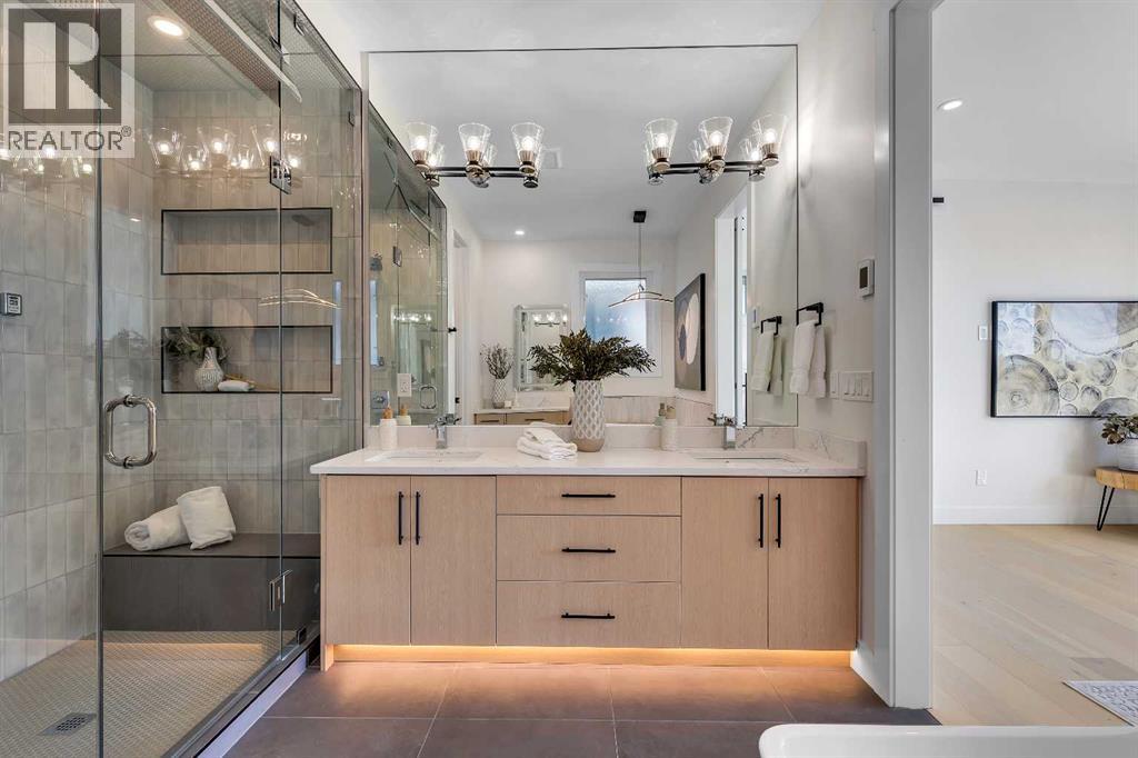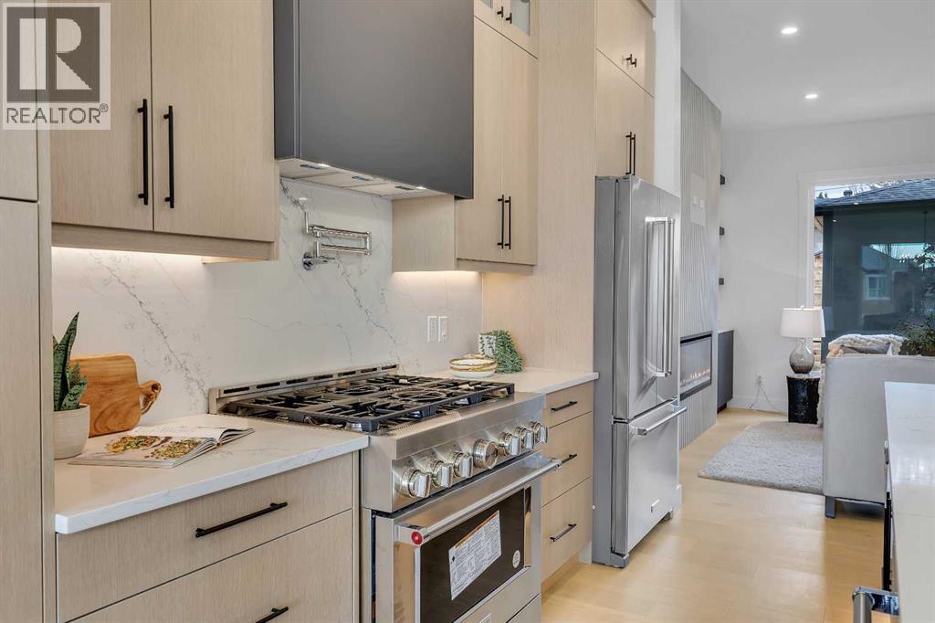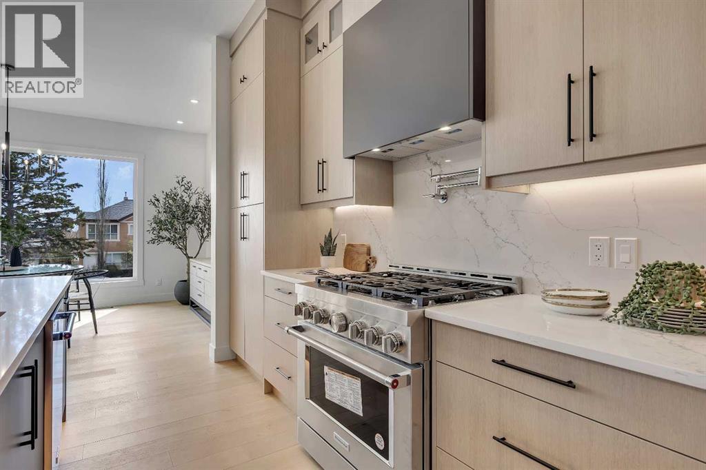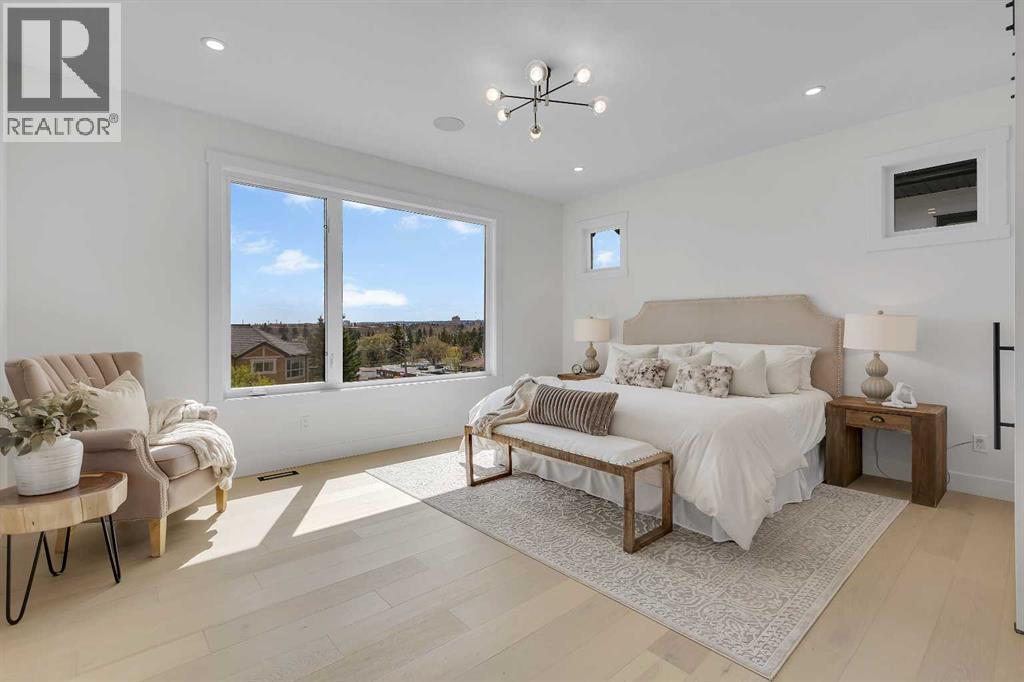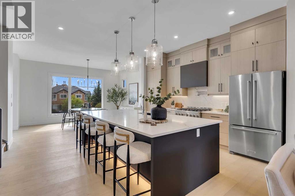 COLLINGWOOD LUXURY CUSTOM HOME | ATTACHED DOUBLE GARAGE | LEGAL 2 BDRM BASEMENT SUITE. Welcome to 42 Collingwood Place. Situated on a 32’ x 100’ lot atop a quiet cul-de-sac in Collingwood Place, this custom-built home features over 3,000 sqft of total living area. Every detail has been meticulously planned for OPTIMAL LIVING. The main floor features 10’ CEILINGS and a bright south-facing dining area to house all your guests over the holidays. The chef’s kitchen is built with an OVERSIZED ISLAND with quartz counters and LED-under-lighting, matching quartz backsplash, full-height cabinetry and a pot-filler above the 36” gas range. A COFFEE BAR with cabinetry and a beverage fridge adds convenience. A private office is secluded by custom French-inspired iron and glass casement sliding doors provides a sanctuary. The living room features an electric fireplace, custom LED shelving, an in-ceiling speaker system, and a powder room near the mudroom which featuring floor-to-ceiling cabinetry for ample gear storage. The ATTACHED double garage is FULLY INSULATED, drywalled, and includes a 200 AMP breaker, and gas heater and EV charger rough-ins. Upstairs, the primary suite offers breathtaking views of DOWNTOWN CALGARY and the ROCKY MOUNTAINS, an expansive walk-in closet, and a dual vanity ensuite with an OVERSIZED SOAKER TUB, STEAM SHOWER with dual niches, and a standalone VANITY COUNTER with a light-up mirror. A frosted glass window provides privacy while allowing in natural light. The laundry room features quartz counters, a sink, and full-height cabinetry. Two additional bedrooms overlook NOSEHILL PARK, each with custom closet built-ins. A main bathroom and linen closet complete this level. All bathrooms (except the powder room) include IN-FLOOR HEATING and LED underlighting. The LEGAL BASEMENT SUITE boasts 9’ ceilings, a spacious kitchen, a large living area, and TWO BEDROOMS. The suite comes with a full kitchen / laundry appliance package. The mechanical room features TWO furnaces, an A/C unit for the main, a sump pump, radon rough-in, and an oversized hot water tank. The private courtyard-style backyard (vinyl decking) includes outdoor speaker rough-ins and a gas outlet for a BBQ or fire table. CONFEDERATION PARK is just steps away to the south, with Nose Hill Park to the north. Short walk to Collingwood elementary school , St. Francis High School & bus stops, plus easy access to downtown. Close to all amenities—Calgary Winter Club, shopping malls, U of C, Children and Foothills Hospitals. This home blends urban convenience with natural beauty and offers downtown & mountain views. Fully hardwired for security systems and cameras, it also qualifies for CMHC’s 30-year amortization and GST rebates—check with your lender/accountant! Built by Archway Developments, a family-owned business with 20+ years of experience, this home is backed by Progressive New Home Warranty. (id:53676)
