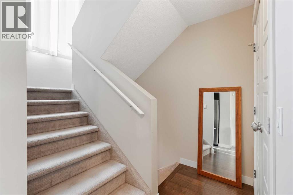 Welcome to this stylish and well-maintained 3-level townhome, located in the vibrant community of Coventry Hills. Just steps from schools, shopping, restaurants, public transit, and with quick access to both Deerfoot and Stoney Trail — convenience at its best.Offering 2 bedrooms, 2 full bathrooms, and over 1,200 sq ft of total living space, this home is designed for both comfort and functionality.The main level features contemporary finishes throughout — including smoke grey engineered laminate flooring, granite countertops, glass tile backsplash, dark cabinetry, stainless steel appliances, and high-profile baseboards. The galley-style kitchen flows into a cozy dining nook and a bright, west-facing living room. Step out onto your private west-facing balcony, perfect for evening sunsets and entertaining.The top floor is dedicated entirely to the primary retreat, featuring a spacious bedroom, 4-piece ensuite with granite, a generous walk-in closet, and a second private balcony — also west-facing for tons of natural light.On the lower level, you’ll find a comfortable second bedroom, a full 3-piece bathroom with walk-in shower, stacked laundry, storage space, and utility room.Includes one assigned parking stall directly out front, plus plenty of visitor and street parking. This is a well-managed complex with low condo fees, offering excellent value for first-time buyers, downsizers, or investors.This home shows beautifully and is move-in ready. FURNITURE NEGOTIABLE! Virtual tour available! (id:53676)