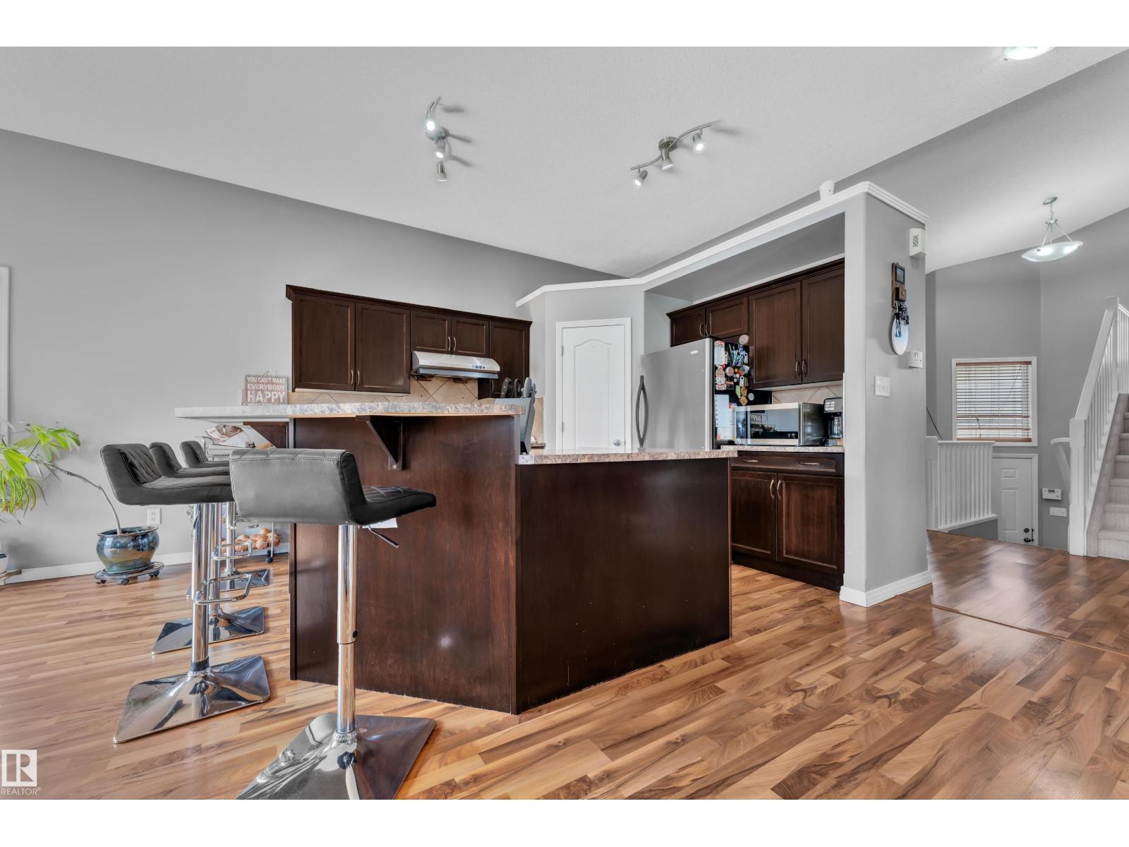 Welcome to the family-friendly community of Brintnell! This fantastic bi-level w/fully finished basement offers exceptional value, comfort & space for whole family. Featuring 4 BED & 3 full BATH, this beautifully maintained home is move-in ready. Main floor showcases engineered laminate floor & bright open-concept layout w/spacious great room, dining area & fantastic kitchen complete w/abundant cabinet/counter space & a large island. Numerous south-facing rear windows fill the home w/natural light throughout the main living areas. The private upper-level primary bed features a walk-in closet & 4-piece ensuite. The finished basement includes a huge family/recreation room, 2 additional bedrooms, a 4-piece bath & laundry area. Major updates include ROOF (2023), FURNACE (2023), HWT (2020), STOVE (2022), WASHER/DRYER (2016). The HEATED GARAGE is a huge bonus! Enjoy the sunny south-facing backyard w/large two-tier deck & ample lawn space. Close to Anthony Henday, Manning Town Centre, schools, parks & amenities. (id:53676)