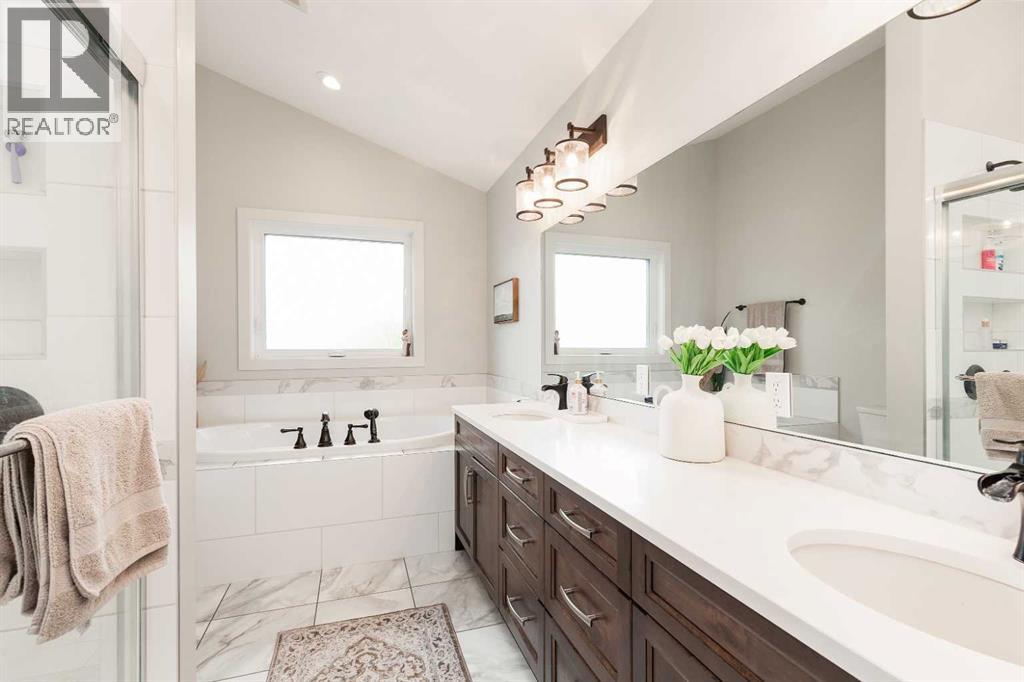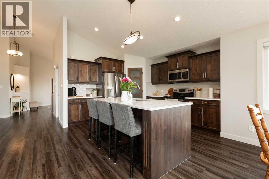 If you’ve been holding out for the perfect bungalow, this might just be the one! Sitting on a corner lot, this custom-built home checks a ton of boxes. From the moment you walk in, you’ll notice the vaulted ceilings, great hardwood floors, and all the natural light flooding in. The main floor layout is smart and super functional with an open concept kitchen (quartz countertops, of course), dining and living space, a full 4-piece bathroom, and a good-sized bedroom. Main floor laundry? Yep, that too!The primary suite is a standout—it’s got a walk-in closet, a big 5-piece ensuite with a jetted tub, dual vanity, and just feels like a proper retreat. Head downstairs and you’re greeted by a massive family room (over 500 sq ft!) with a cozy fireplace, two more large bedrooms (one with another walk-in closet), and another full 4-piece bath. And the extras? This place is loaded. A/C, underground sprinklers, air exchange system, surround sound, heated garage, central vac, custom blinds, and window coverings throughout. Outside, you get an amazing deck, and some of the best landscaping you'll see on the market right now! If you're looking for a bungalow that doesn’t cut corners, this one's worth a look. (id:53676)