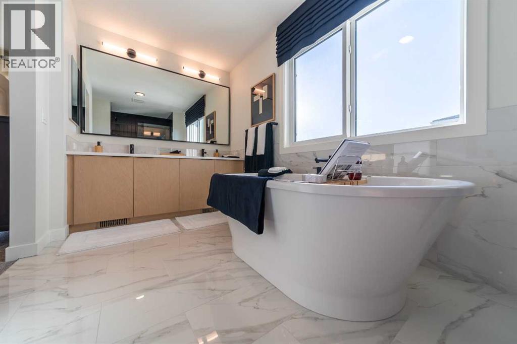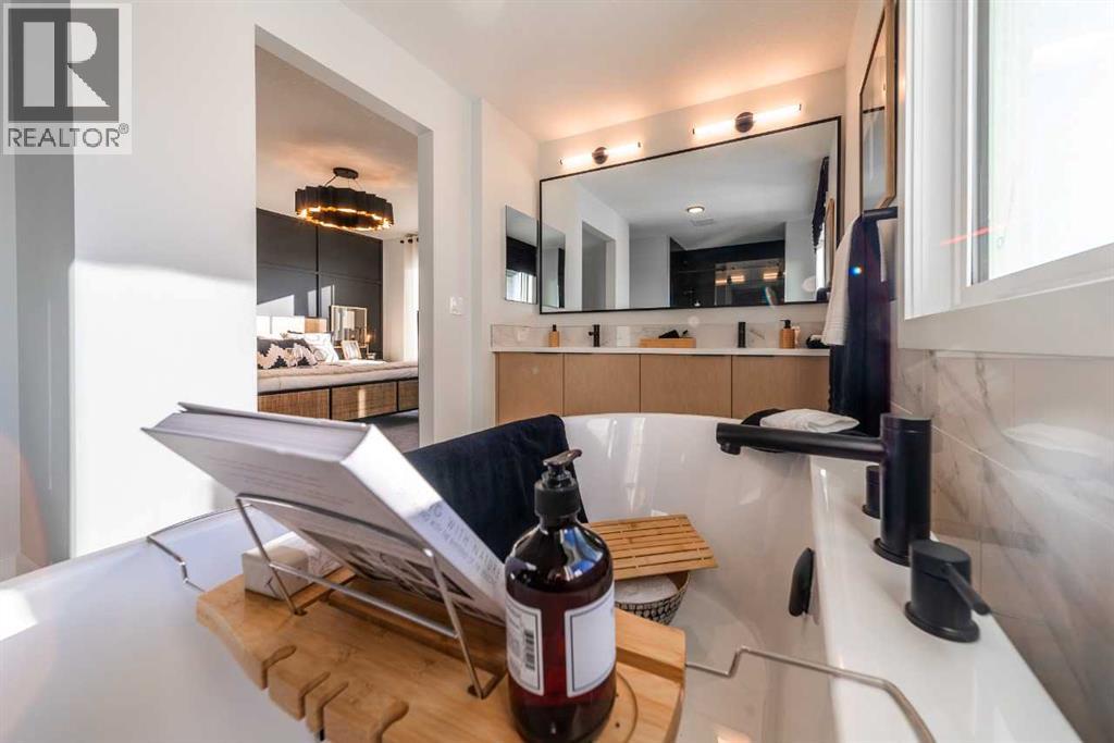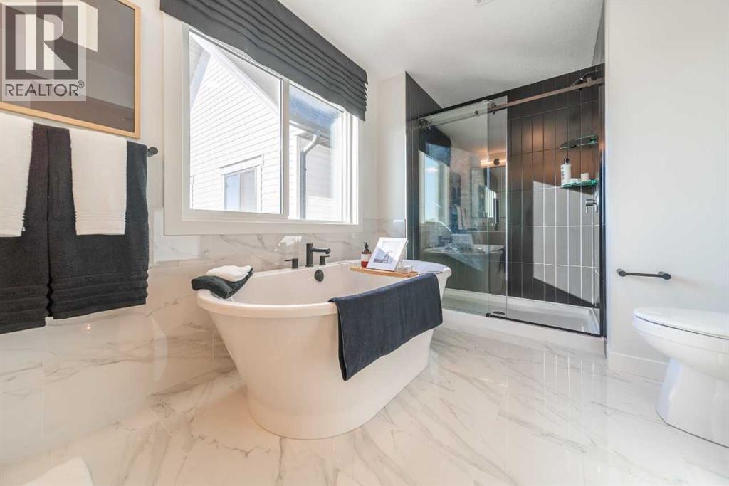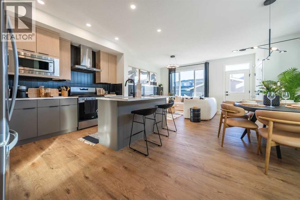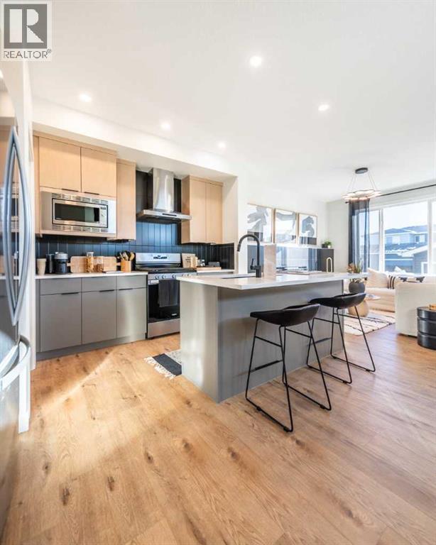 Introducing the Jade – a stunning laned home with incredible upgrades throughout! Built by a trusted builder with over 70 years of experience, this home showcases on-trend, designer-curated interior selections tailored for a custom feel. Featuring a full suite of smart home technology, this home includes a programmable thermostat, ring camera doorbell, smart front door lock, smart and motion-activated switches—all seamlessly controlled via an Amazon Alexa touchscreen hub. This spacious home features a main floor bedroom and full bath. The chef-inspired kitchen boasts stainless steel appliances, a chimney hood fan, and a spice kitchen with a gas range. Stainless Steel Washer and Dryer and Open Roller Blinds provided by Sterling Homes Calgary at no extra cost! $2,500 landscaping credit is also provided by Sterling Homes Calgary. Quartz countertops with undermount sinks flow throughout, paired with durable LVP on the main floor and tile in all bathrooms. The great room is highlighted by an electric fireplace with floor-to-ceiling tile, adding elegance to the space. Upstairs, the vaulted ceiling in the bonus room with a skylight brings in abundant natural light. The luxurious 5-piece ensuite includes dual sinks, a standalone tub, a shower with tiled walls, and a large window. A walk-in closet in the primary bedroom and a bank of drawers in both upper floor bathrooms provide extra storage. With additional windows and thoughtful design, the Jade is the perfect blend of luxury and function! Plus, your move will be stress-free with a concierge service provided by Sterling Homes Calgary that handles all your moving essentials—even providing boxes! Photos are a representative. (id:53676)