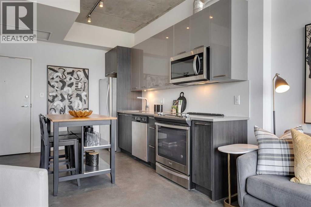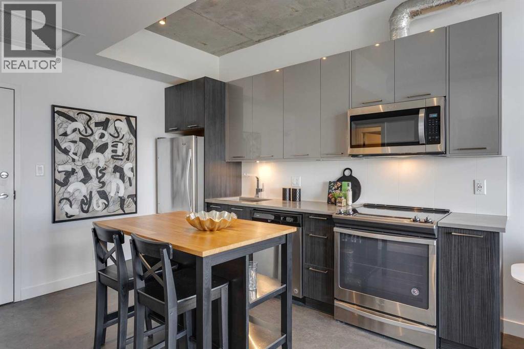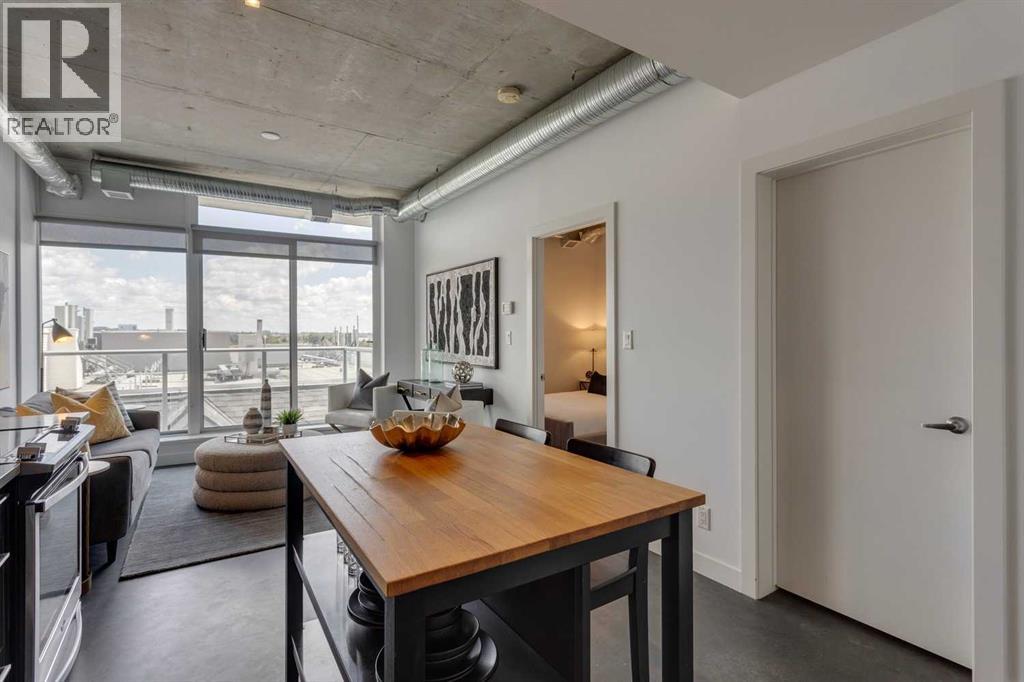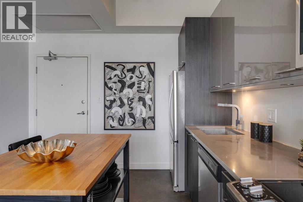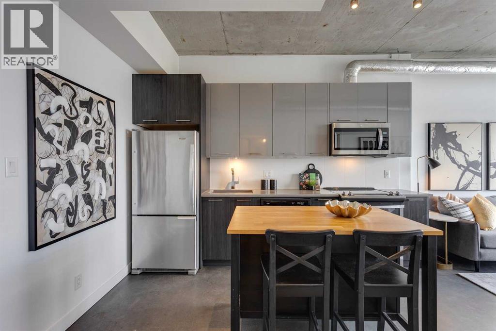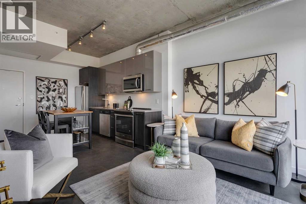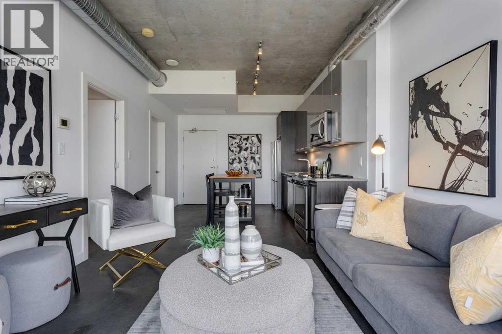 INK! Your inner-city adventure begins here in this trendy upscale building built by award-winning Battistella developments! This stunning 1-bedroom condo is situated in the heart of downtown, located on the 5th floor with breathtaking views of the Bow River, Fort Calgary, and the urban landscape. This east-facing unit is drenched in light and blends industrial chic with modern comfort. Unique polished concrete floors and ceilings add a stylish edge, while the thoughtfully selected finishes create a warm and inviting atmosphere. Step out onto the expansive balcony to soak in the downtown energy, whether you're sipping your morning coffee or entertaining friends. Convenience is at your fingertips to explore the city's top restaurants, shops, and parks—all within walking distance. The INK building is designed to elevate your lifestyle with features such as a spacious common amenities area, a ping pong table, and a large rooftop patio featuring cozy fireplaces and ample seating for large gatherings. Whether you're a professional seeking the dynamic downtown lifestyle or an investor , this condo checks all the boxes. Bicycle storage is complete with an air pump and repair rack. This pet-friendly building also has a dog wash, underground visitor parking, and parking stalls available for rent, subject to availability. This is a very affordable opportunity to own or to hold as a great investment. Price inc a titled storage unit in the parkade and a rented underground parking stall is $200.00/mth. Can be kept or cancelled (id:53676)