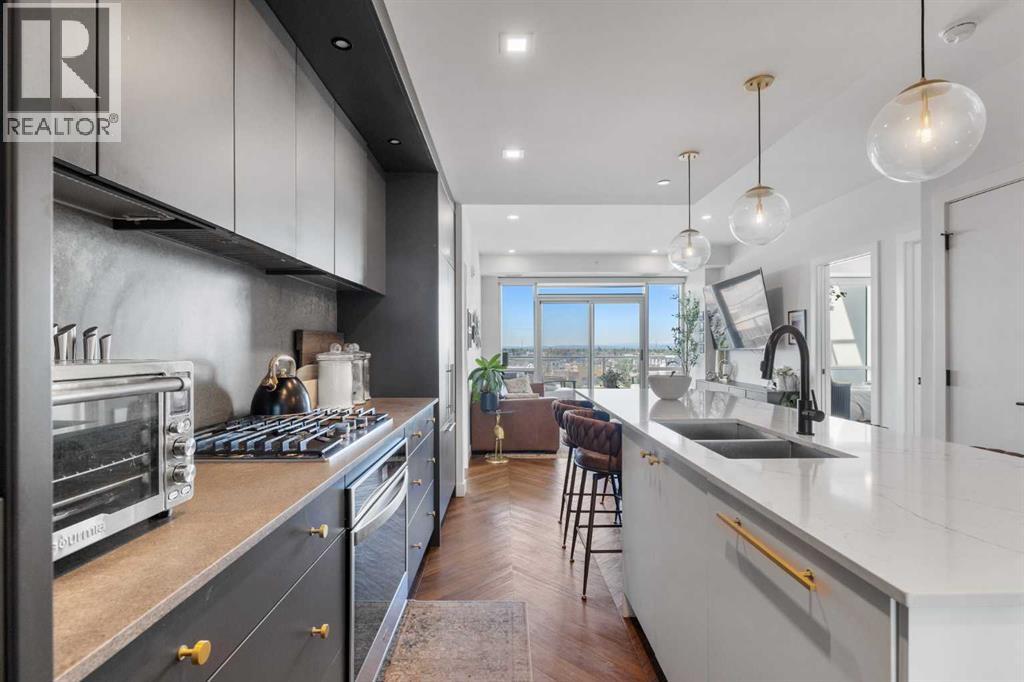 Discover sophisticated living in this upscale 2-bedroom, 2 bathroom condo nestled in the heart of West Springs. Perfect for professionals or downsizers, this concrete-built, low-maintenance residence offers quiet comfort, durability, and a prime location in a vibrant, walkable community. Step through the generous foyer into a sun-drenched open-concept layout featuring expansive windows and sliding glass doors that flood the space with natural light and showcase breathtaking views, including the mountains. The spacious living area opens seamlessly to a large balcony (one of the few private ones in the building), ideal for morning coffee or evening relaxation. The chef-inspired kitchen impresses with integrated stainless steel appliances, a gas range, and a large eat-up island—perfect for entertaining. The adjacent dining room is both generous in size and versatile enough to serve as a home office or library. Retreat to the primary suite offering a large walk-in closet and a spa-like 4-piece ensuite with dual vanities and a walk-in shower. A second bedroom and a stylish 4-piece bath with deep soaker tub provide flexibility for guests or family. The flexibility of the bedrooms and bathrooms in this unit would also lend itself to two adults easily sharing the space. You’ll also appreciate the in-suite laundry and flooring with acoustic underlay throughout. Additional features include: air conditioning, 1 titled underground parking stall, EV charging stations & bike storage, owner’s lounge on same level, lobby concierge, ground-level restaurants, shops, wellness studios, community gardens. Just minutes from Calgary French & International School, Webber Academy, Rundle College, and Ernest Manning High School, and quick access to Stoney Trail for weekend getaways. This quiet unit is extremely well-maintained and move-in ready, and combines luxury, lifestyle, and location into one exceptional offering. (id:53676)