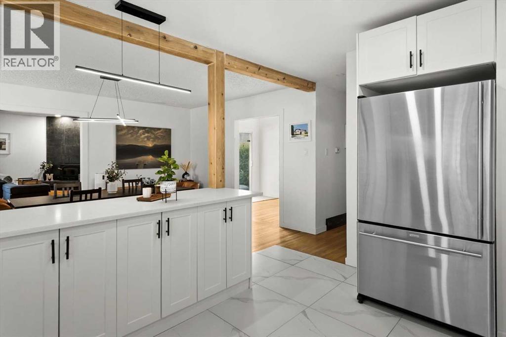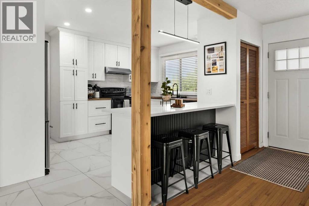OPEN HOUSE CANCELLED- OCTOBER 12th. Nestled on a prominent corner lot at the top of the hill on 32nd Avenue and 52nd Street, where Montgomery meets Varsity, this thoughtfully upgraded bungalow offers the perfect blend of timeless finishes, modern updates, and everyday convenience. Just a short stroll from the Bow River Pathway, University District, and Market Mall, this location provides the perfect balance of connectivity while retaining the charm and character of a well-established, welcoming neighborhood.In the midst of a competitive market, our sellers were fortunate to secure this exceptional home after connecting personally with its previous owner, who had lovingly cared for it since 1996. Over the past three years, they’ve added their own personal touches, created countless memories, and continued the home’s story of warmth, character, and pride of ownership. Whether you are a developer, young professional couple, or downsizer seeking main-floor living, the possibilities are endless here. With the sellers’ family needs evolving, they are ready to move on and pass this cherished home to its next chapter.From the exterior, crisp white cladding with green accents offers a fresh, inviting presence that complements the home’s elevated setting. Upon entering, you’re welcomed by a bright entryway, while the home’s original hardwood floors lend a touch of classic charm. Opening seamlessly into a generous dining area, this is the perfect setting for hosting dinners or enjoying late-night game nights with family and friends.To the right is the renovated kitchen, featuring marbled tile floors, white floor-to-ceiling soft-close cabinetry, butcher block and quartz countertops, and newer stainless-steel appliances. The elevated family room to the left invites you in with its large windows that fill the space with natural light and a beautifully refinished tile that borders the wood-burning fireplace.At the back of the home, a versatile flex space sits just off the dining area and kitchen, ideal as a reading nook, home office, or casual lounge. Sliding patio doors open directly from here to the expansive backyard, where newly installed sod and freshly planted aspen trees create a private oasis—perfect for hosting barbecues or simply relaxing in the sun.The main level also features an upgraded bathroom and two well-appointed bedrooms. Descending to the basement, you’ll find a versatile third bedroom and full bathroom, outfitted with a Murphy bed, making it perfect as a guest retreat or workout space. The spacious laundry room offers ample room for storage and organization, while the adjoining hobby shop has long been a cherished space for the sellers’ home projects and renovations.Additional updates include a newer furnace, hot water tank, and roof, all providing peace of mind to the next owners for years to come. (id:53676)