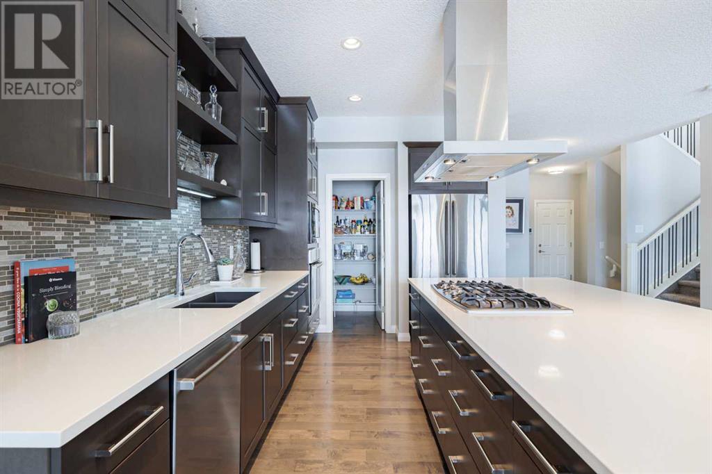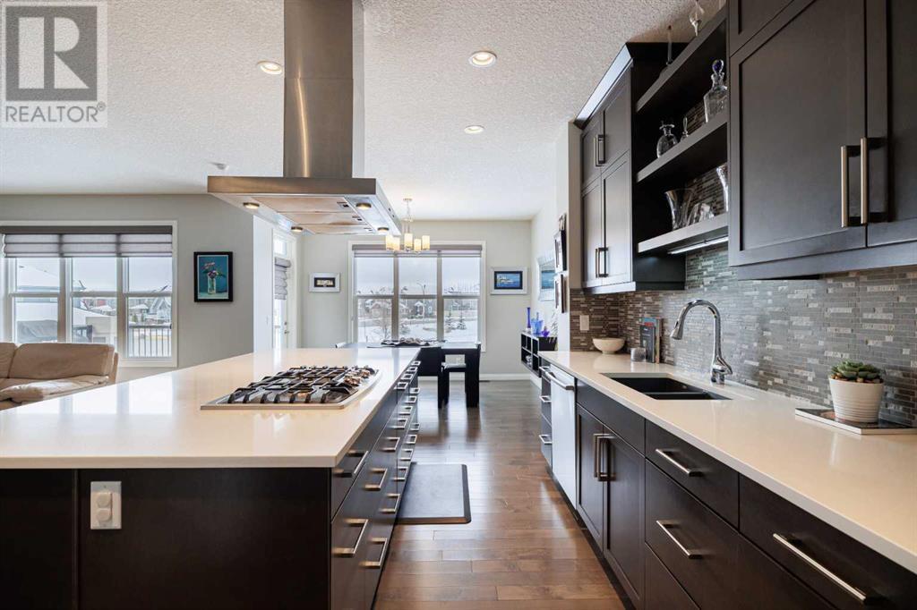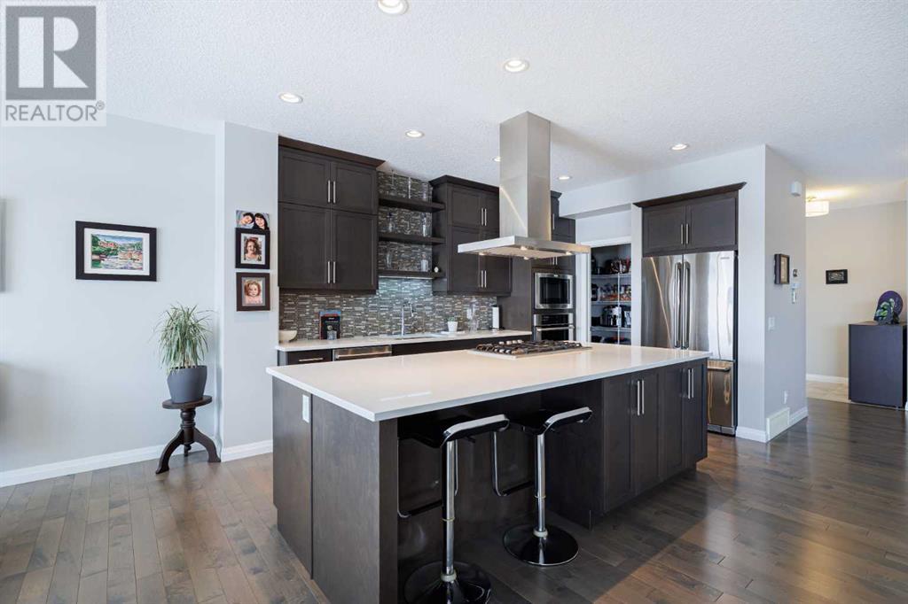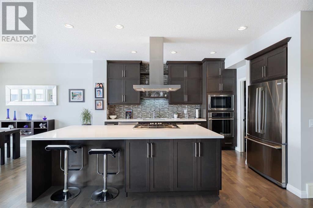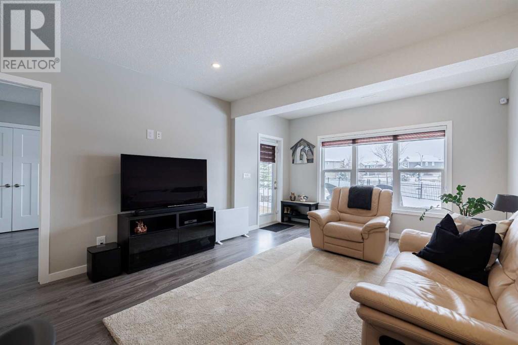 Nestled in the heart of Sunset Ridge, this exquisite home sits on an expansive 6,800 SQFT pie-shaped lot—one of the largest in the area—backing onto serene ponds and picturesque walking paths. Offering a rare blend of privacy and breathtaking scenery, this residence is a true sanctuary, boasting a southwest-facing backyard that captures mesmerizing mountain and sunset views. Upon arrival, the home’s stunning curb appeal is immediately apparent. Yet, it is the rear of the property that truly commands attention. Overlooking vast green spaces, tranquil ponds, and distant peaks, this residence stands apart with its spacious design and strategic placement, offering a level of independence rarely found in similar homes. Inside, elegance meets functionality with 9ft ceilings and numerous upgrades throughout the home. The chef’s kitchen, where a massive quartz-topped island with an eating bar serves as the perfect gathering spot. Stainless steel appliances, a gas cooktop, a generous pantry, and ceiling-height cabinetry elevate the space, while abundant natural light accentuates its sophisticated finishes. Adjacent to the kitchen, the bright and airy eating nook invites you to enjoy meals with a view. Large windows frame the sweeping landscape, and direct access to the back deck makes alfresco dining effortless. The inviting living room is equally captivating, with a stone-surround fireplace and wooden mantle providing warmth and charm. A 2pc powder room and access to the double attached garage complete this main level. Upstairs, the luxurious primary retreat is a masterpiece of comfort and tranquility. This private haven features sweeping mountain views, his-and-her walk-in closets, and a spa-like 5-piece ensuite with dual vanities, a soaking tub, an oversized shower, and a private water closet. Two additional bedrooms, a stylish 4-piece bathroom, an upper-level laundry room, and a versatile sitting area—ideal as a playroom or flex space—complete this thoughtfully designed floor. The fully finished lower level extends the home’s living space with a spacious family room offering walkout access to the lower patio. The massive backyard, a true rarity in the neighbourhood, provides ample space for outdoor entertainment, gardening, and relaxation, all while enjoying the spectacular natural surroundings. A generous additional bedroom, a sleek 3-piece bathroom, and a flexible office or bonus space ensure that this level meets all your family’s needs. Designed for year-round comfort, this home is equipped with air conditioning! Sunset Ridge is one of Cochrane’s most desirable communities, offering an unparalleled lifestyle with scenic pathways, parks, and close proximity to schools, shopping, and amenities. With its expansive lot, breathtaking vistas where you can watch your kids at the park, and meticulously designed interior, this property stands as a true gem in the community—offering an extraordinary blend of luxury, space, and serenity! (id:53676)
