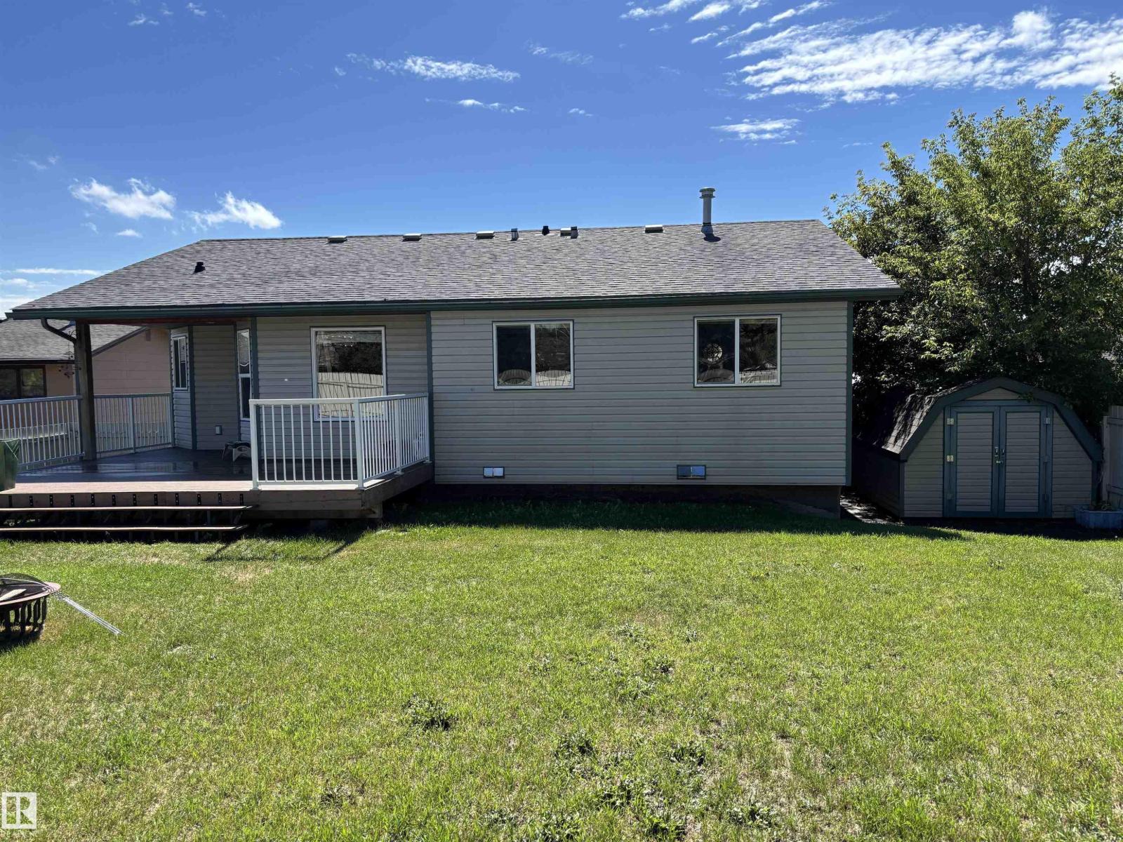 Well maintained home in Elk Point. This beautiful 1,269 sq.ft. home built in 2002, is situated on a large 65x130 fenced lot & boasts 5 beds, 3 baths, a fully finished basement, large family room, & in-floor heating! Once you step inside you'll love this home's vaulted ceilings, open concept, & secure entrance to the garage. The kitchen is well designed & offers a large pantry, wood cabinetry, eat up peninsula, & a large dining area with access to the no maintenance deck! Design features include unique angles throughout, rounded gyprock corners, knockdown stipple ceiling, & recessed lighting in bedrooms. The basement offers 2 beds, a 4 pc. bath & a large family room area with flex space. The att. dbl. garage, with in-floor heat, is 24x24 - the man door leads to the fully fenced backyard, 10x14 shed, fire pit & garden area. There's a large parking pad for 4 parked vehicles. Recently shingled 2021, & re-landscaped front yard with plants that bloom all summer. Bonus - situated on the parade route! (id:53676)