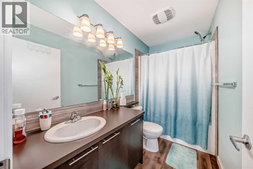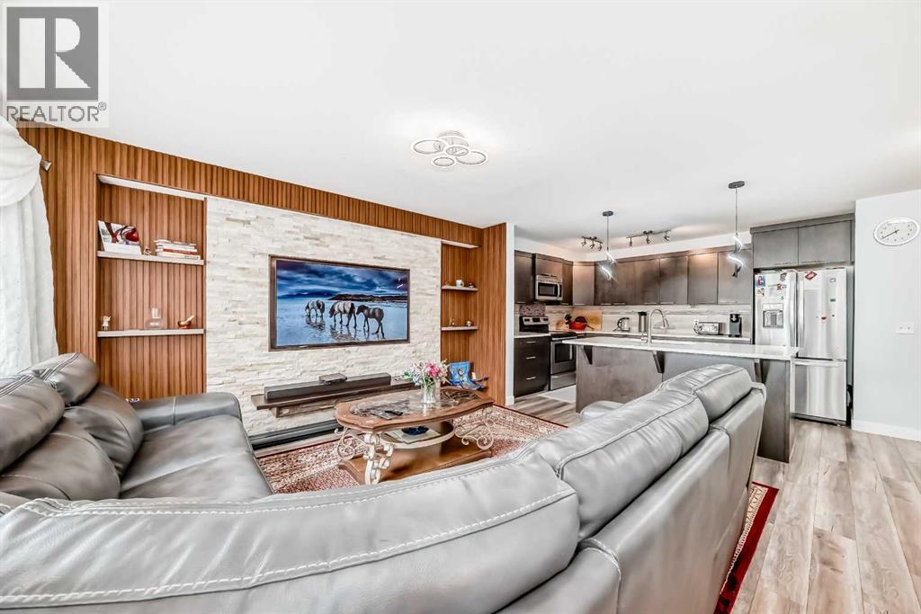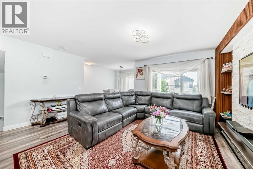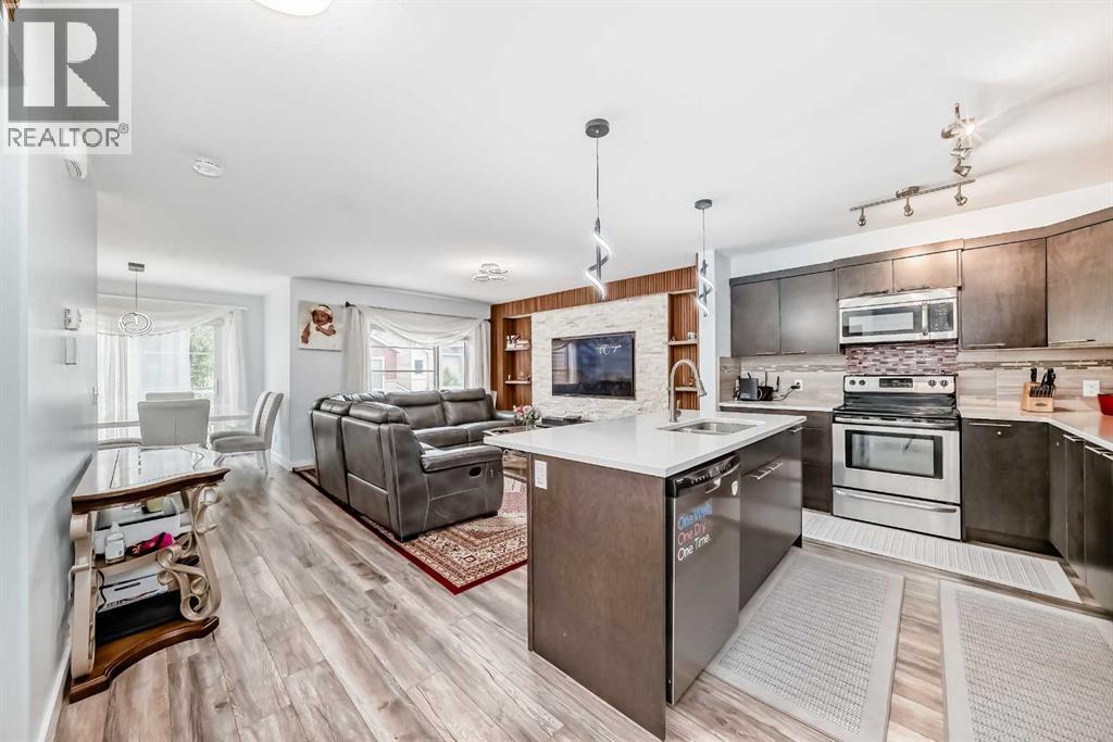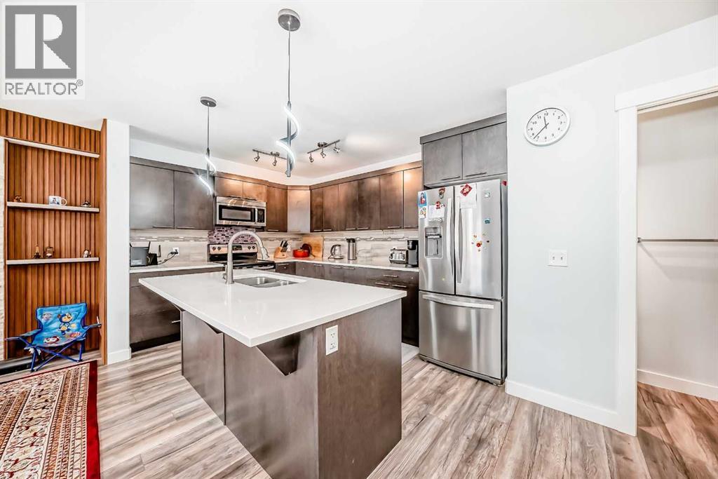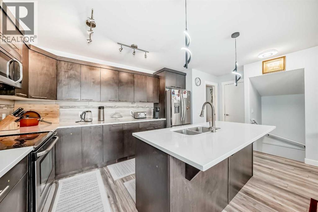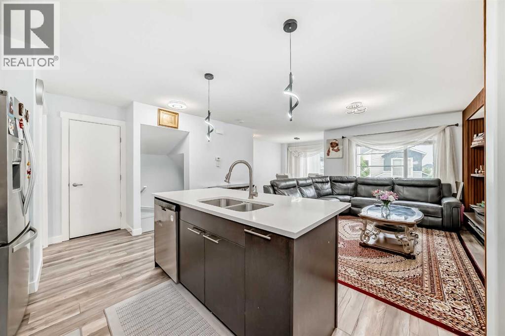 Welcome to this lovely and well-maintained townhouse in the desirable community of Redstone! This beautiful home offers 2 spacious bedrooms, 2.5 bathrooms, and over 1,400 sq ft of thoughtfully designed living space. Step inside to a bright and open floor plan, featuring a modern kitchen with stainless steel appliances, a center island, elegant LVP flooring, and a stylish feature wall. The dining area opens onto a sunny balcony/deck, perfect for morning coffee or evening relaxation. Upstairs, you'll find a generous primary suite complete with a closet and a private en-suite bathroom. The second bedroom boasts vaulted ceilings, with easy access to a full common bathroom and convenient upper-floor laundry. This home also includes an oversized single attached garage and is ideally located steps from a playground, bus stops, and within walking distance to shopping plazas. Commuting is a breeze with easy access to Metis Trail, Country Hills Blvd, and Stoney Trail. Don’t miss your chance to own this move-in-ready gem in one of NE Calgary’s fastest-growing communities! Book your private showing today! (id:53676)