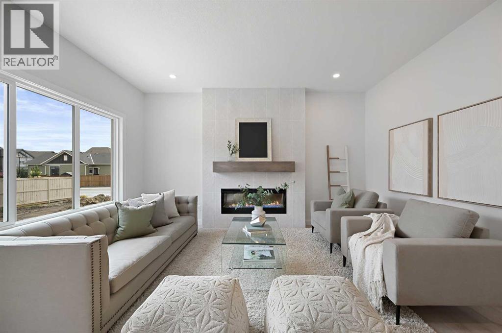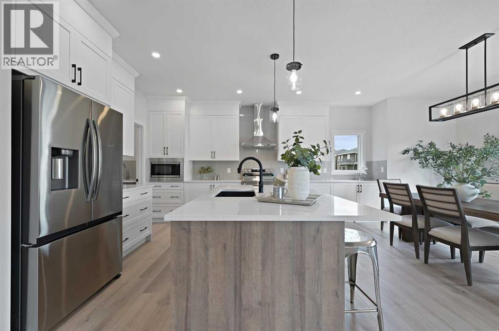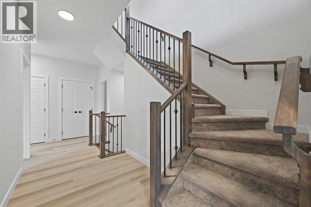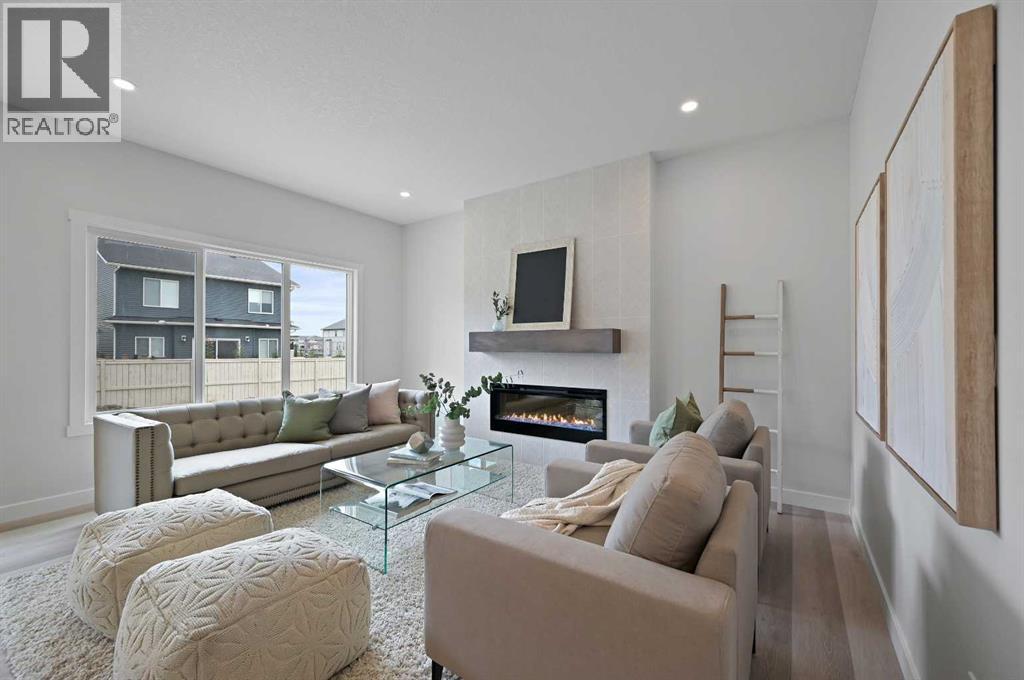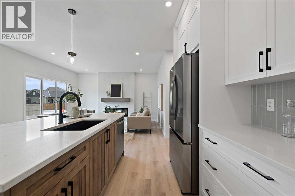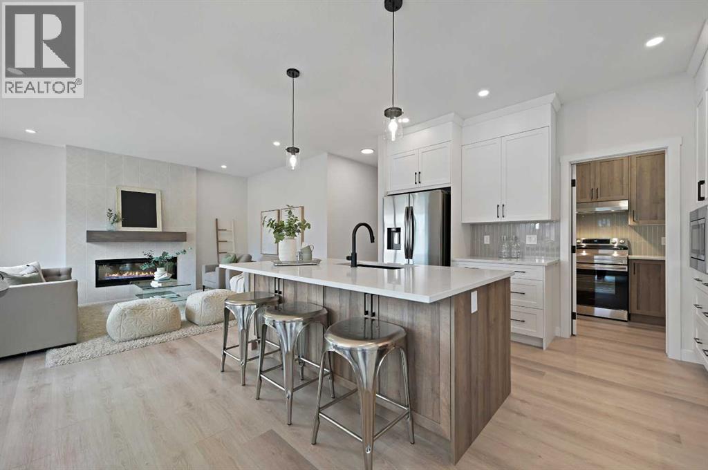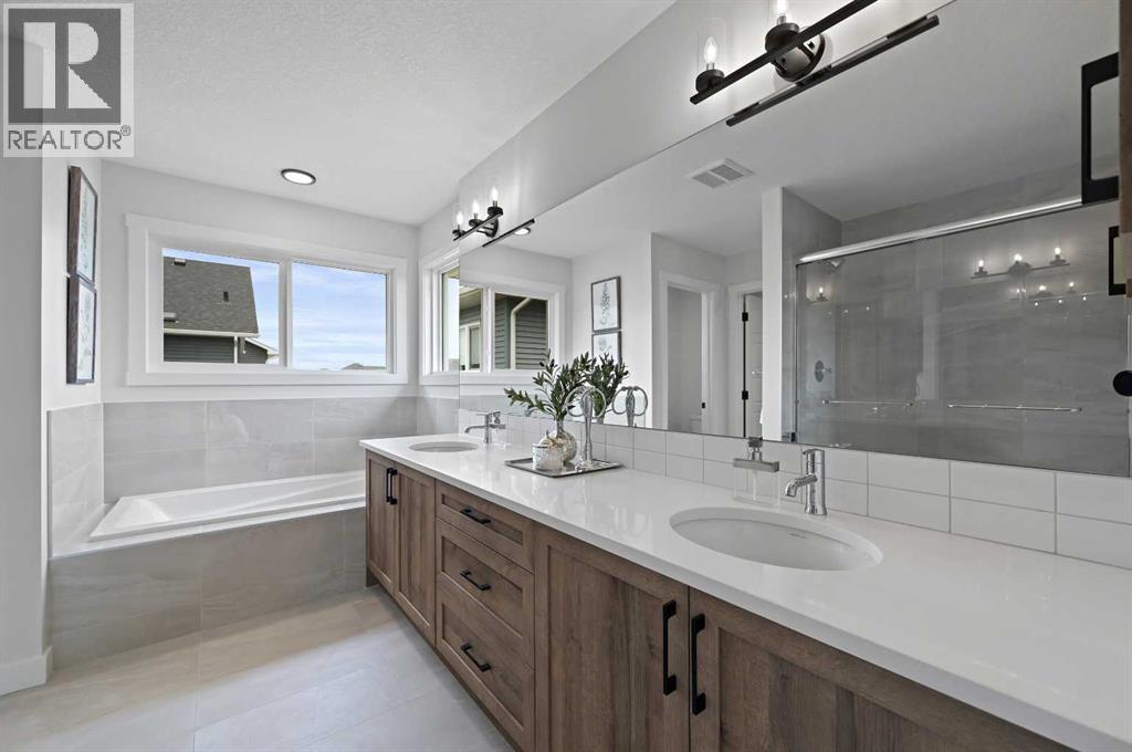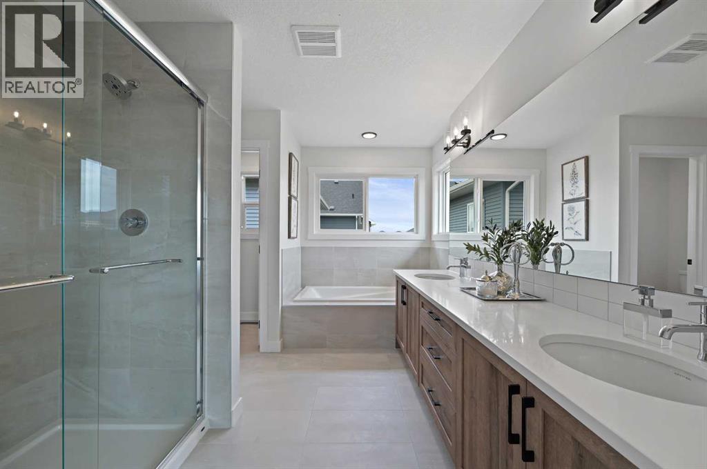 This thoughtfully designed, brand-new Genesis home in Bayside blends clean, modern finishes with a layout that makes sense. With almost 2700 square feet of above-grade space, five bedrooms, three full bathrooms, and an enclosed spice kitchen, it offers the flexibility today's families are looking for. The main floor is bright and open with wide LVP flooring, oversized windows, and 9-foot ceilings. A front bedroom and full bathroom provide an ideal setup for busy households with changing needs. The kitchen features full-height cabinetry, quartz countertops, upgraded hardware, and a fully enclosed spice kitchen with a prep sink, oven, and ample additional cabinetry. In the great room, a sleek fireplace with vertical tile surround adds a modern touch. The open dining area seamlessly flows from the kitchen, while the back entry features a well-planned mudroom with built-in shelving and direct access to the oversized garage. Upstairs, the central bonus room separates the primary suite from the three additional bedrooms. The primary bedroom features a large walk-in closet and a five-piece en-suite with a freestanding tub, an oversized tiled shower, and a double vanity. The secondary bedrooms are well-sized and share a five-piece bathroom with dual sinks. The laundry room is located conveniently on the upper level. Additional features include a side entry, 9-foot ceilings, modern black fixtures, custom fireplace tile, and designer lighting. The basement is unfinished and ready for your design ideas. All set on a quiet street near pathways, playgrounds, and schools in the established community of Bayside. *Area size was calculated by applying the RMS to the blueprints provided by the builder. (id:53676)