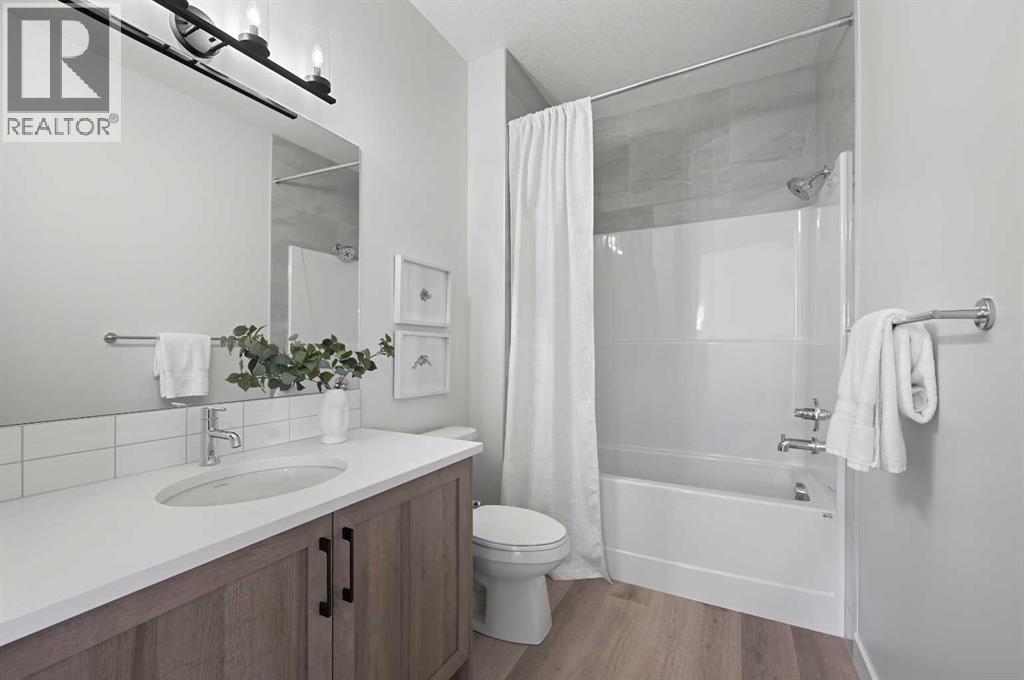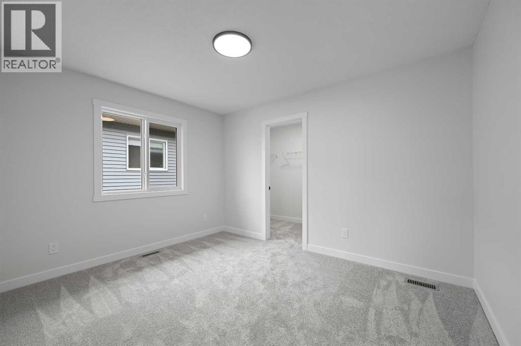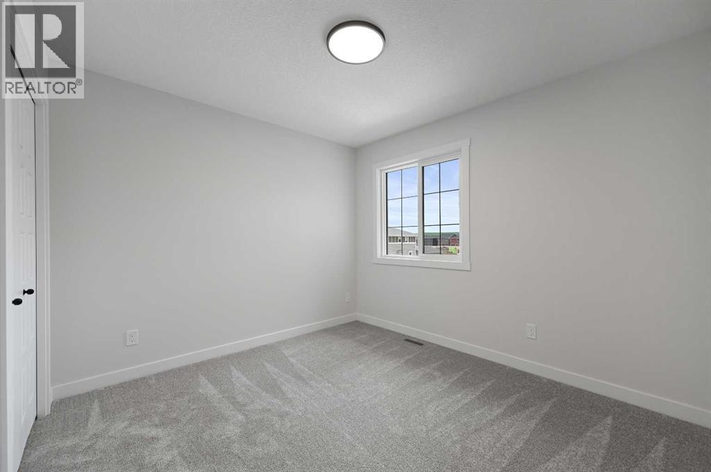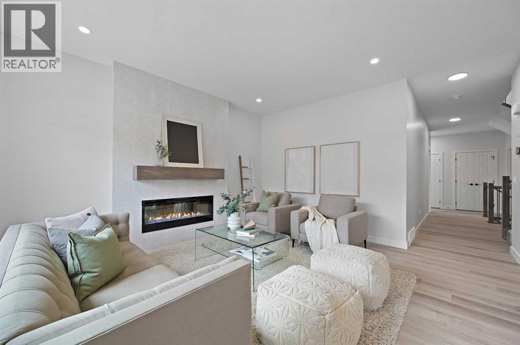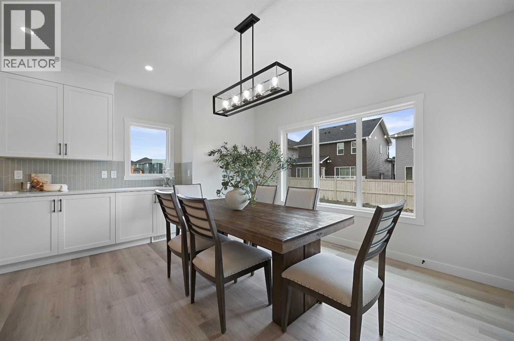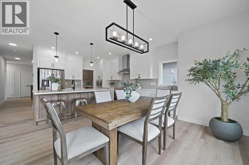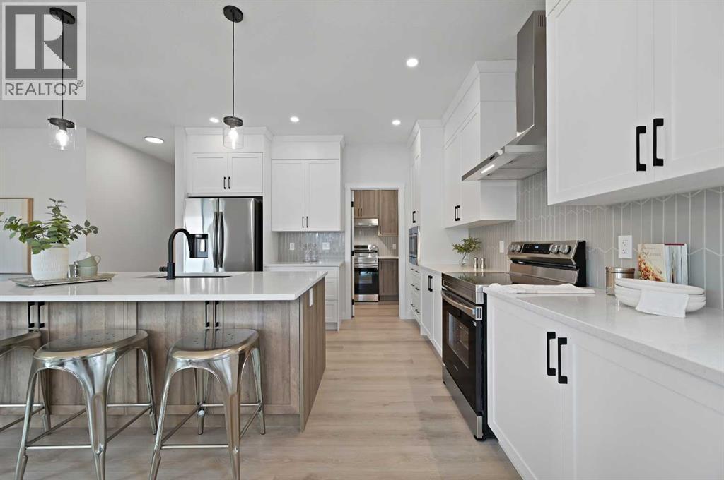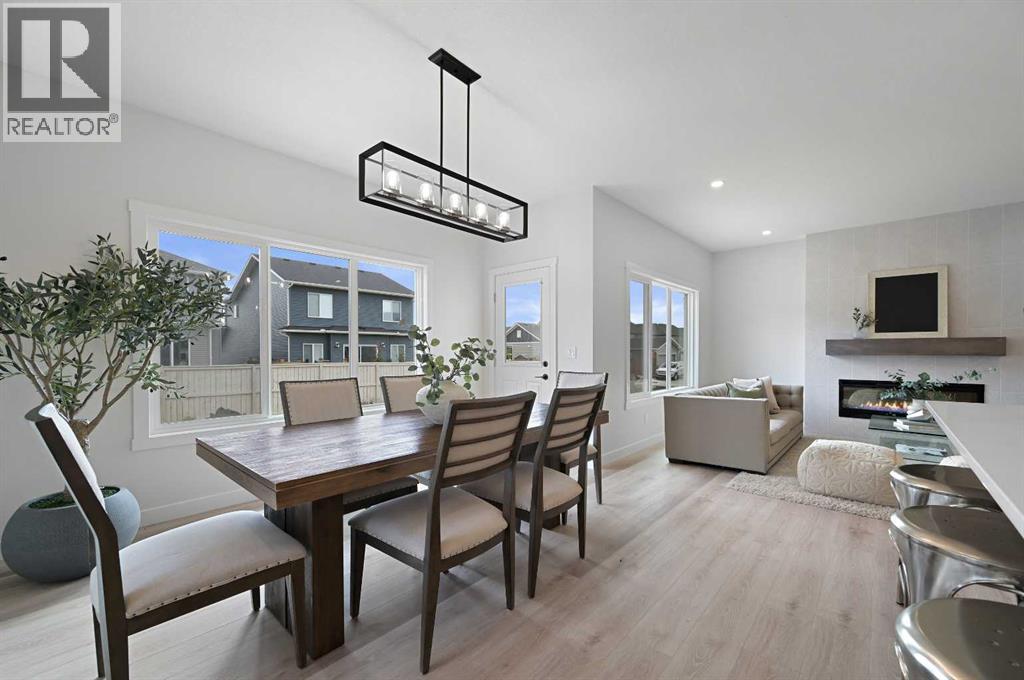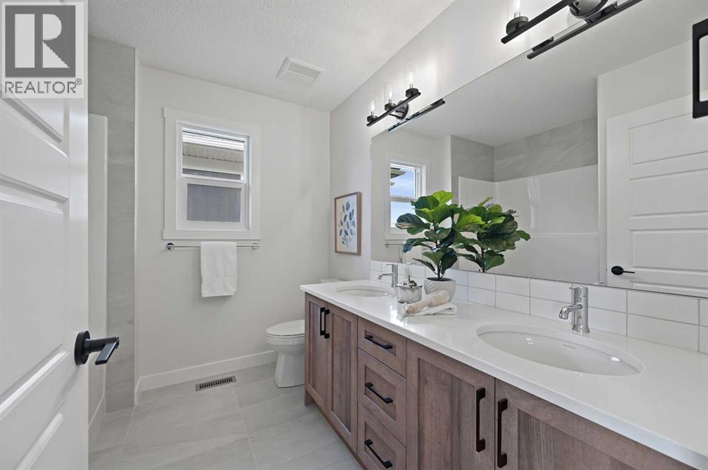 This thoughtfully designed, brand-new Genesis home in Bayside blends clean, modern finishes with a layout that makes sense. With almost 2700 square feet of above-grade space, five bedrooms, three full bathrooms, and an enclosed spice kitchen, it offers the flexibility today's families are looking for. The main floor is bright and open with wide LVP flooring, oversized windows, and 9-foot ceilings. A front bedroom and full bathroom provide an ideal setup for busy households with changing needs. The kitchen features full-height cabinetry, quartz countertops, upgraded hardware, and a fully enclosed spice kitchen with a prep sink, oven, and ample additional cabinetry. In the great room, a sleek fireplace with vertical tile surround adds a modern touch. The open dining area seamlessly flows from the kitchen, while the back entry features a well-planned mudroom with built-in shelving and direct access to the oversized garage. Upstairs, the central bonus room separates the primary suite from the three additional bedrooms. The primary bedroom features a large walk-in closet and a five-piece en-suite with a freestanding tub, an oversized tiled shower, and a double vanity. The secondary bedrooms are well-sized and share a five-piece bathroom with dual sinks. The laundry room is located conveniently on the upper level. Additional features include a side entry, 9-foot ceilings, modern black fixtures, custom fireplace tile, and designer lighting. The basement is unfinished and ready for your design ideas. All set on a quiet street near pathways, playgrounds, and schools in the established community of Bayside. *Area size was calculated by applying the RMS to the blueprints provided by the builder. (id:53676)