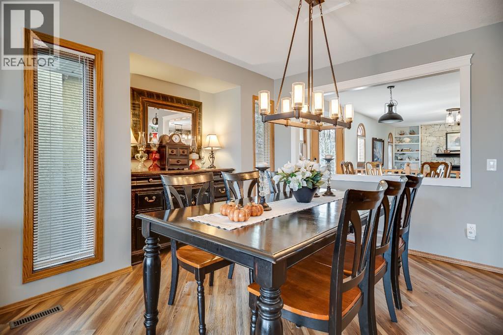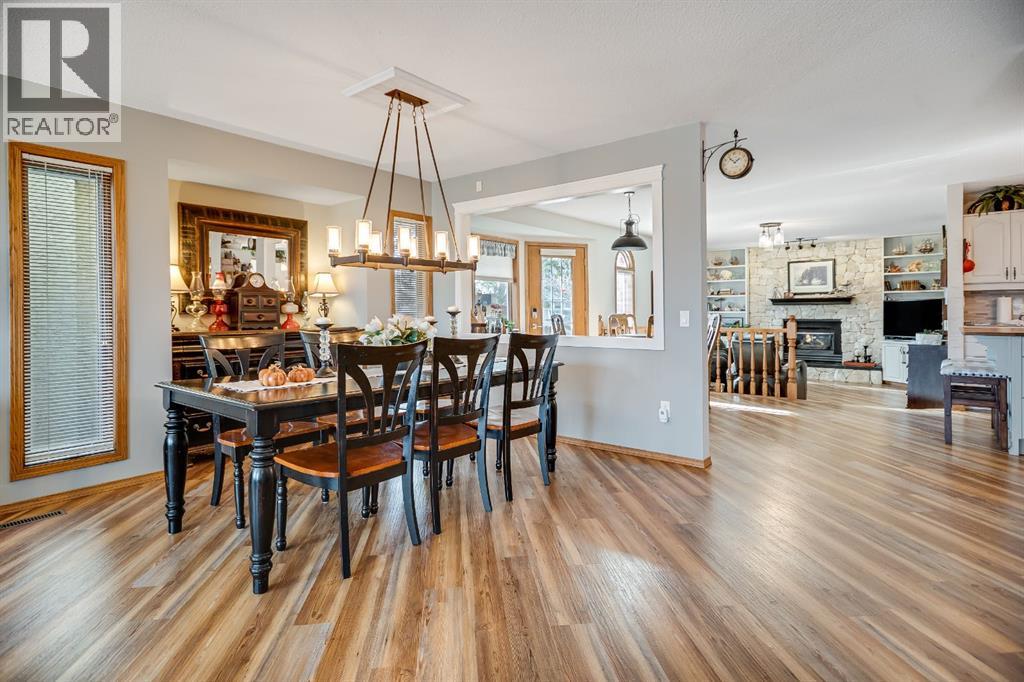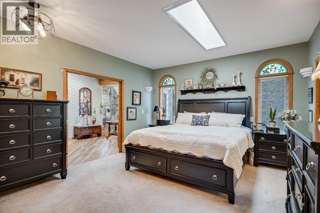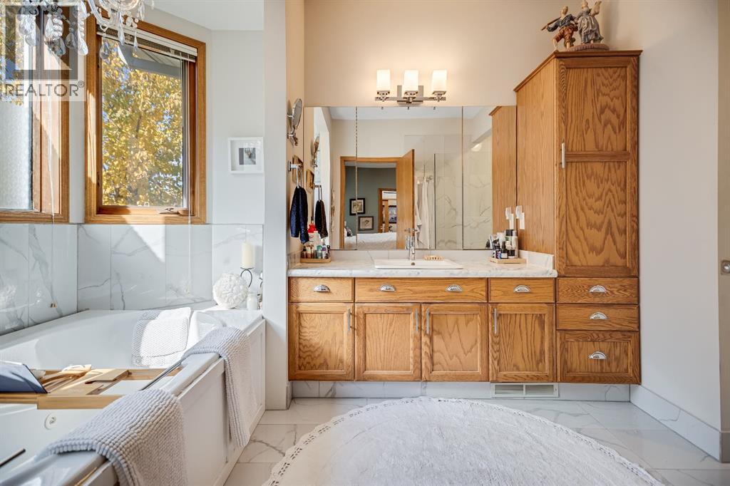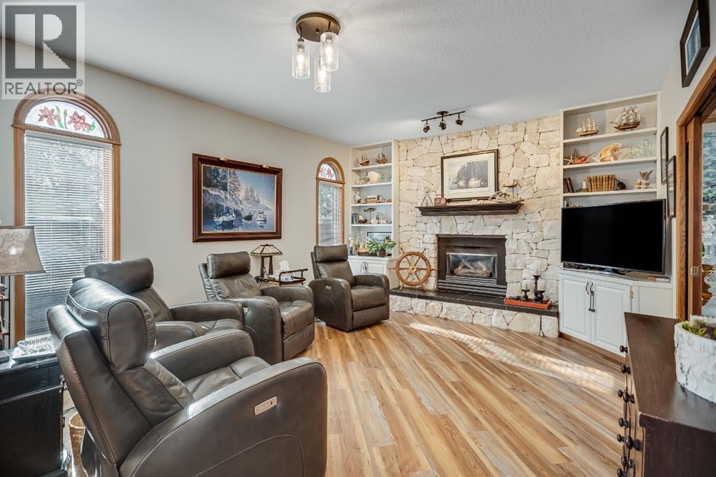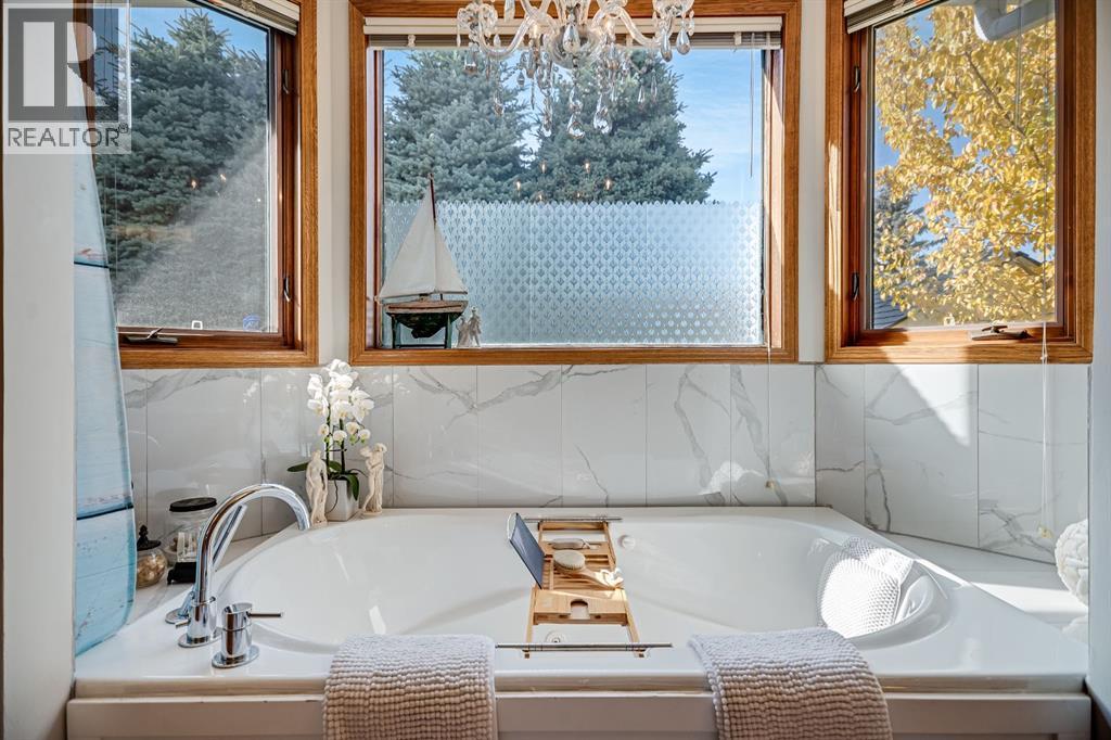 Experience the finest in living with this exceptional, fully finished 2367 sq ft bungalow across the street from Emerson Lake. Immaculately maintained and recently upgraded, this home boasts high-quality finishes, spacious, bright rooms, and a unique, welcoming layout you'll love.The main floor is an entertainer's delight, offering an open-concept living area, a formal dining room, and a cozy family room with a gas fireplace. It features a fantastic sunroom with a curved wall of windows and electric-shade-equipped skylights, plus a functional kitchen with a nook, updated appliances, and plenty of storage.The luxurious master suite is a true retreat with two exits, a walk-in closet, and a newly renovated 6-piece ensuite featuring a spacious glass shower and soaker tub. Two additional bedrooms (one an ideal office) and a dedicated laundry room complete the main level, all updated with new vinyl plank flooring, updated fixtures, and modern hardware.The fully finished basement expands your living space with a huge games room (pool table included!), a bedroom, an office, and a massive workshop/storage area with the comfort of in-floor heating.Outside, you'll find a private, west-facing backyard oasis. Surrounded by a wall of mature spruce trees, the patio offers incredible privacy. It features three water features, landscaping, fruit trees, and a timed irrigation system. Practical extras include a super-sized double attached garage, air conditioning (new furnace/AC), two new hot water tanks, and a concrete tile roof. (id:53676)