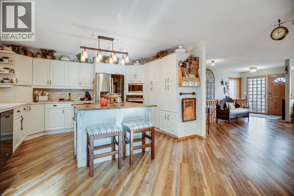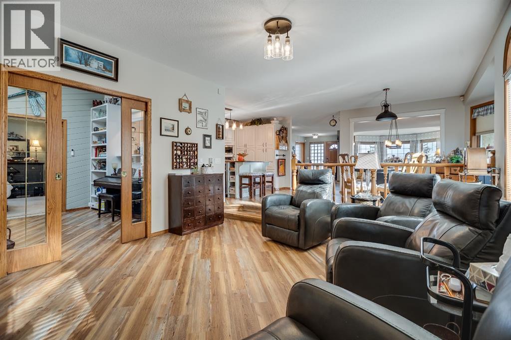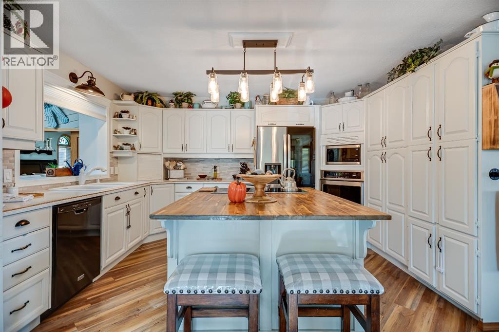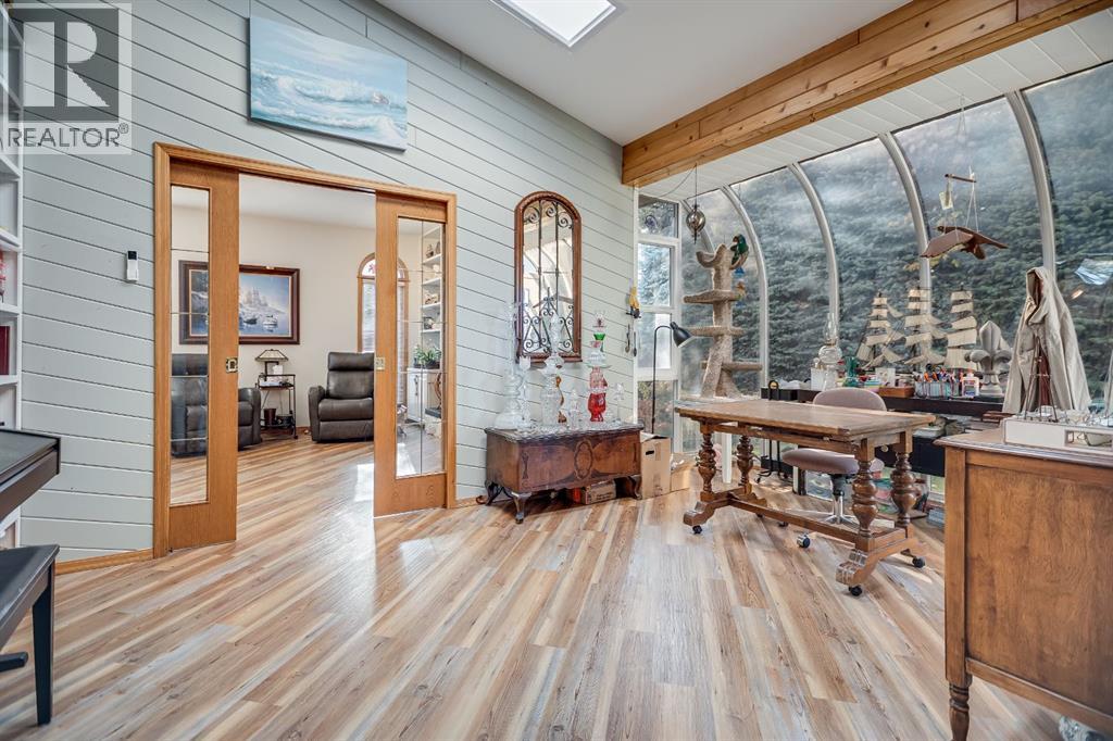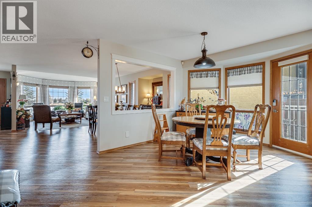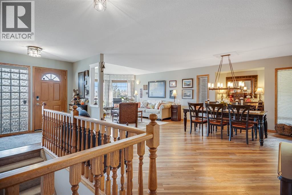 Experience the finest in living with this exceptional, fully finished 2367 sq ft bungalow across the street from Emerson Lake. Immaculately maintained and recently upgraded, this home boasts high-quality finishes, spacious, bright rooms, and a unique, welcoming layout you'll love.The main floor is an entertainer's delight, offering an open-concept living area, a formal dining room, and a cozy family room with a gas fireplace. It features a fantastic sunroom with a curved wall of windows and electric-shade-equipped skylights, plus a functional kitchen with a nook, updated appliances, and plenty of storage.The luxurious master suite is a true retreat with two exits, a walk-in closet, and a newly renovated 6-piece ensuite featuring a spacious glass shower and soaker tub. Two additional bedrooms (one an ideal office) and a dedicated laundry room complete the main level, all updated with new vinyl plank flooring, updated fixtures, and modern hardware.The fully finished basement expands your living space with a huge games room (pool table included!), a bedroom, an office, and a massive workshop/storage area with the comfort of in-floor heating.Outside, you'll find a private, west-facing backyard oasis. Surrounded by a wall of mature spruce trees, the patio offers incredible privacy. It features three water features, landscaping, fruit trees, and a timed irrigation system. Practical extras include a super-sized double attached garage, air conditioning (new furnace/AC), two new hot water tanks, and a concrete tile roof. (id:53676)