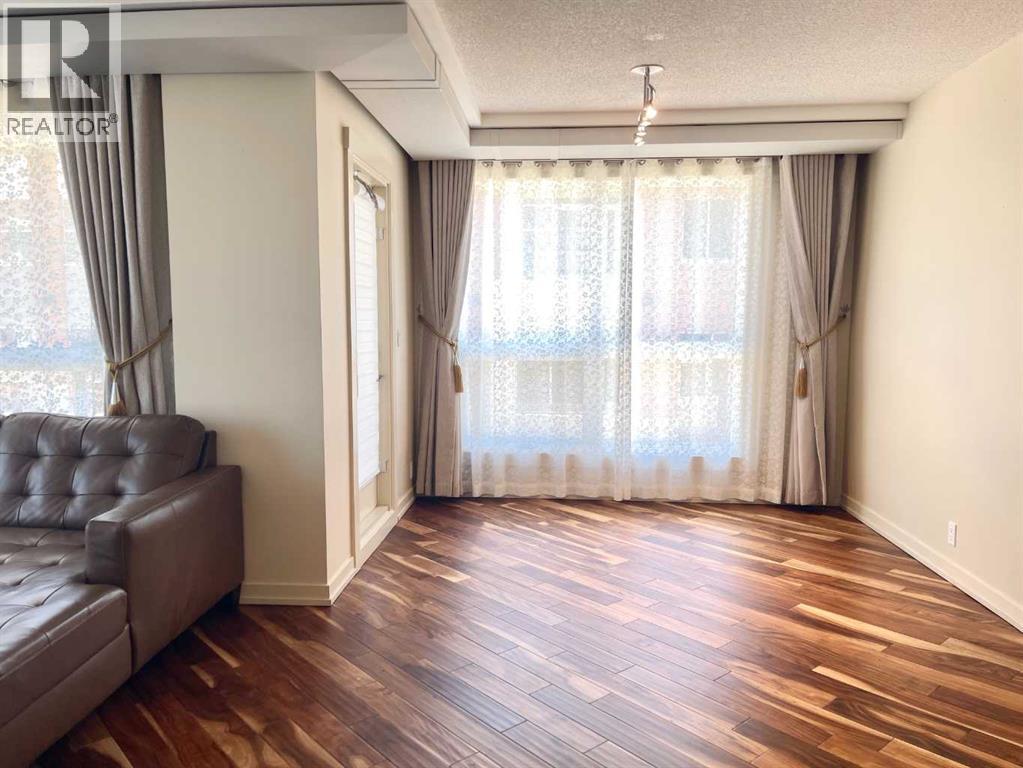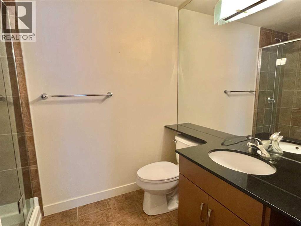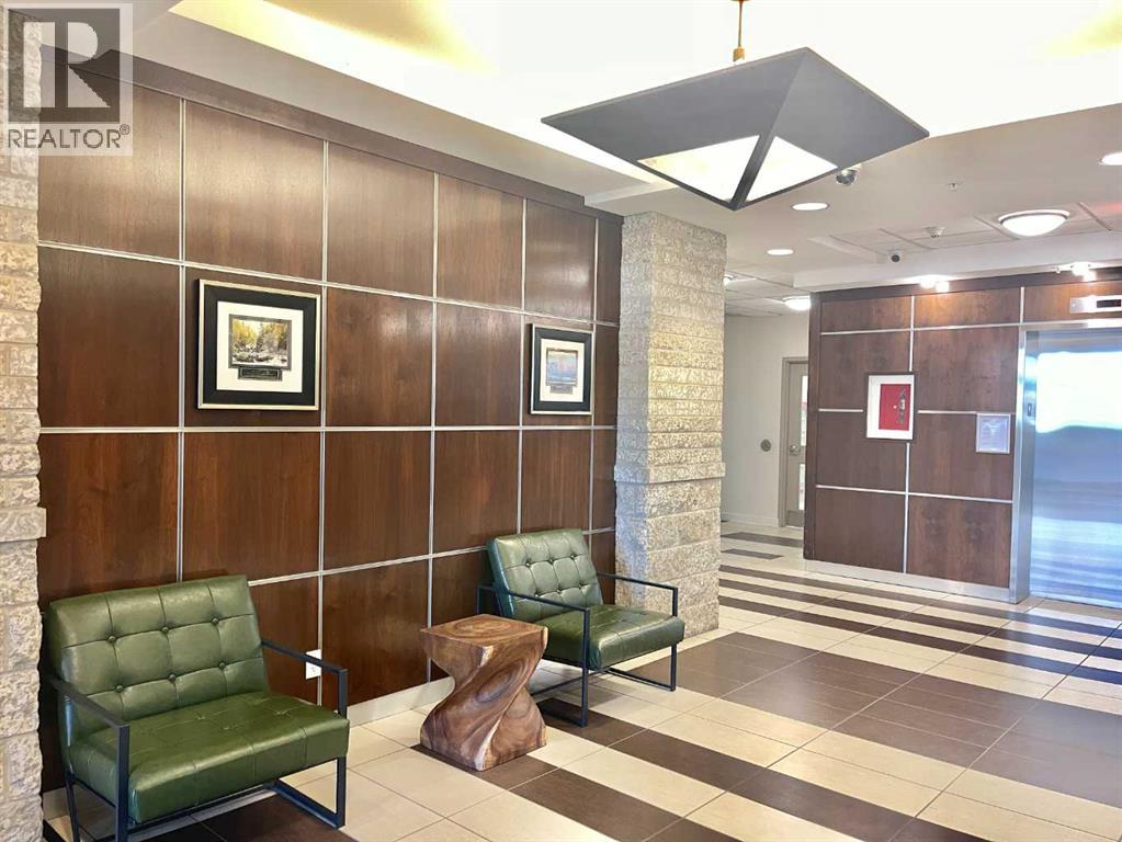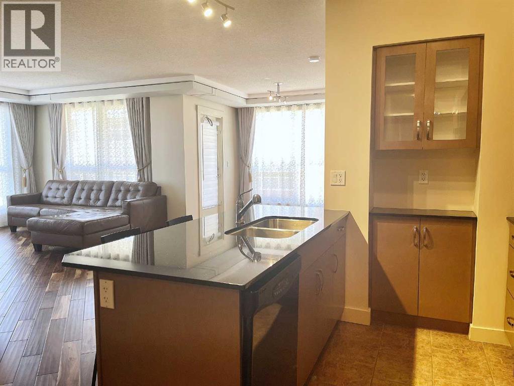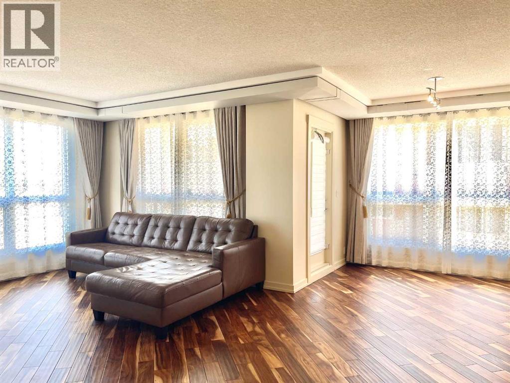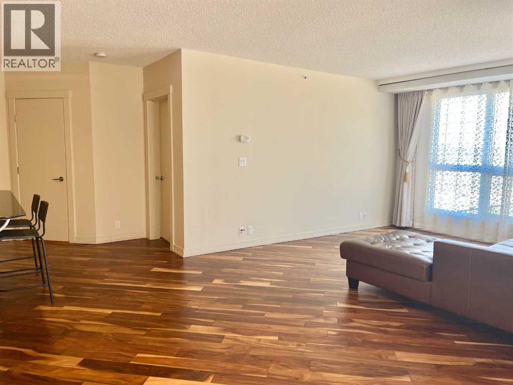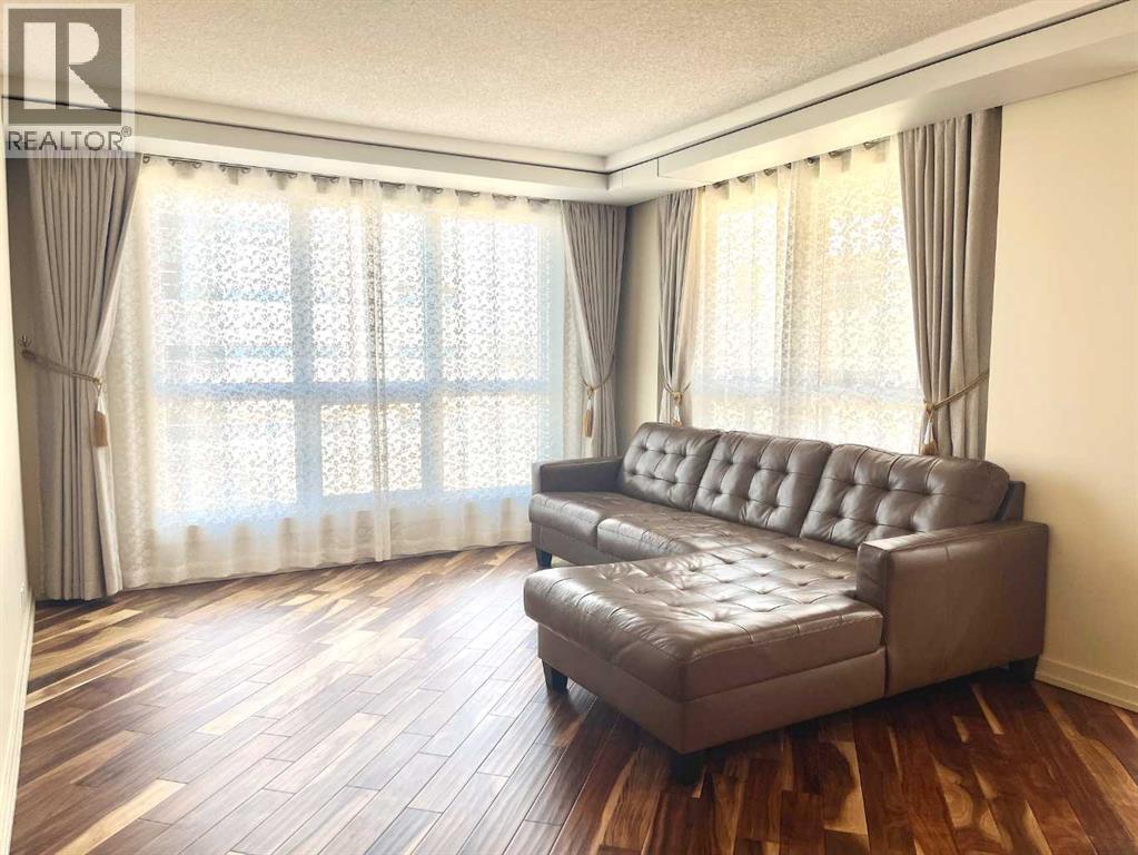 Presenting the largest corner unit in the building—an exceptional 2-bedroom, 2-bathroom residence offering 1,038 square feet of thoughtfully designed living space. This upgraded residence features stylish engineered hardwood flooring and an open concept floor plan. A spacious and welcoming foyer with a double closet sets a sophisticated tone upon entry. Expansive windows throughout the unit allow for an abundance of natural light, further enhanced by the addition of elegant, customized double-layer curtains that provide both privacy and light control. The modernized kitchen is outfitted with updated cabinetry and striking black granite countertops, complemented by a suite of matching black appliances. The generous living room offers ample space for comfortable seating arrangements, with an adjacent dining area that opens to a private balcony featuring pleasant views. The primary bedroom includes a well-appointed four-piece ensuite, adding to the home's overall functionality and comfort. Residents will appreciate the building’s direct access to essential amenities, including nearby grocery stores and restaurants, all reachable without the need for elevator use. A convenient door one level below provides quick, weather-free access to Save-On-Foods via the 4th-floor parkade. Additional features include on-site security, a dedicated concierge, and ample indoor and guest parking. Situated in a highly desirable location within walking distance of numerous services and conveniences, this professionally upgraded unit with a sought-after layout represents exceptional value in today’s market. (id:53676)