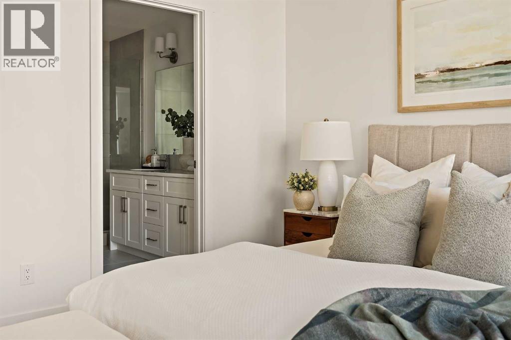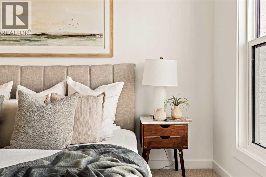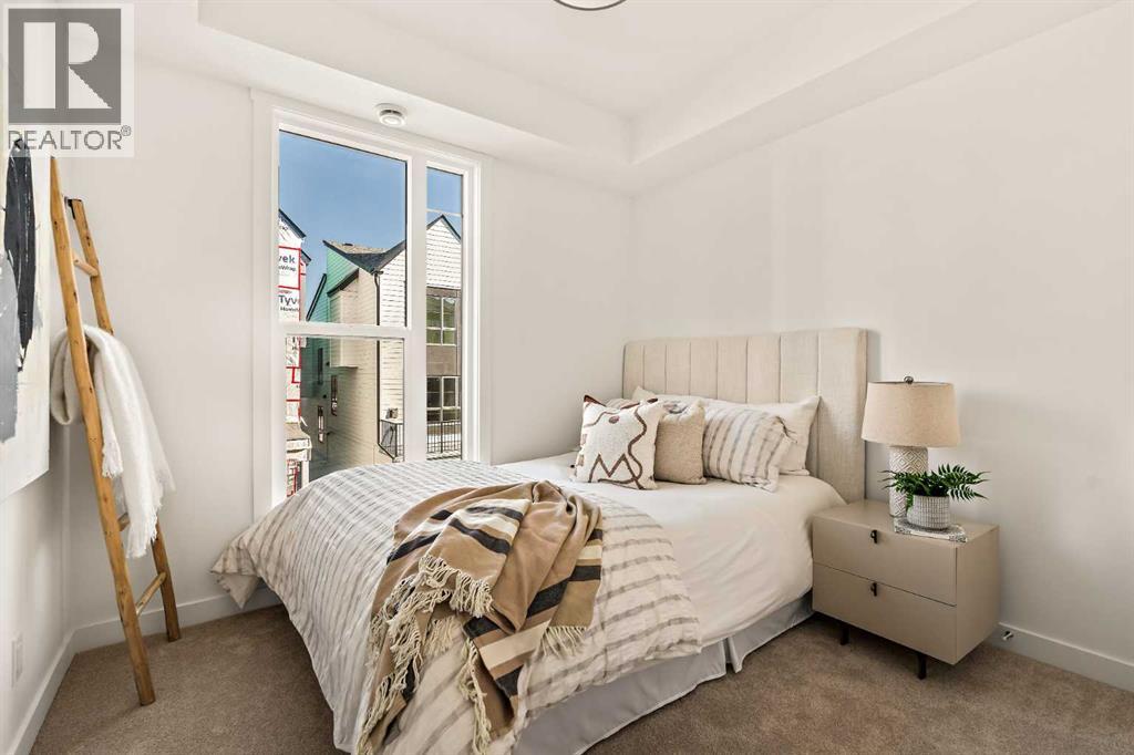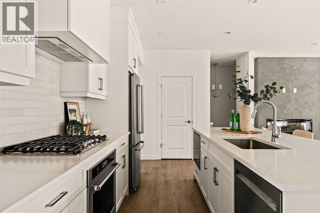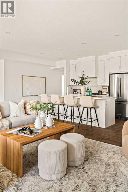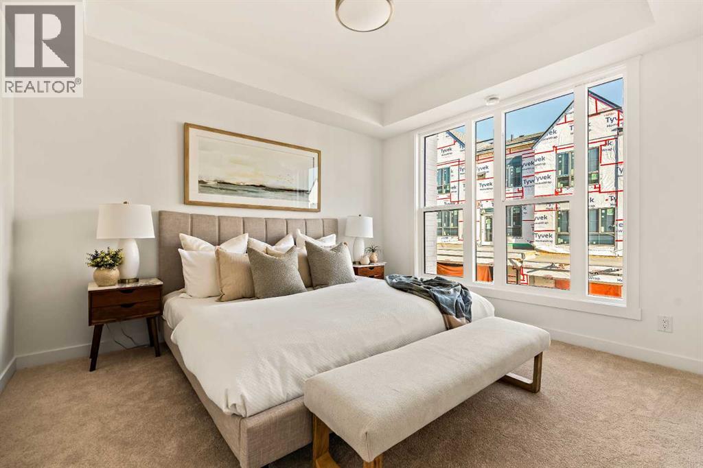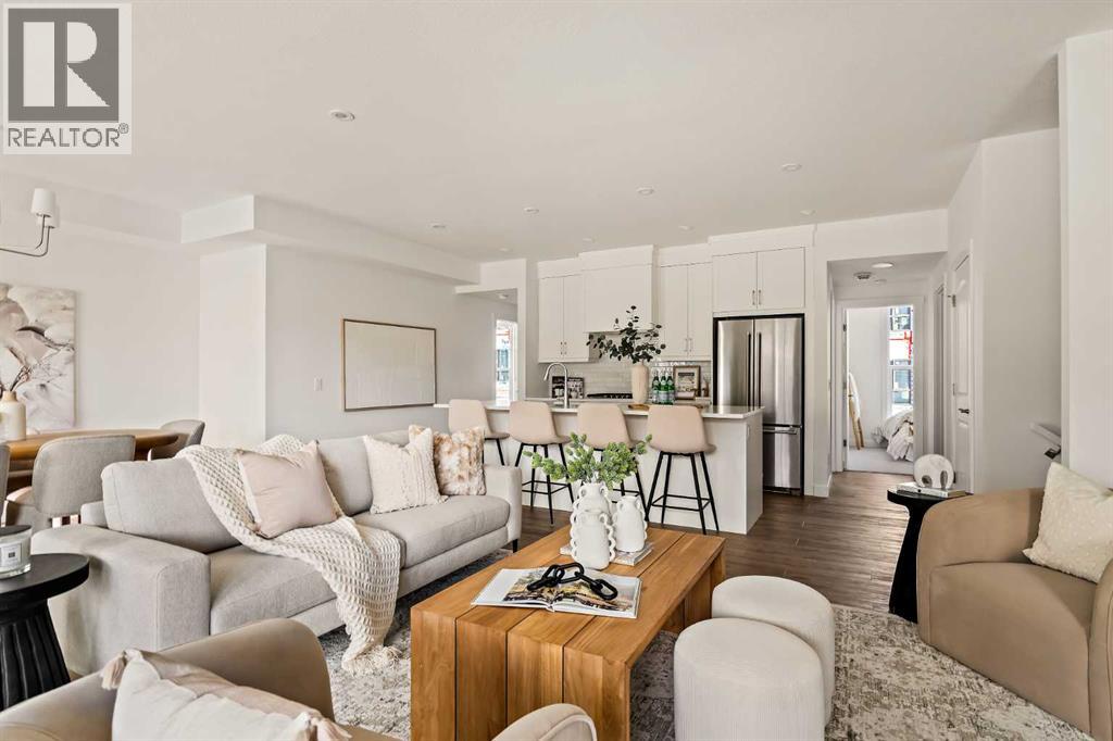 Welcome to the Regent at Crown Park - a thoughtfully designed townhouse that offers single-level bungalow style living without compromise. Designed with down-sizers in mind, this maintenance-free townhouse combines a bungalow lifestyle with a double attached garage - all while giving you a maintenance-free lifestyle, perfect for those who travel, or simply just don't want the hassle of exterior maintenance, landscaping or snow removal! This brand new 3 bedroom, 2 bathroom townhome has nearly 1,300 ft2 of living space over one level and a lower level with virtually endless storage and a private double attached garage! The brilliantly designed living area was created for entertainment with a central kitchen that opens to the living and dining areas with a wall of windows that flood the space with natural light. The timeless kitchen has white shaker cabinets, light quartz countertops and a suite of built-in appliances including a chimney hood fan, gas cooktop and built-in oven. The sprawling kitchen overlooks both the living and dining areas, ensuring the chef is never left out. A central fireplace with floor-to-ceiling plaster finish anchors the main living area with ample space for 6 to sit comfortably. The large dining area has space for a table and buffet if desired, providing flexible furnishing options to meet your needs. The primary suite is located at the back of the home and features a large walk-in closet and spa-inspired ensuite with dual sinks and a tiled walk-in shower. The centrally located laundry room, complete with upper cabinetry and a countertop for added convenience, perfectly separates the primary suite from secondary rooms for optimal privacy. Two additional bedrooms and a full bathroom round out this expansive single-level living space. The secondary rooms provide added flexibility for a guest room(s), home office, media room or studio space - while keeping a broad appeal for resale value. The lower level has a large storage room and oversized ut ility room (~17'x7') that could easily be used for a hobby space. An oversized double attached garage completes the interior of the home. Lastly, a large covered southwest-facing patio, spanning over 26' wide, provides the perfect outdoor living space with views overlooking the park and is complete with a gas line and hose bib for added convenience to everyday living. A bungalow style townhouse with a double attached garage is an exceptionally rare find - don't let this opportunity pass by. Purchase with peace of mind - this brand new home includes a comprehensive builder warranty + Alberta New Home Warranty. Located just minutes from downtown, countless amenities and in an established and developed area, you can move into your new home with confidence - knowing all that is around your beautiful new home. (id:53676)