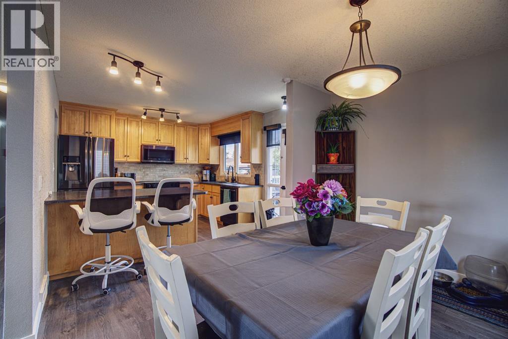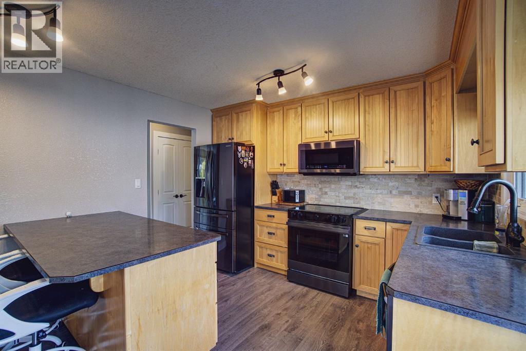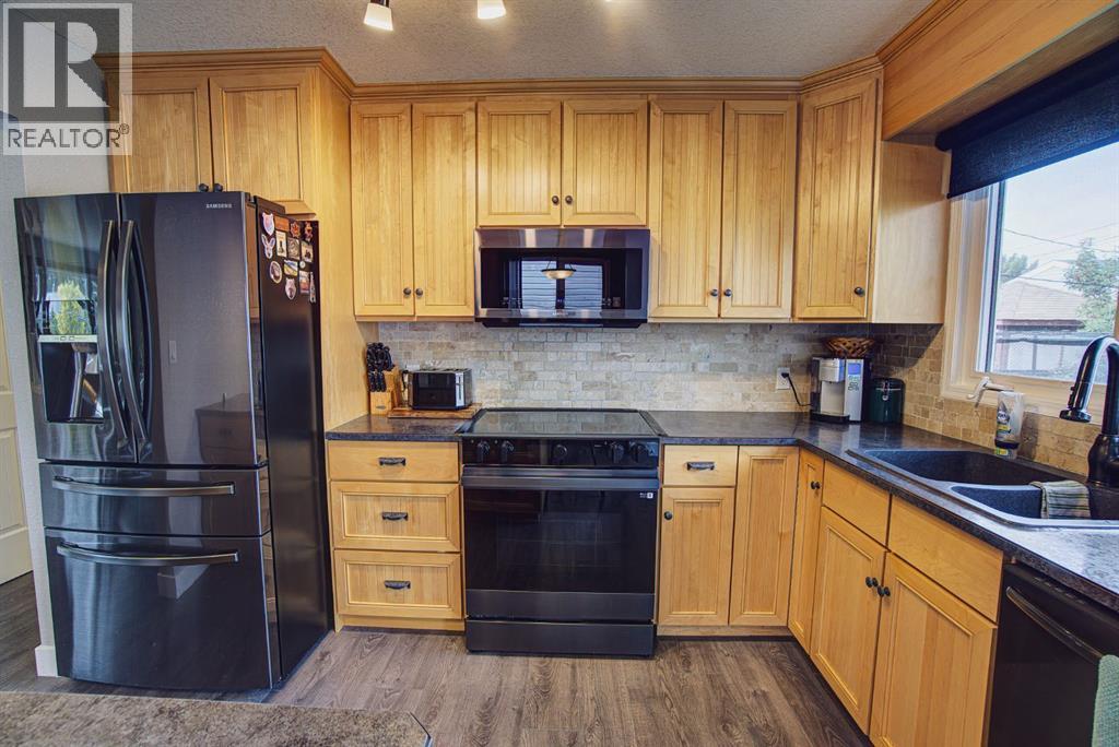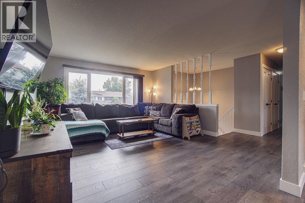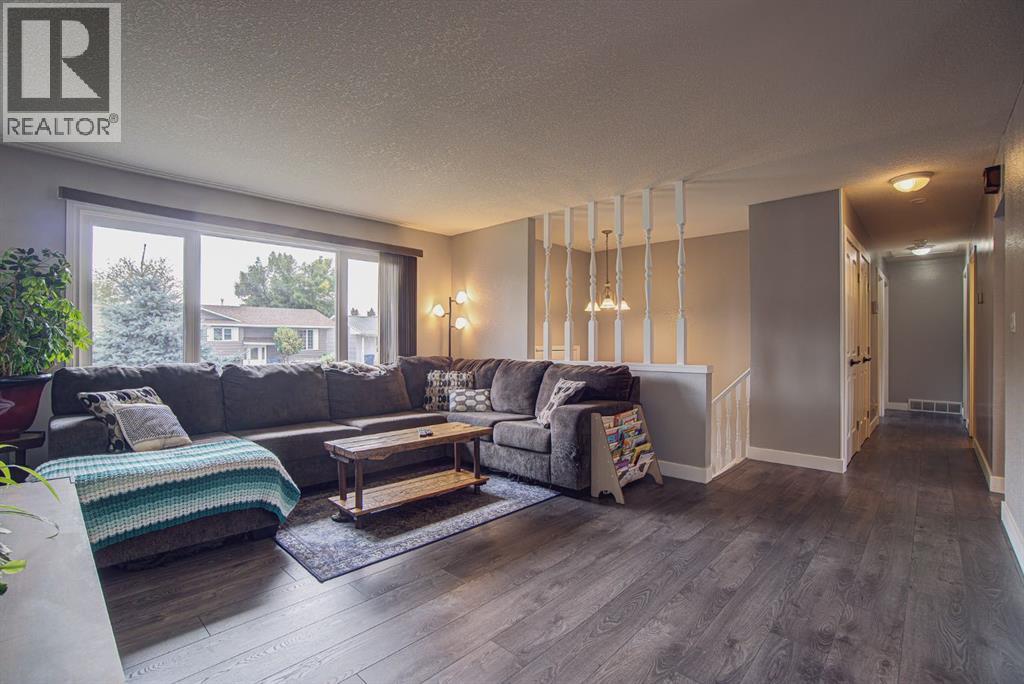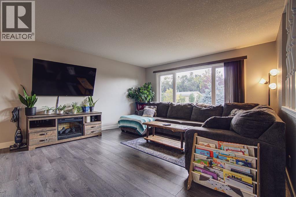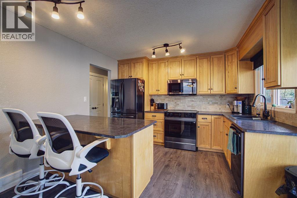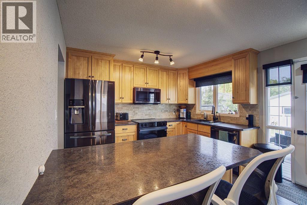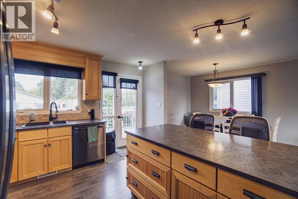 Welcome to this inviting bi-level home, perfectly designed for both comfort and functionality. The main floor offers a bright and spacious front living room with huge south-facing windows that flood the space with natural light. The beautifully updated kitchen features classic shaker-style cabinets, newer appliances, and a convenient eat-up counter, while the adjoining dining area provides direct access to the backyard and deck. Three bedrooms complete the main level, including a primary suite with a view of the backyard and its own private 2-piece ensuite. Stylish laminate flooring, updated baseboards, and a refreshed 4-piece main bath bring a modern touch throughout the space. The fully developed lower level makes the most of the bi-level design with its larger windows, creating a warm and welcoming atmosphere. Here you’ll find a private and spacious family room, two additional bedrooms—one with enough room for a home office area—and a 3-piece bathroom. Step outside to enjoy the upgraded north-facing deck, perfect for entertaining. The backyard is well set up with back alley access, RV parking, plenty of space for toys or a garden and a spacious garage. Just a few blocks from Lions Park and within easy reach of downtown, schools, and walking paths, this home combines small-town charm with everyday convenience. (id:53676)