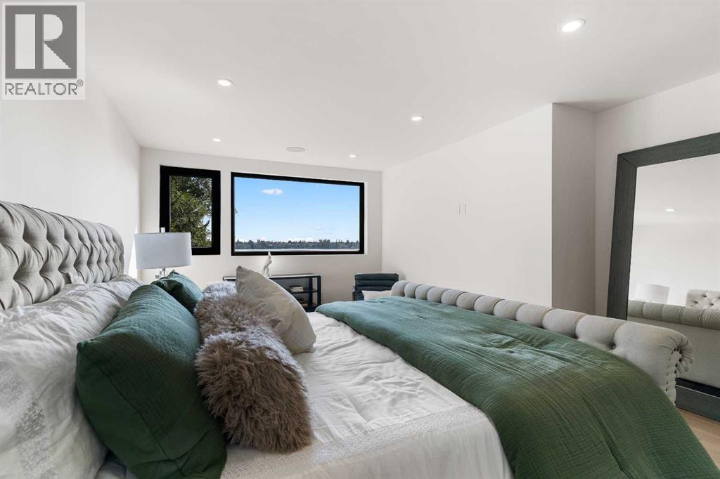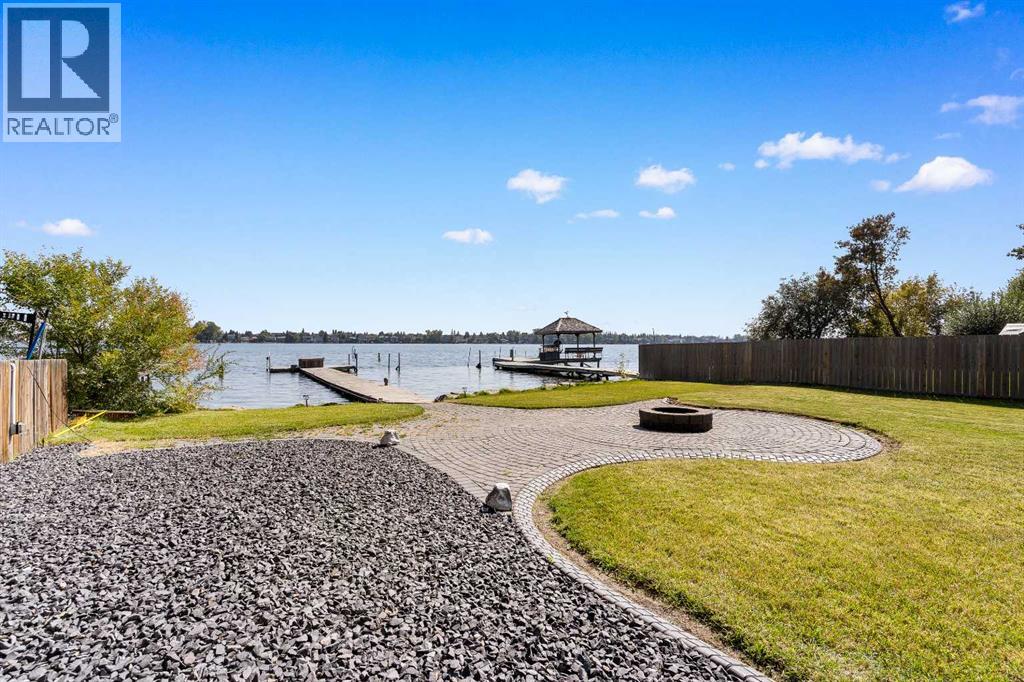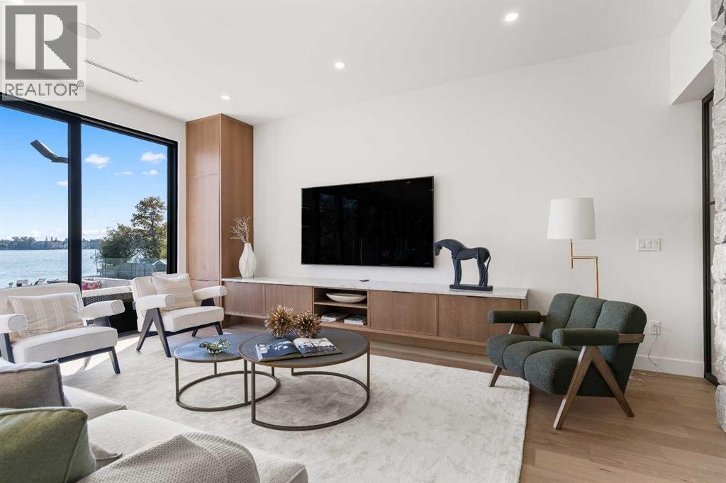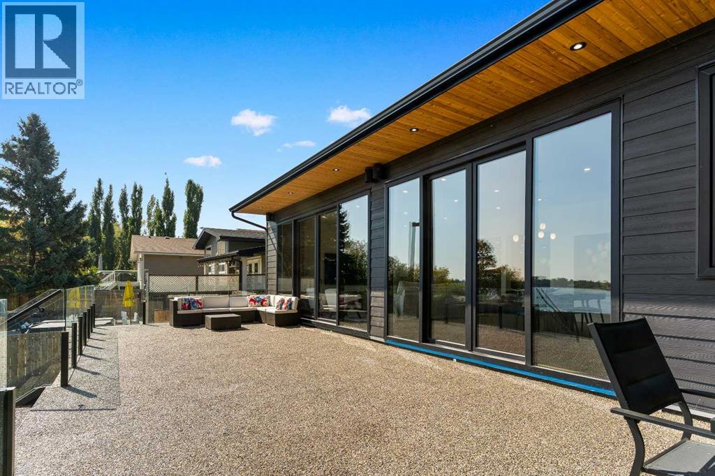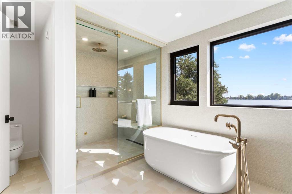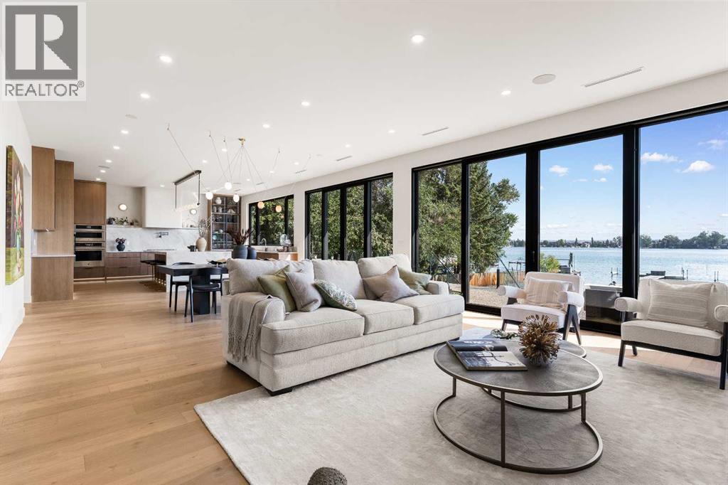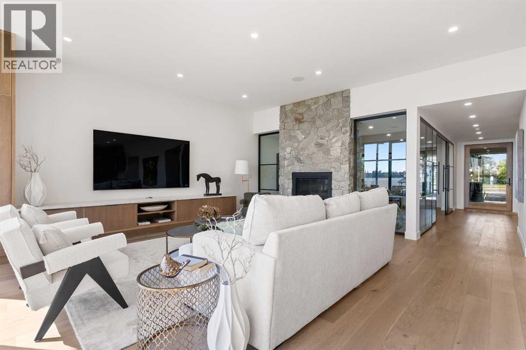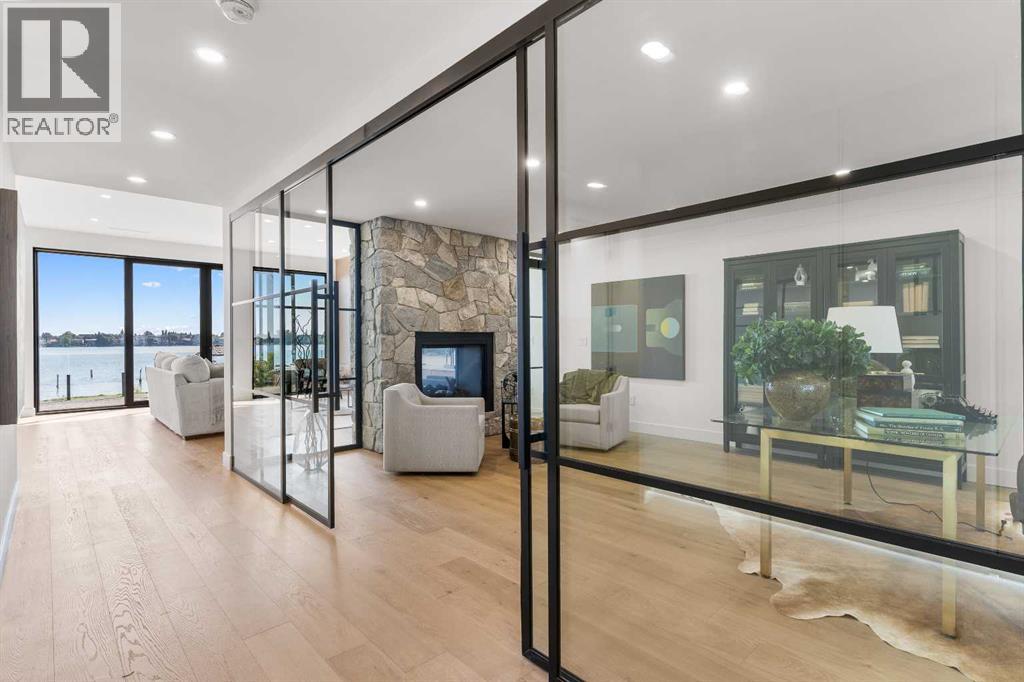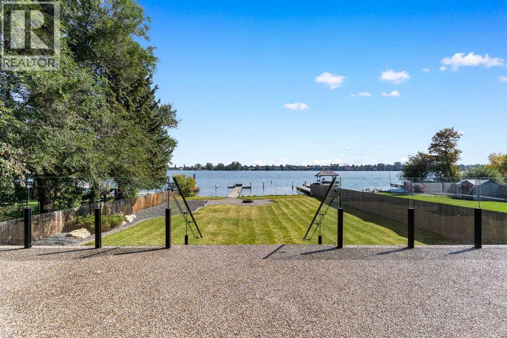 *Welcome to Lakeside Luxury on Chestermere Lake* With 4,482 sq. ft. of fully reimagined living space, this lakefront estate blends architectural sophistication with modern comfort on one of Chestermere Lake’s most exclusive stretches of shoreline. This complete renovation and design is an intricate remodel + extension, showcasing soaring 10’ ceilings, bespoke finishes, and walls of glass that capture sweeping water views. The foyer, framed by a 4 ft. Lux custom glass door, makes a bold first impression with a glass~encased home office and a see~through fireplace leading into the stunning living room. Floor~to~ceiling windows and European sliding doors create seamless flow to the outdoors, where a massive backyard, fire pit, and private dock invite year~round entertaining. At the heart of the home, the chef’s kitchen is a masterpiece ~ anchored by a Taj Mahal quartzite island, complemented by JennAir appliances, a butler’s pantry, and a limewashed plaster custom hood fan that compliments the natural stone backsplash. Brizo plumbing fixtures in champagne bronze + matte black, Lo & Co + Emtek hardware; and custom~designed lighting elevate every detail, while white oak cabinets and hardwood floors add warmth and texture throughout the home. A spacious mudroom that rivals the aesthetic of any competing luxury home, leads to the 4~car garage with a tucked~away workshop. The garage floor was transformed with a stunning, heated, metallic epoxy finish, providing both beauty and durability. LED sensors throughout the home create an unrivalled nighttime ambiance, and an exposed epoxy rear deck extends the entertaining space. Upstairs, a vaulted bonus room with the home’s original fireplace nods to its heritage, while a dual~desk workstation in the hallway adds functional elegance. Two secondary bedrooms and two larger master waterfront retreats capture lakeside serenity perfectly. The primary suite is pure indulgence, featuring a spa inspired ensuite with a steam shower, heate d bench and floors, which flows seamlessly to a massive walk in closet with micro~shaker drawers and velvet encasements. Even the laundry room makes a statement, with classic black and white checkered flooring adding a charming and whimsical touch to this architectural marvel. This is more than a home ~ it’s a statement in design, craftsmanship, and lakefront living. (id:53676)
