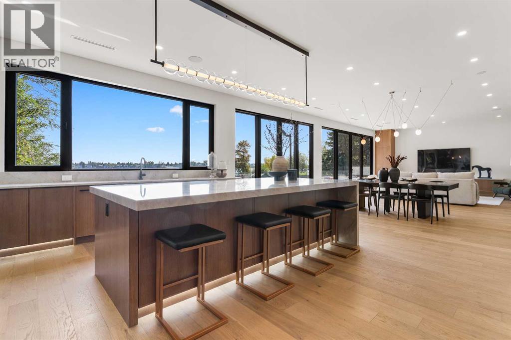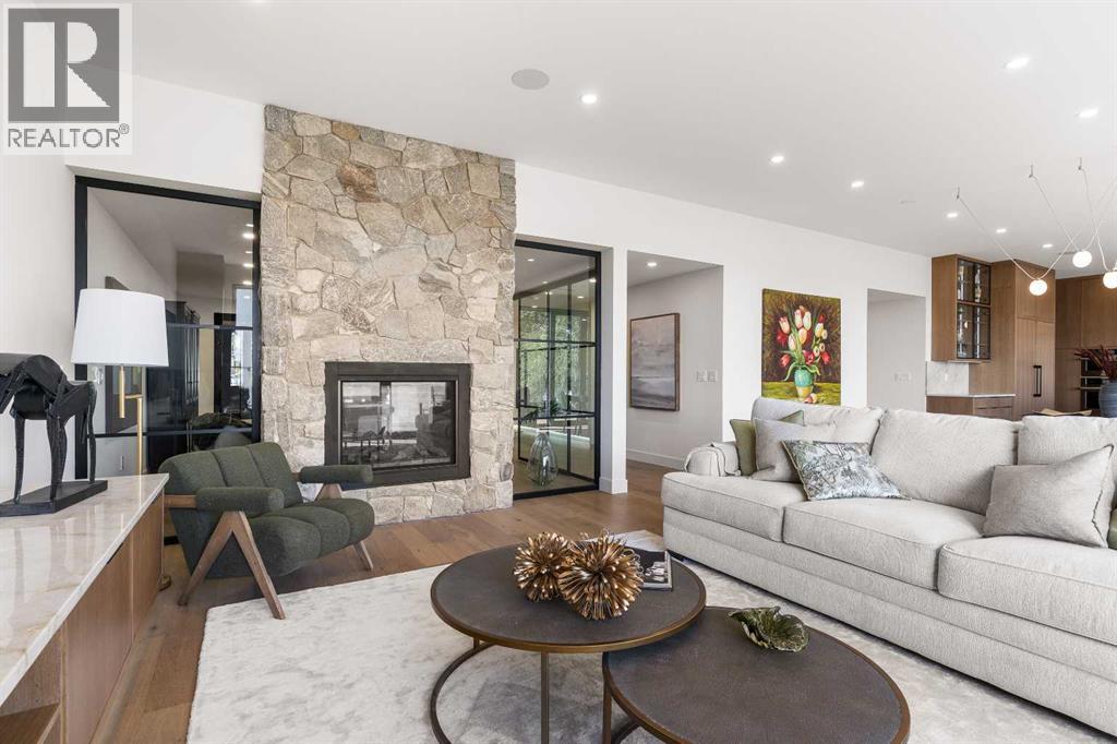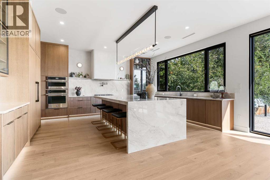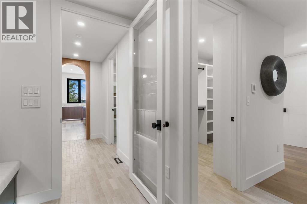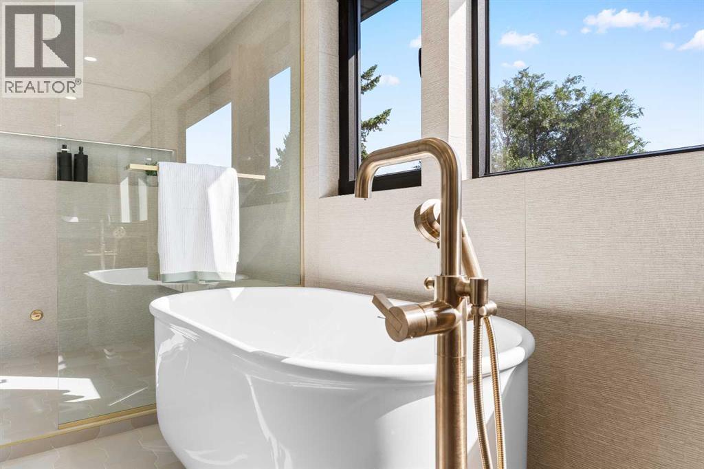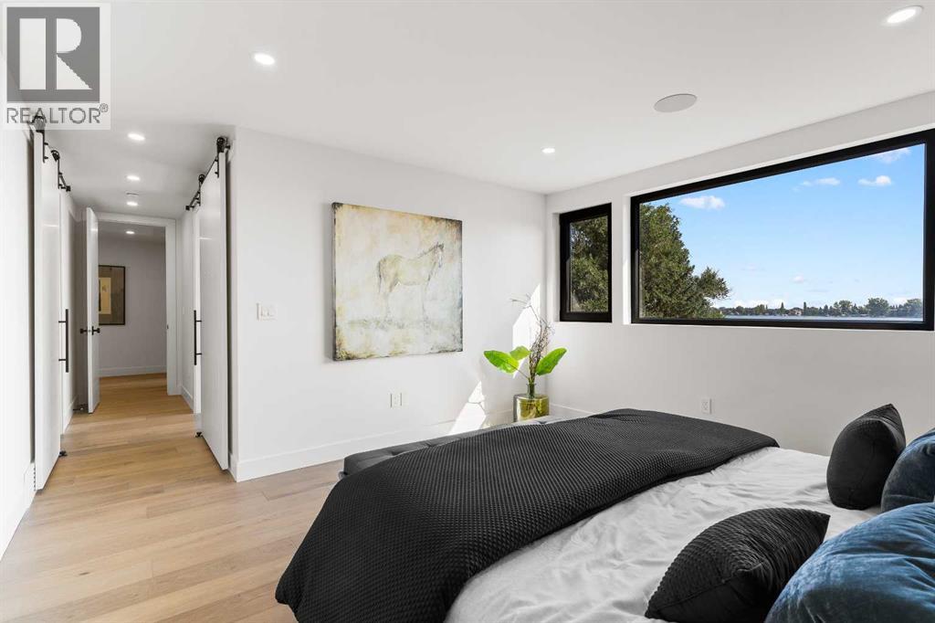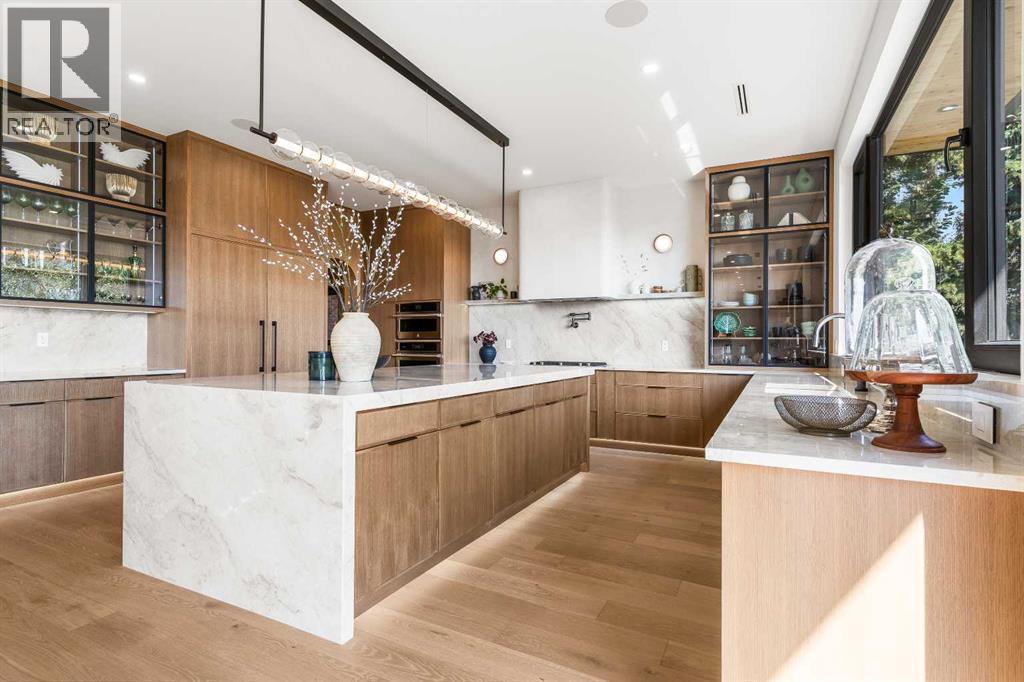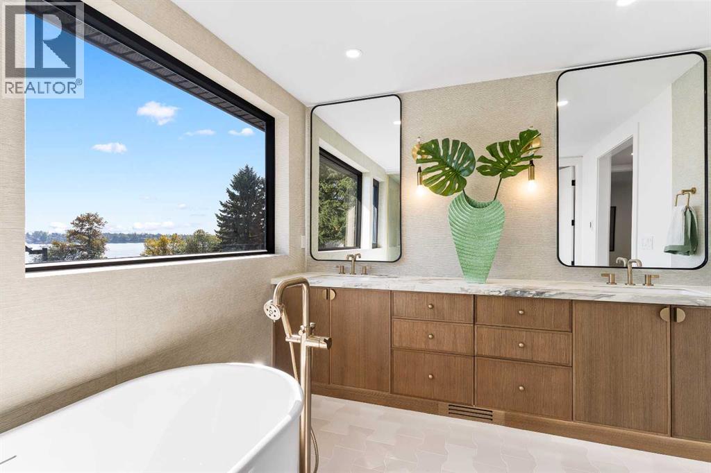 *Welcome to Lakeside Luxury on Chestermere Lake* With 4,482 sq. ft. of fully reimagined living space, this lakefront estate blends architectural sophistication with modern comfort on one of Chestermere Lake’s most exclusive stretches of shoreline. This complete renovation and design is an intricate remodel + extension, showcasing soaring 10’ ceilings, bespoke finishes, and walls of glass that capture sweeping water views. The foyer, framed by a 4 ft. Lux custom glass door, makes a bold first impression with a glass~encased home office and a see~through fireplace leading into the stunning living room. Floor~to~ceiling windows and European sliding doors create seamless flow to the outdoors, where a massive backyard, fire pit, and private dock invite year~round entertaining. At the heart of the home, the chef’s kitchen is a masterpiece ~ anchored by a Taj Mahal quartzite island, complemented by JennAir appliances, a butler’s pantry, and a limewashed plaster custom hood fan that compliments the natural stone backsplash. Brizo plumbing fixtures in champagne bronze + matte black, Lo & Co + Emtek hardware; and custom~designed lighting elevate every detail, while white oak cabinets and hardwood floors add warmth and texture throughout the home. A spacious mudroom that rivals the aesthetic of any competing luxury home, leads to the 4~car garage with a tucked~away workshop. The garage floor was transformed with a stunning, heated, metallic epoxy finish, providing both beauty and durability. LED sensors throughout the home create an unrivalled nighttime ambiance, and an exposed epoxy rear deck extends the entertaining space. Upstairs, a vaulted bonus room with the home’s original fireplace nods to its heritage, while a dual~desk workstation in the hallway adds functional elegance. Two secondary bedrooms and two larger master waterfront retreats capture lakeside serenity perfectly. The primary suite is pure indulgence, featuring a spa inspired ensuite with a steam shower, heate d bench and floors, which flows seamlessly to a massive walk in closet with micro~shaker drawers and velvet encasements. Even the laundry room makes a statement, with classic black and white checkered flooring adding a charming and whimsical touch to this architectural marvel. This is more than a home ~ it’s a statement in design, craftsmanship, and lakefront living. (id:53676)