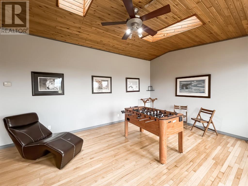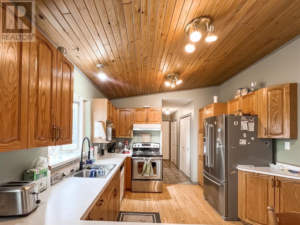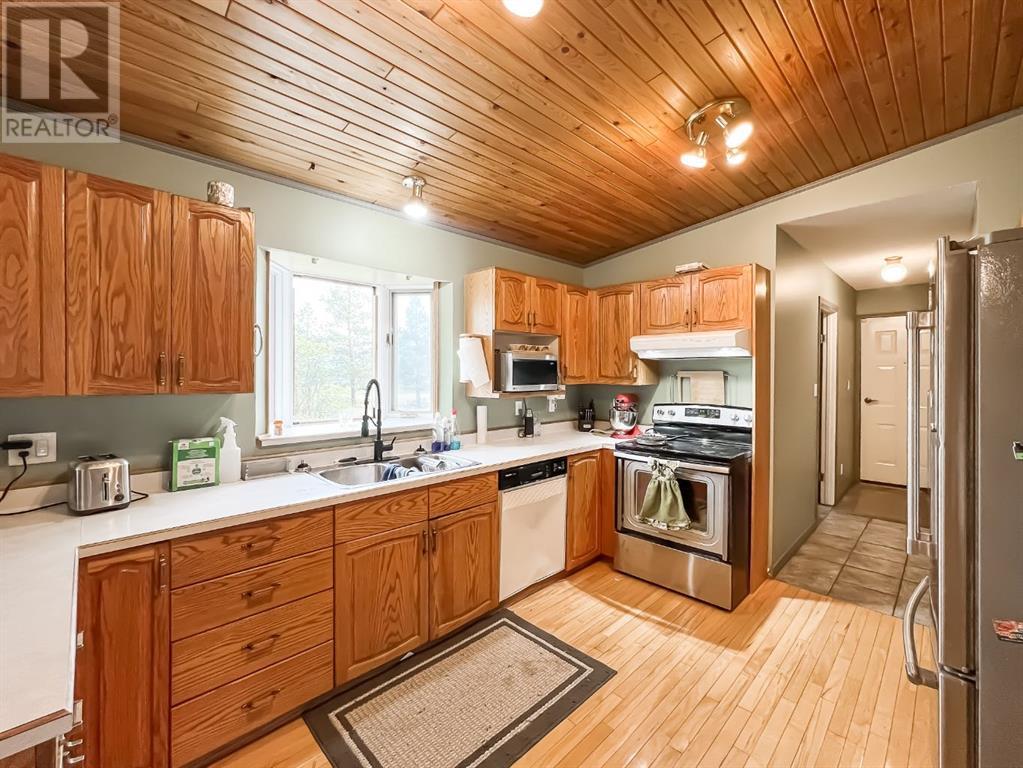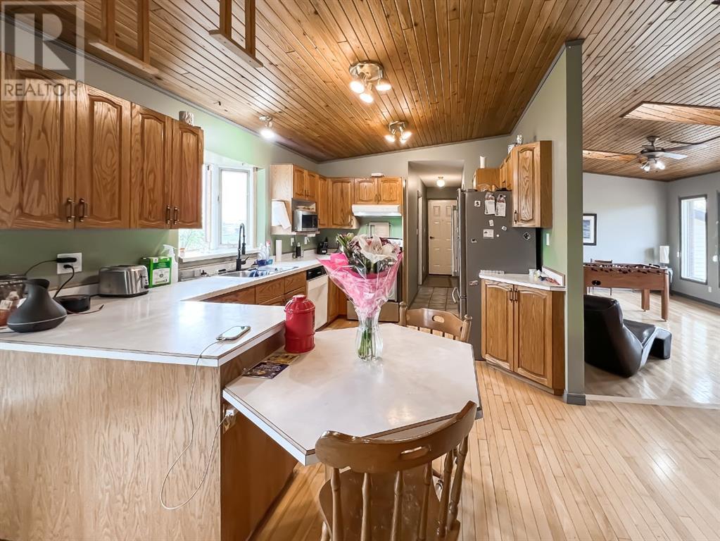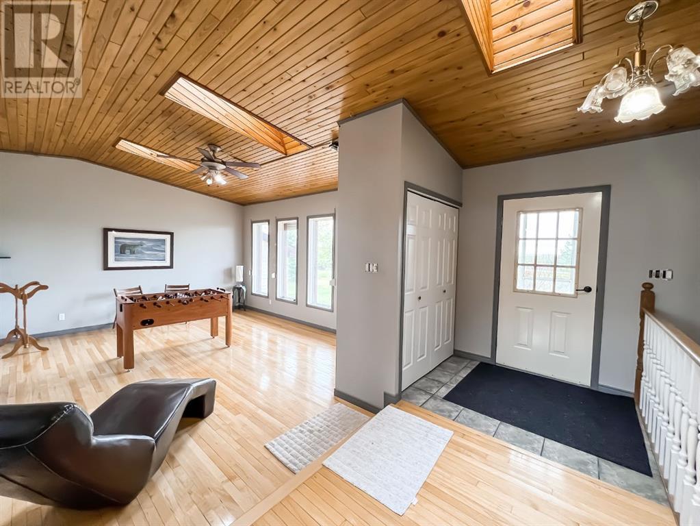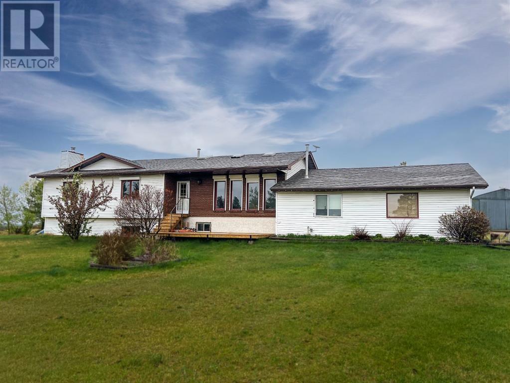 Welcome to this stunning 5-bedroom, 2-bathroom home set on an expansive 8.82-acre acreage, on beautiful crown land, offering the perfect blend of country living and modern convenience. As you enter the home, you'll immediately appreciate the abundance of natural light streaming through the beautiful skylights throughout the house. These skylights, combined with numerous large windows, illuminate the spacious interiors and highlight the natural woodwork finishes, creating a warm and inviting atmosphere. The gorgeous living area is bathed in natural light thanks to the skylights and large windows, providing a serene and airy ambiance. The kitchen is a chef's delight, boasting an abundance of cabinetry and countertop space, along with an eat-up bar perfect for casual dining. The adjoining dining area features patio doors that open to a deck, ideal for outdoor dining and entertaining. The primary bedroom features a large walk-in closet and direct access to a 4-piece bathroom, which also includes a skylight for added brightness. Two additional bedrooms on the main floor provide ample space for family or guests, and the dedicated laundry room adds to the home's convenience. Downstairs, a cozy yet spacious family room awaits, complete with a beautiful stone wood-burning fireplace and a wet bar, making it perfect for hosting and entertaining. This lower level also includes two more bedrooms, an office, and a large storage room, as well as direct access to the garage. Outside, you'll find a double-car garage for parking convenience, a large 40x60 shop, and a shed for all your storage needs. The 8.82-acre property is beautifully treed and adorned with many perennials, creating your own private country retreat. Despite its tranquil setting, the home is in close proximity to town, offering the best of both worlds. Don't miss this opportunity to experience country living at its finest. Check it out today! (id:53676)