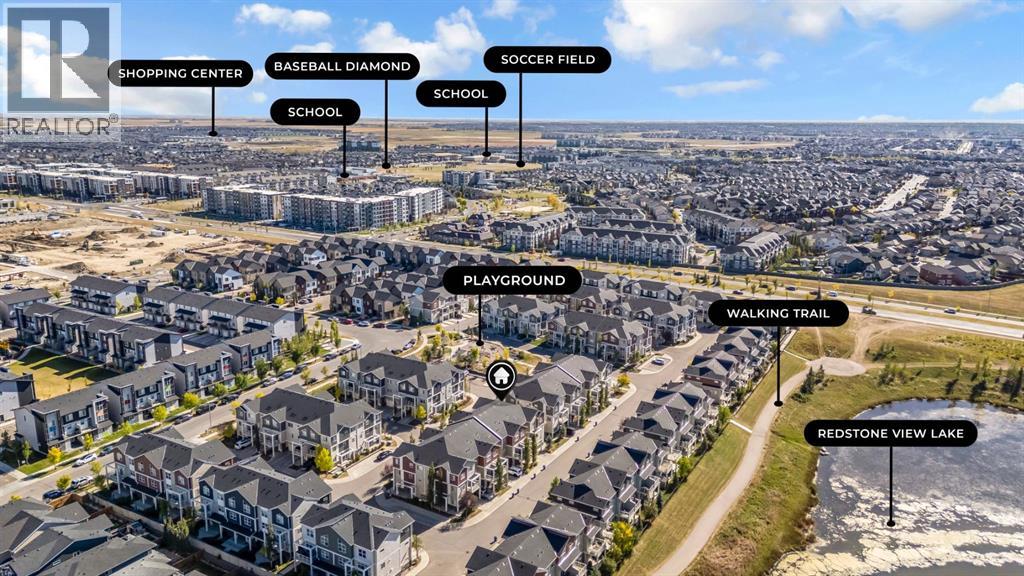 Welcome to this beautifully maintained CORNER unit offering exceptional space and convenience in Redstone. Featuring 4 spacious bedrooms and 2.5 bathrooms, this home is perfect for families or anyone seeking extra room to grow. The bright, open layout is FRESHLY PAINTED and PROFESSIONALLY CLEANED, providing a true move-in ready experience. The main floor consists of a large foyer with access to the garage and bedroom. The second floor features a bright, open layout living area featuring a beautiful kitchen with upgraded stainless steel appliances and island. The open layout of the kitchen, sizeable centre island, dining room and living room make it perfect for entertaining. The huge patio area easily fits a small patio set to sit and relax with a natural gas line hook up ready for your barbecue. The upper floor features a huge master bedroom with a walk-in closet and attached ensuite. There are 2 more spacious bedrooms and a full bathroom on the top floor. Enjoy the convenience of an attached single garage plus full driveway, giving you ample parking and storage. With its corner location, this home also benefits from extra windows and natural light throughout. Located in a very quiet location across from a park and future school site, in a family oriented community of Redstone! This home is close to all amenities like stores, mall, airport, bus stop, groceries and easy access to Stoney Trail and Deerfoot. (id:53676)