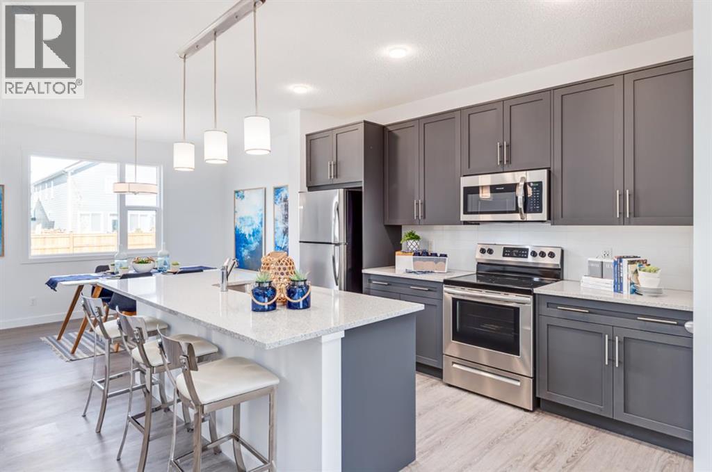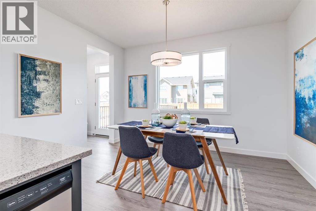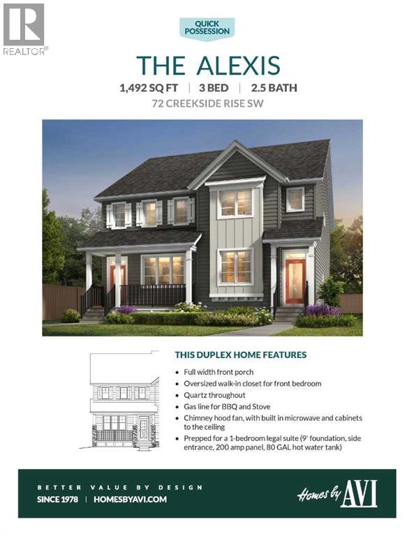 Say hello to 72 Creekside Rise SW—a brand-new, two-storey duplex in the ESTATE PHASE of Sirocco at Pine Creek that’s turning heads for all the right reasons. This is the Alexis model from Homes by Avi, a builder known for smart design, standout finishes, and future-friendly features that go beyond the ordinary. Whether you're a first-time buyer, a savvy investor, or someone who just knows a good thing when they see it—this one’s worth a closer look.Let’s talk curb appeal. This home sets the tone from the start with a FULL-WIDTH FRONT PORCH that practically begs for coffee sipping, book reading, and neighbour-waving. Step inside to nearly 1,500 square feet of thoughtfully planned living space. The main floor features a front living room with a 50" ELECTRIC FIREPLACE and custom TV niche, a central dining area, and a showstopper kitchen with QUARTZ COUNTERTOPS, 48" UPPER CABINETS, a CHIMNEY-STYLE HOOD FAN, BUILT-IN MICROWAVE, and rough-in for a gas stove.Upstairs, the layout is smart and family-friendly. The primary bedroom sits at the front of the home with a private ensuite and a generously OVERSIZED WALK-IN CLOSET. Two additional bedrooms offer flexible options for kids, guests, a home office—or all three over time. A conveniently located UPPER-FLOOR LAUNDRY ROOM helps keep the routine running smoothly, without overstating its footprint.But the real magic is in the foundation—literally. This home is BUILT FOR FUTURE FLEXIBILITY with a side entrance, 9' basement walls, and FULL ROUGH-INS for a lower-level kitchen, bathroom, and laundry. Whether you're planning for multigenerational living or exploring rental income potential, the setup is already in place. Plus, with a 200 AMP ELECTRICAL PANEL, upgraded 80-GALLON HOT WATER TANK and basement window, the groundwork is solid and ready when you are.Outside, enjoy a west-facing rear deck with a gas line for your BBQ, front yard sod already in place, and a 20' x 20' rear parking pad—perfect for future garage develo pment or off-street parking.Sirocco at Pine Creek offers the BEST OF BOTH WORLDS—peaceful surroundings with quick city access. This master-planned SW Calgary community features SCENIC LANDSCAPES, FUTURE PARKS AND WALKING TRAILS, and is just minutes from shops, dining, and amenities in Township, Legacy, and Shawnessy. With EASY ACCESS TO MACLEOD AND STONEY TRAIL, it’s a commuter’s dream and a weekend escape waiting to happen. Getting in early means more value, more potential, and more room to grow with the neighbourhood. If this one feels like the right fit, don’t wait too long to make your move.PLEASE NOTE: Photos are of a finished Showhome of the same model – fit and finish may differ on finished spec home. Interior selections and floorplans shown in photos. (id:53676)
