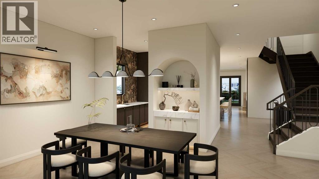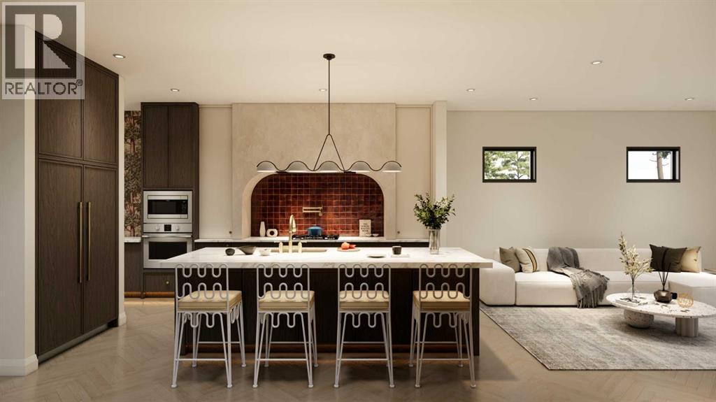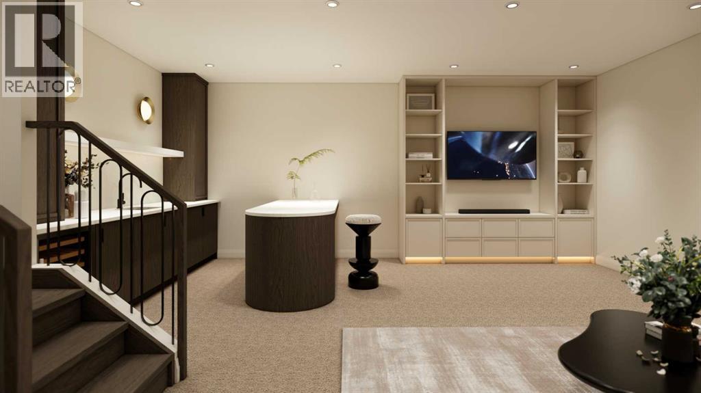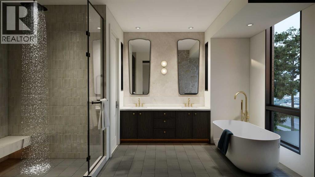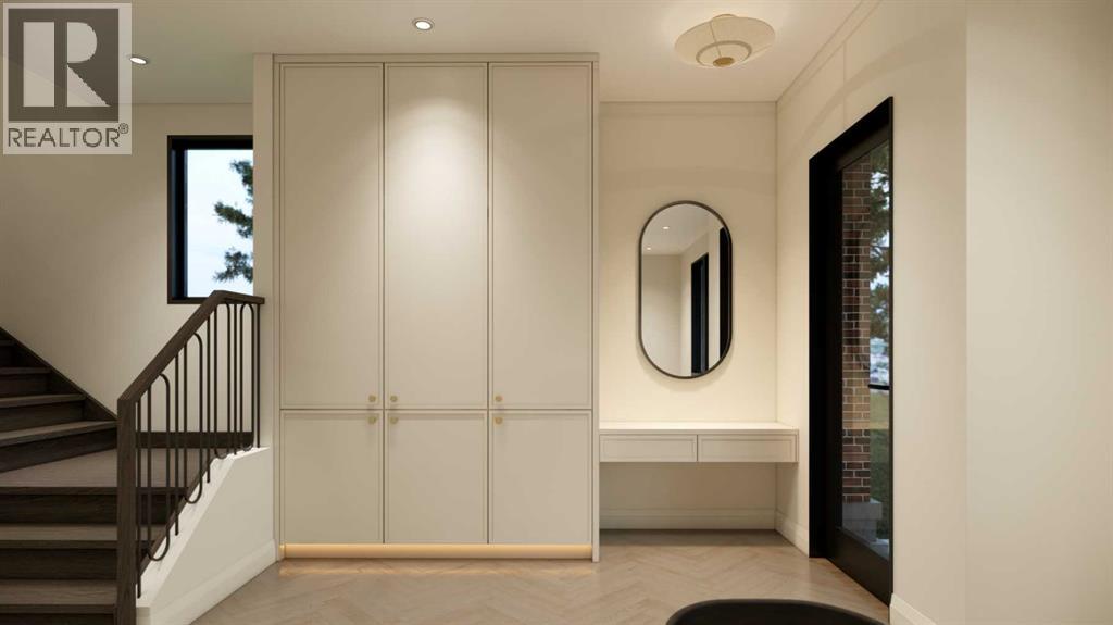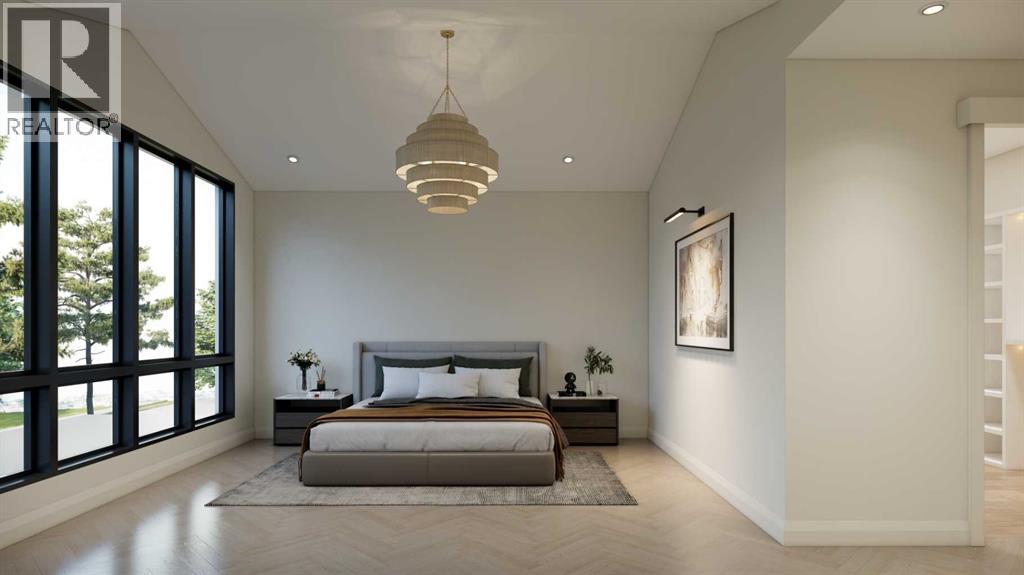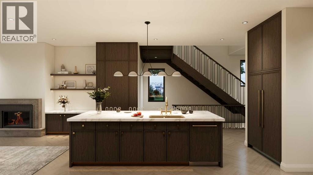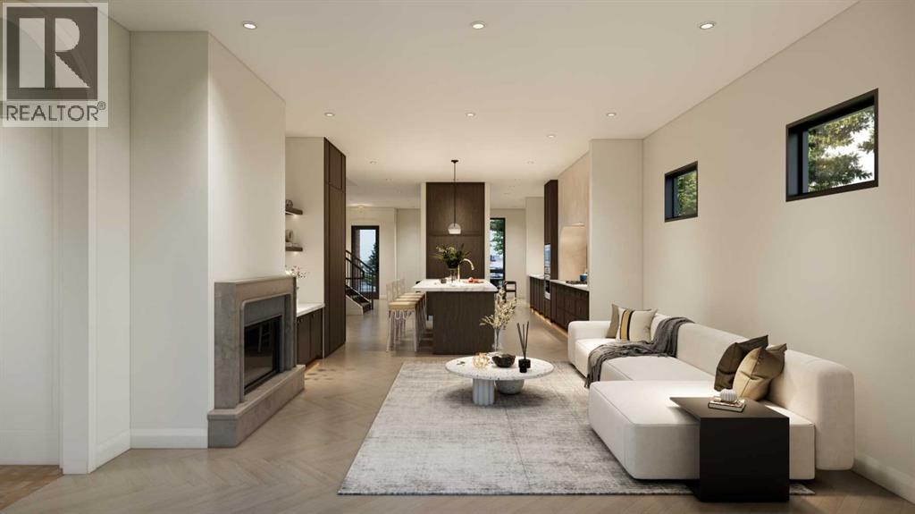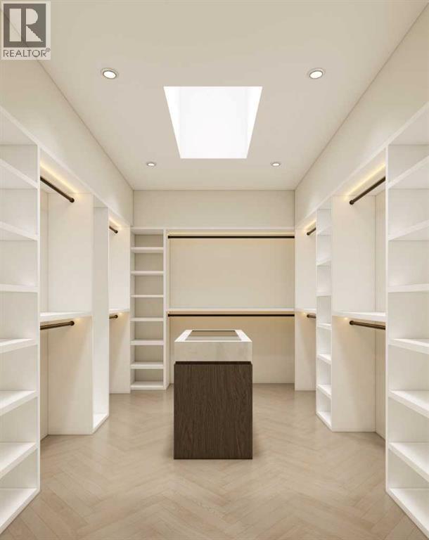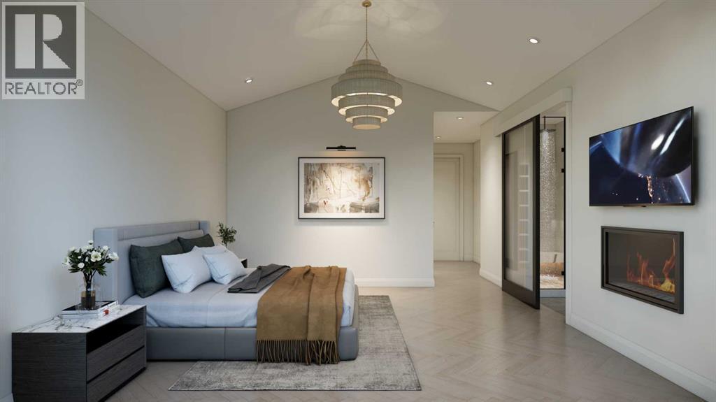 An artisanal masterpiece awaits, steps to Confederation Park, where every detail has been meticulously curated by a builder renowned for impeccable taste. Approaching the home, a large covered front patio welcomes you, setting the tone for a residence that is truly a cut above. Inside, the open~concept main floor is designed for both grand entertaining and everyday living. The front formal dining area features an adjacent wine display and a hidden butler’s pantry, both encased in elegant white oak feature walls, while a tucked away hidden home office seamlessly blends sophistication with functionality. The expansive kitchen with panel ready JennAir appliances blends effortlessly into the living room at the back. Anchored by a striking stone cast gas fireplace hearth and complemented by a discreet powder room and spacious mudroom, this main floor leaves nothing to be desired. Ascending to the upper floor, the master suite impresses with an 18~foot vaulted ceiling and 12~foot double sided stone gas fireplace, offset by a freestanding tub. The ensuite exudes a moody, indulgent vibe with accent lighting, a large steam shower with body jets, and a raindrop shower head. The walk~in closet is the size of a secondary bedroom, filled with natural light from a skylight, lit accent cabinetry and a glass countertop valet stand. Two additional bedrooms, each with tray ceilings, starlights, and backlit crown moulding, also feature their own walk~in closets and ensuites. With a conveniently located (and magazine worthy) laundry room completing this space. The lower level continues the theme of refined living, offering a large living area with projector and screen, a wet bar with island, and an additional versatile home office space with glass wall detailing. A private large fourth bedroom for a family member or guests, includes a massive walk~in closet ideal for additional home storage. Even the mechanical room is a statement piece, finished with diamond checker plate walls an d epoxy floors. Throughout the home, thoughtful features abound. The oversized garage is also heated and fully finished with epoxy flooring, and the upper bathrooms are connected to an instant hot water system, All closets are finished in a thermally fused laminate material, complemented again by fully installed air conditioning system, and speaker system throughout. This is a home that marries unparalleled craftsmanship, intelligent design, and luxurious finishes at every turn. From the moment you arrive to the final detail in the basement, this home is a true reflection of bespoke elegance. Est completion May 2026. (id:53676)