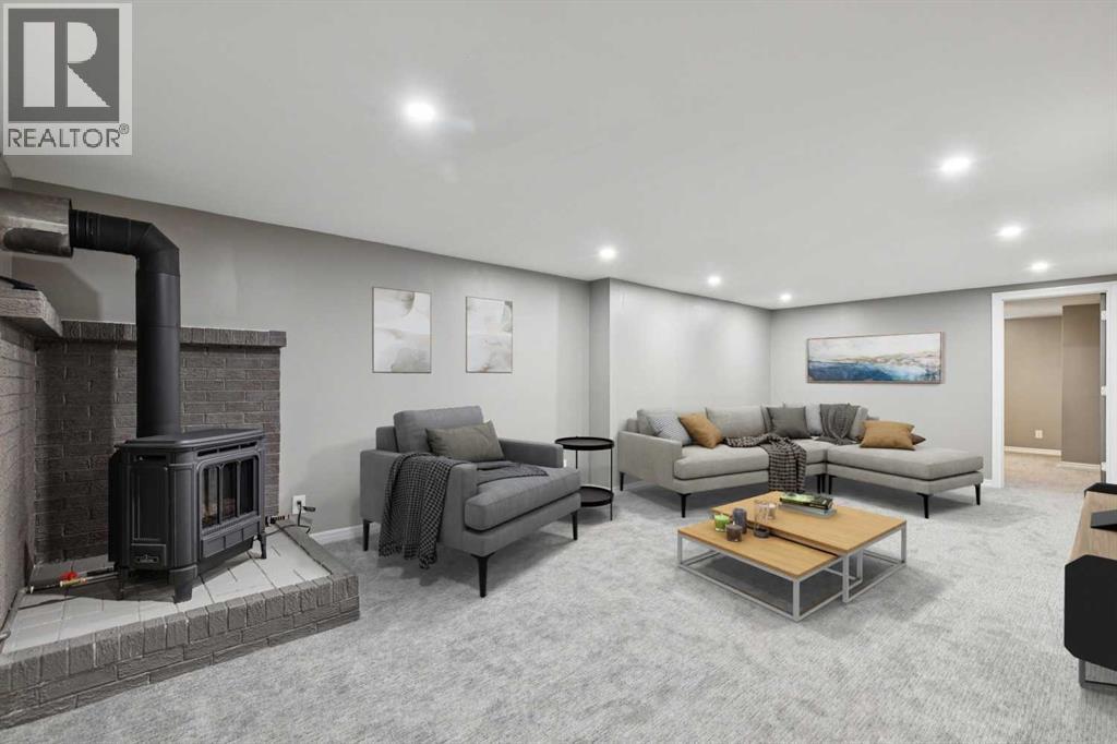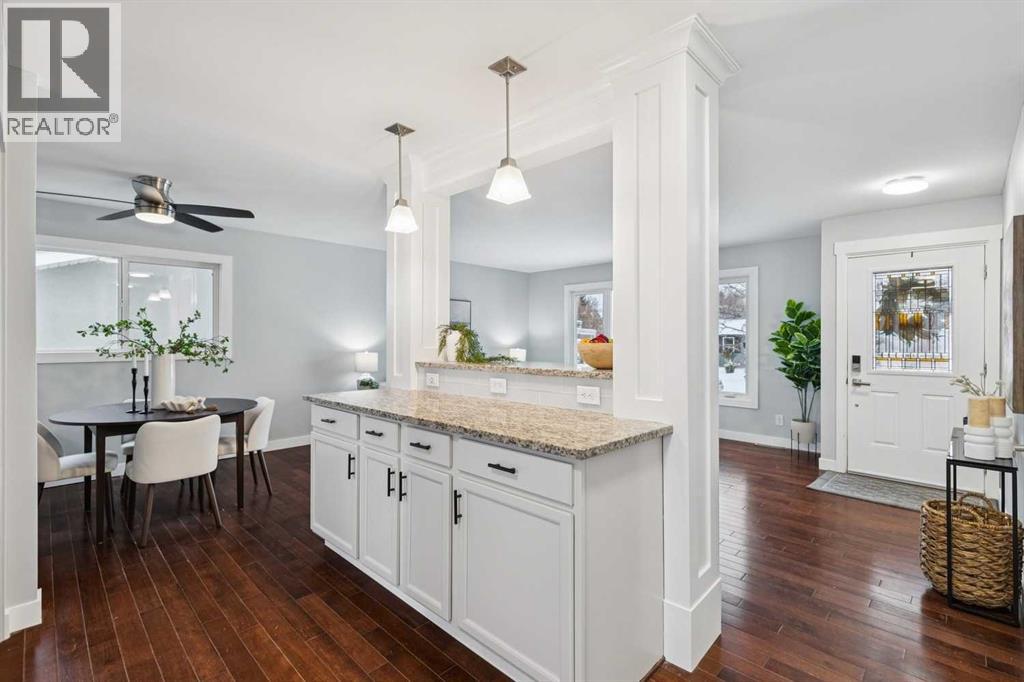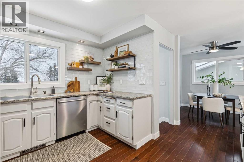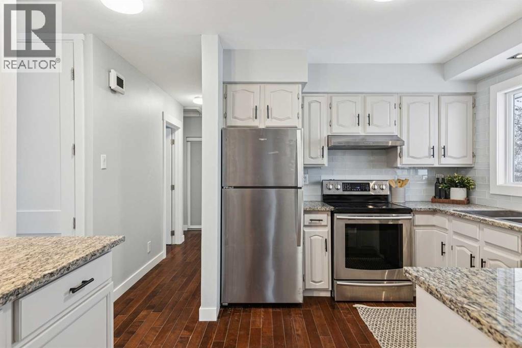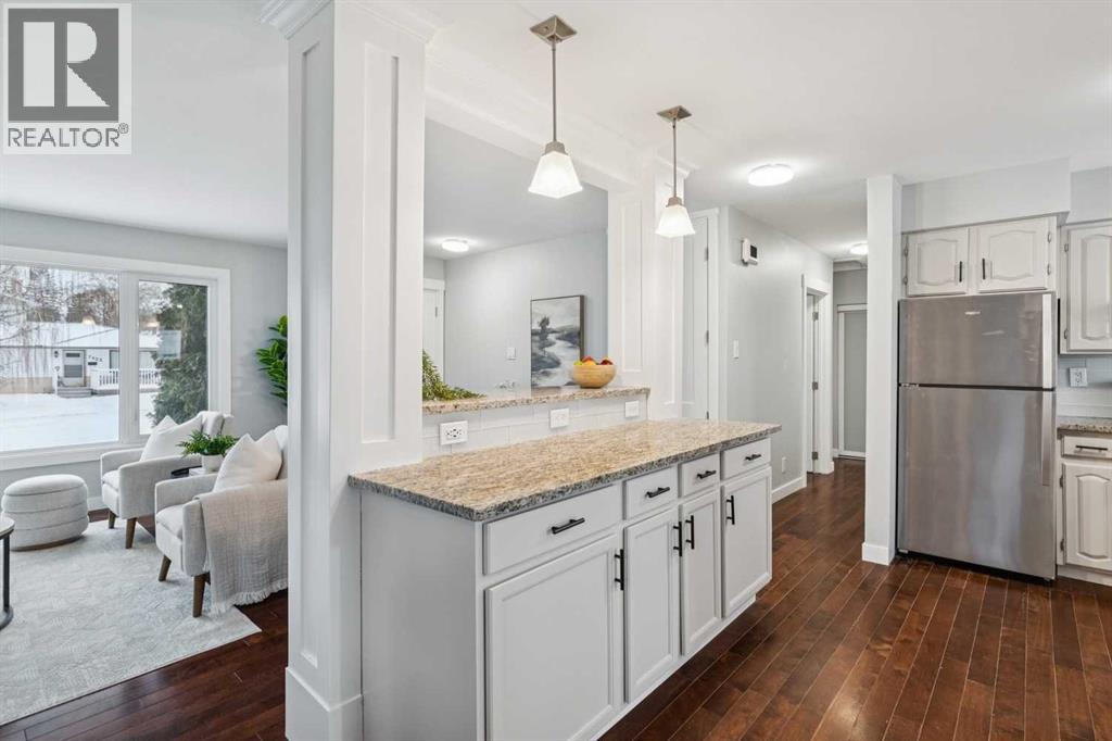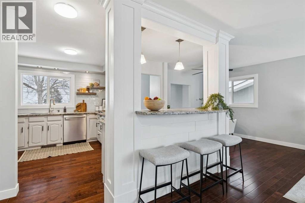 Welcome to this beautifully renovated bungalow nestled in the heart of Fairview, a mature, tree-lined community known for its welcoming feel and unbeatable convenience. Offering immediate possession, this move-in-ready home blends timeless charm with thoughtful modern updates throughout. Freshly painted throughout in 2025 and featuring new carpet in the fully developed basement (2025), the home is bright, refreshed, and ready for its next chapter. Hardwood floors grace the main level, where a large front window (new in 2024) fills the inviting living room with natural light and overlooks the landscaped front yard. The kitchen has been tastefully updated with newly painted cabinetry (2026), stylish new hardware, granite countertops, stainless steel appliances, a brand-new fridge (never used), breakfast bar seating, new lighting, and even a water line behind the fridge for a future ice and water connection. The main floor offers 3 comfortable bedrooms and a full bathroom complete with a tiled tub & shower combo. Downstairs, the spacious lower level creates the perfect retreat with a large rec room with plush new carpet (2025), a new gas fireplace (2022), a 4th bedroom with an egress window, a convenient half bathroom (seller can add shower for additional cost), laundry area with storage, generous storage room with shelving, water softener, and a dedicated workbench space for projects and storage. Comfort continues with air conditioning added in 2021 and rough-in for central vacuum. Outside, the fully fenced backyard is designed for both relaxation and enjoyment, featuring mature lilac bushes, a large deck ideal for summer evenings, garden beds, back alley access, and the rare bonus of an off-leash dog park directly behind. Parking for 4 is effortless with a detached single garage boasting a new smart overhead door (2021), new shingles (2021), and a gas line already run for a future heater, plus 1 driveway stall and 2 additional spaces beside the garage. The house roof was comprehensively redone in 2021 with new shingles, eaves, soffits, and downspouts, and the front windows were replaced in 2024. All new attic insulation in 2021. Ideally situated near Fairview School and Lord Beaverbrook High School, close to parks, shopping, transit, and with quick access to Glenmore Trail and Macleod Trail, this lovingly maintained home offers the perfect blend of comfort, functionality, and location in one of Calgary’s most established neighbourhoods. (id:53676)