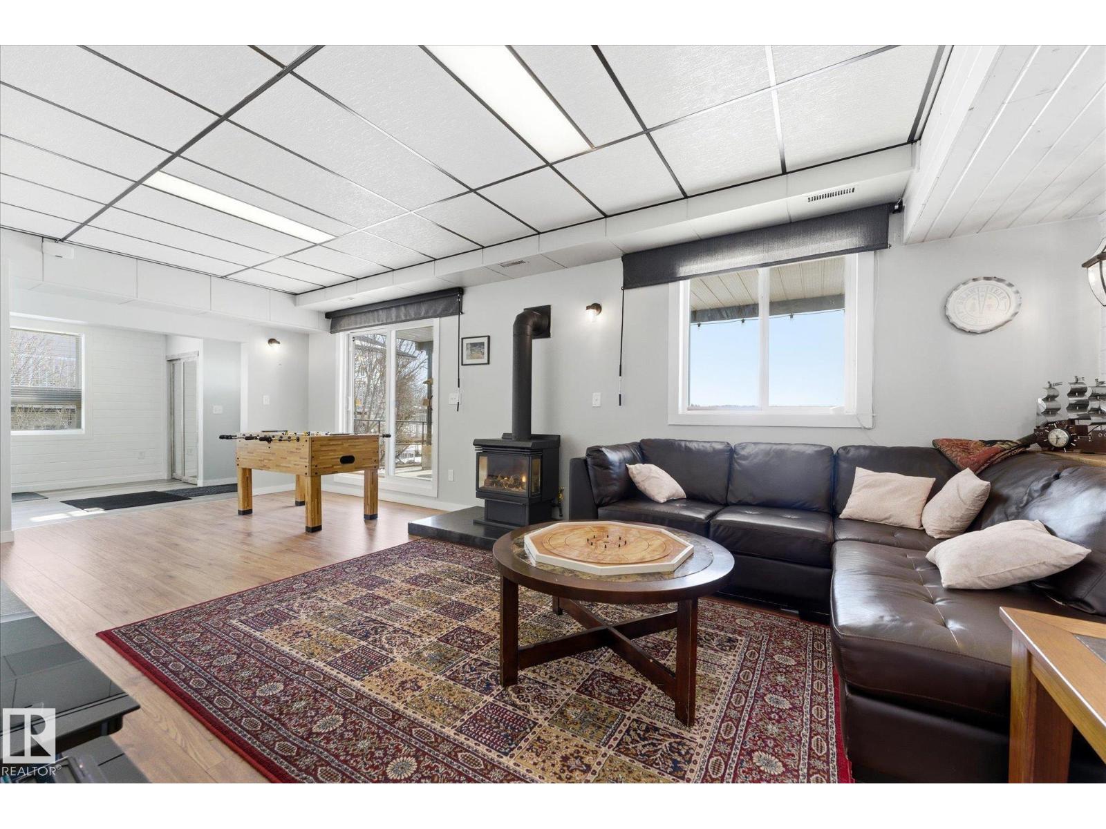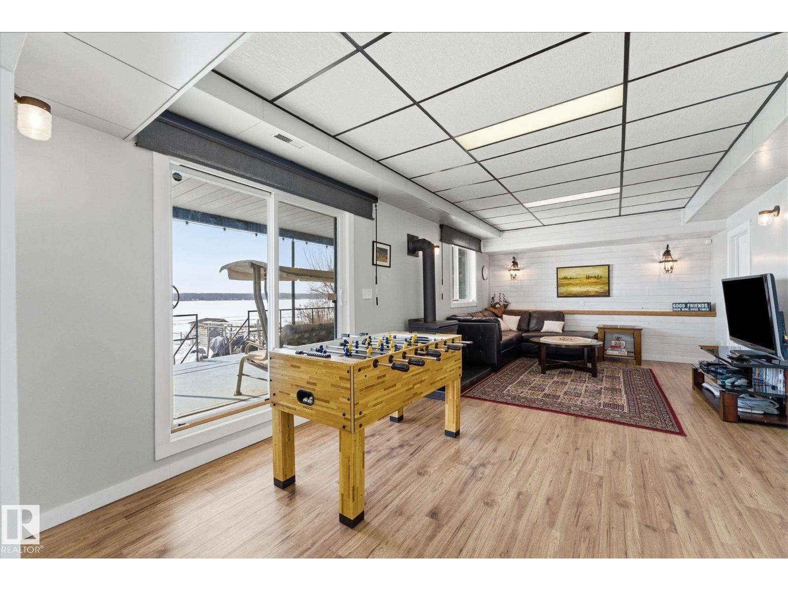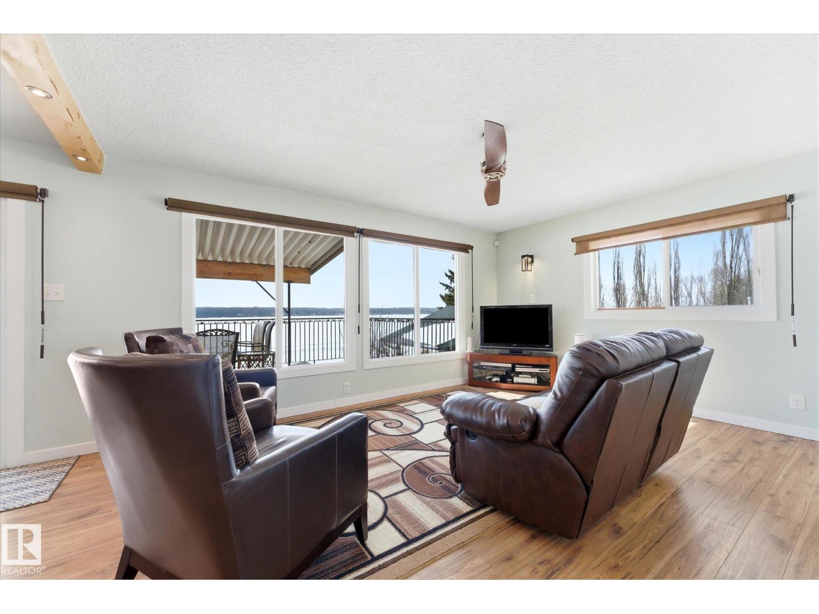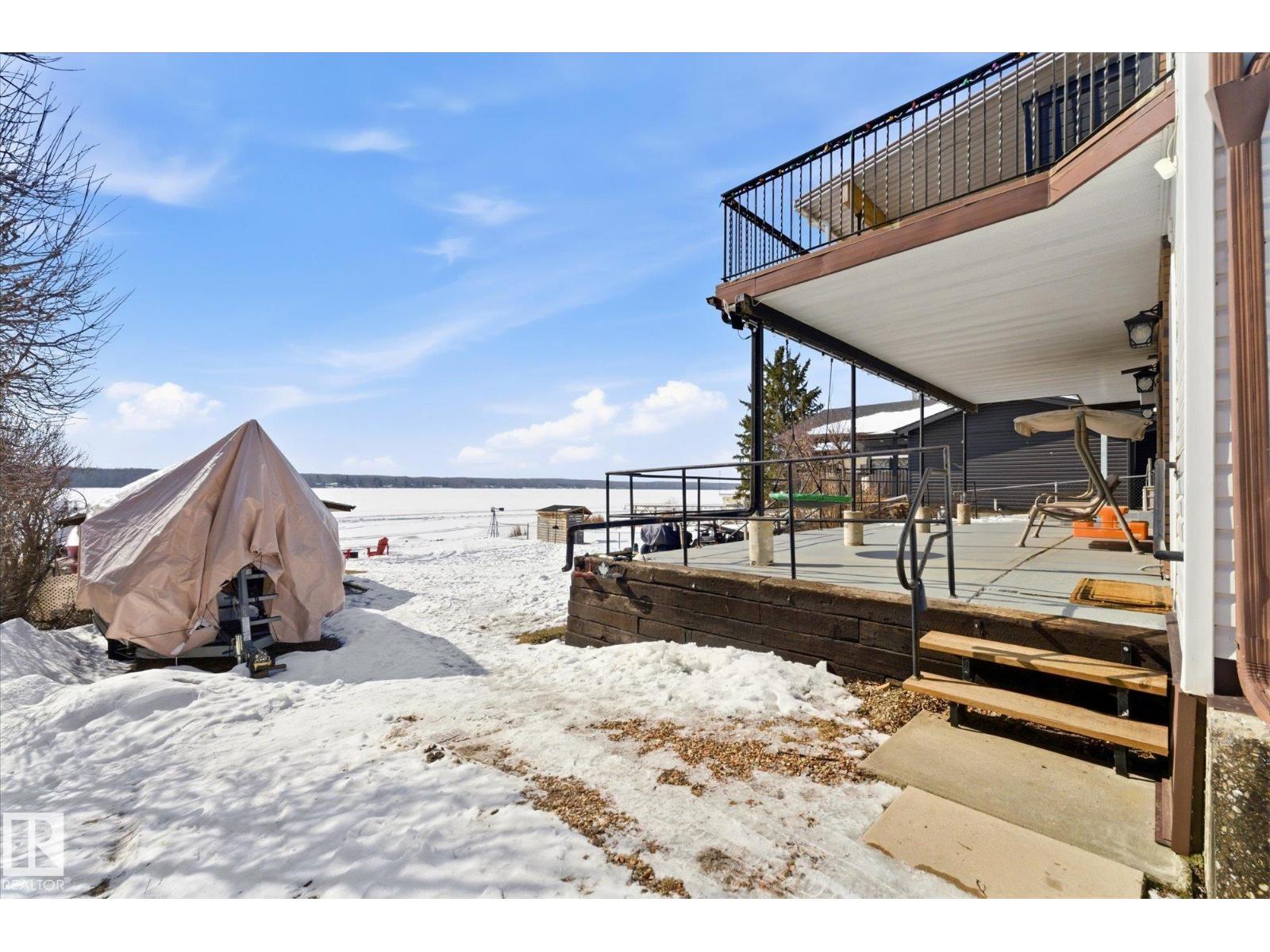 The lake place everyone wants to come back to. Full lakefront walkout bungalow on Isle Lake, set on a quiet no-through road in the Summer Village of South View. Major updates in 2020, the home offers two bright, lake-facing gathering areas with large windows, giving extended family & guests both connection & separation. With three bedrooms plus a separate four-season flex room (approx. 110–120 sq. ft. with its own exterior access), there’s room for family & guests. Covered outdoor spaces on both levels—a spacious upper deck & fully covered lower patio—extend your time outside in changing weather, while the walkout basement provides direct lake access. The fenced yard adds peace of mind, & the detached drive-through garage functions as a boathouse with overhead doors at both ends. An improved shoreline enhances usability & long-term enjoyment. Located in a well-run community with a park, playground, & boat launch, where lake life stretches from summer days on the water to winter skating & sunset evenings. (id:53676)