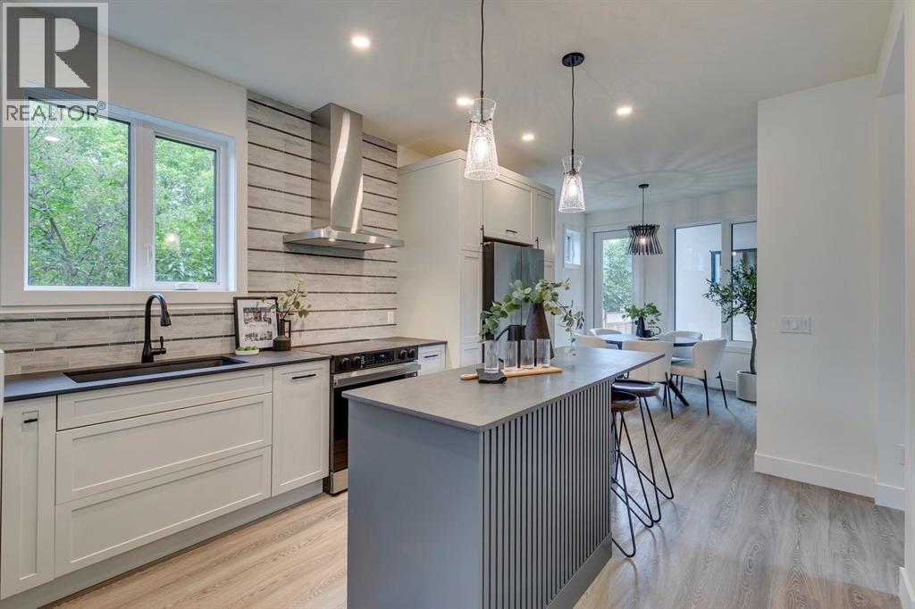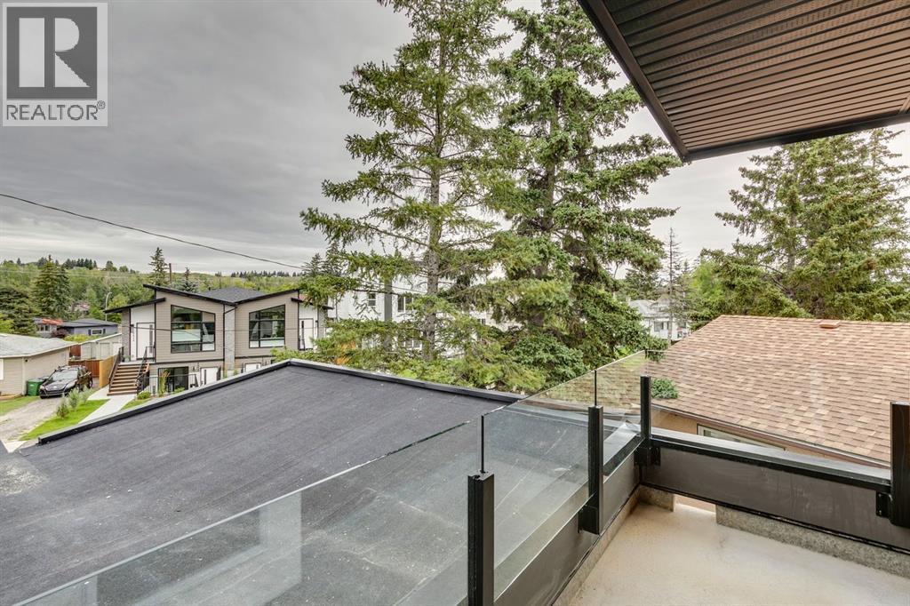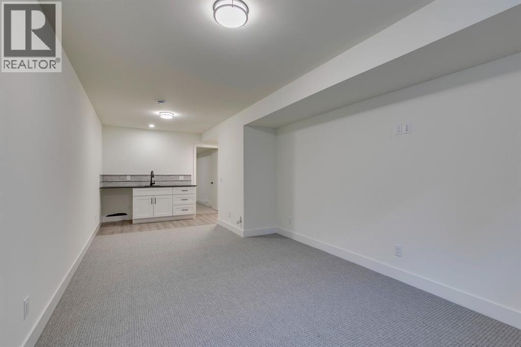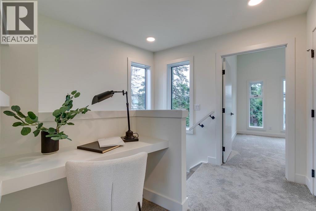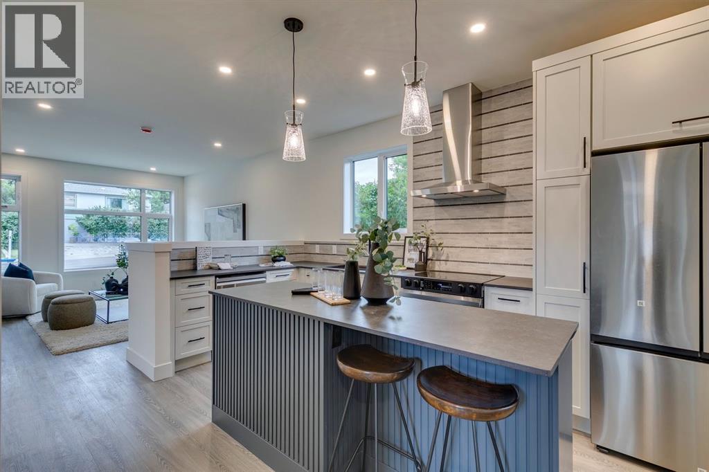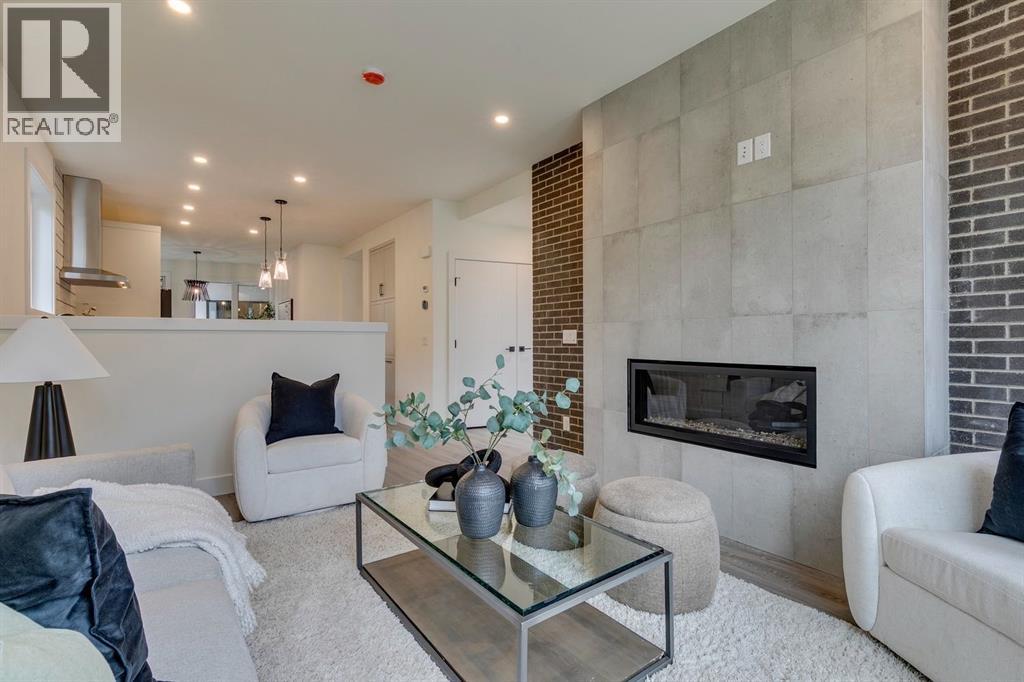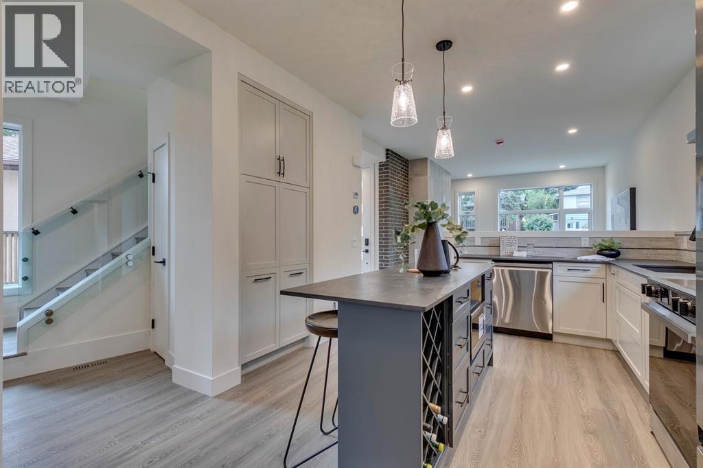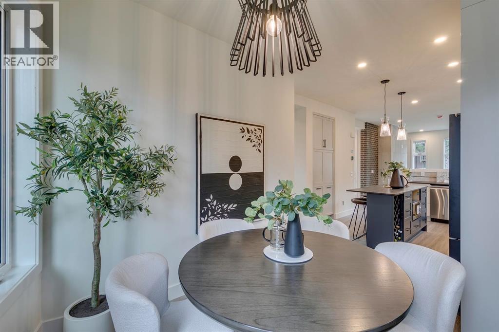 This stunning newly built detached home by Timberland Homes showcases exceptional craftsmanship and modern design throughout. The main floor features a striking brick feature wall and a spacious living room with a linear gas fireplace and sleek tile surround. The chef-inspired kitchen offers new stainless steel appliances, quartz countertops, a large island with an eat-up counter, and a stylish, functional pull-out pantry. Adjacent to the kitchen is a bright dining area, perfect for everyday meals or entertaining guests. A rare double attached garage leads into a practical mudroom, adding convenience to daily life. Upstairs, you’ll find two generous bedrooms, a four-piece bathroom, and a cozy home office nook. The primary bedroom is a private retreat with vaulted ceilings, a luxurious four-piece ensuite, and access to a serene private balcony—ideal for morning coffee or quiet evenings. The upper floor also includes a conveniently located laundry area. The fully finished lower level is filled with natural light from large windows and includes a third bedroom, a three-piece bathroom, a bar area, and a spacious family room—ideal for relaxing or entertaining. Throughout the home, you’ll find high-quality finishes such as solid core doors, LED lighting, and superior attention to detail. This home is only minutes away from the trendy shops and cafes in Bowness, offering the perfect balance of quiet residential living and vibrant urban amenities. (id:53676)