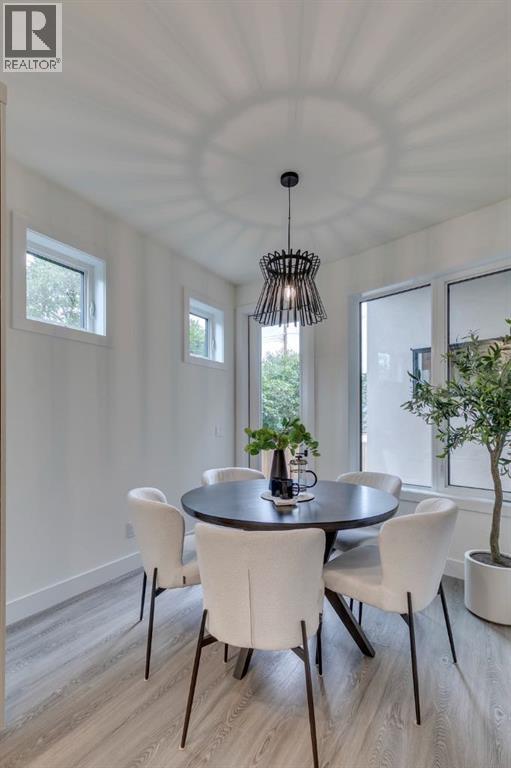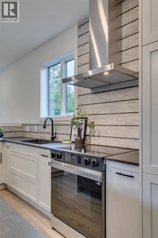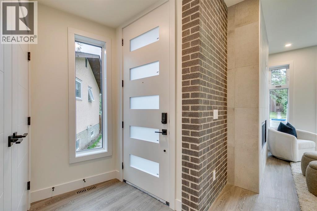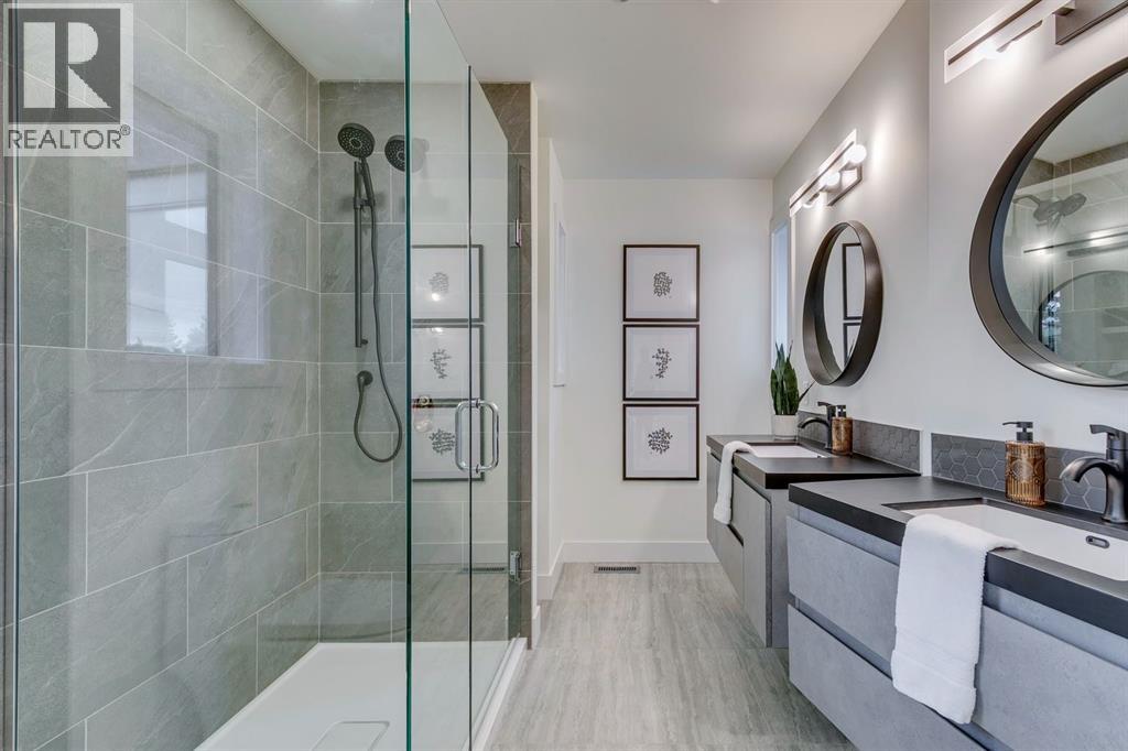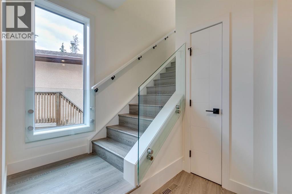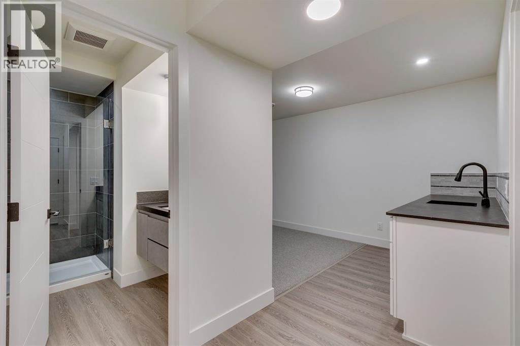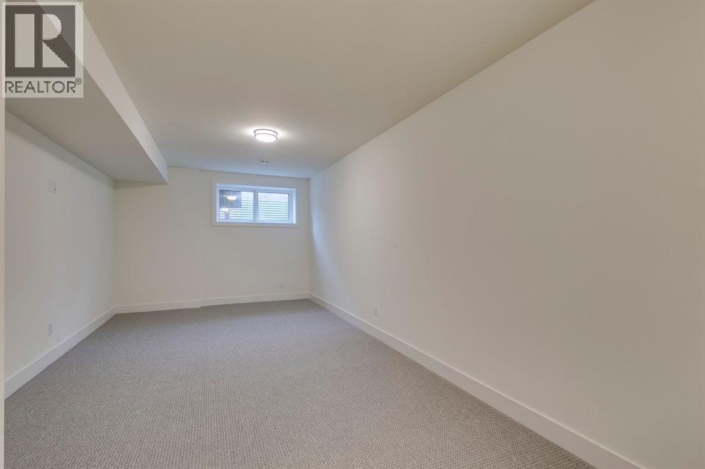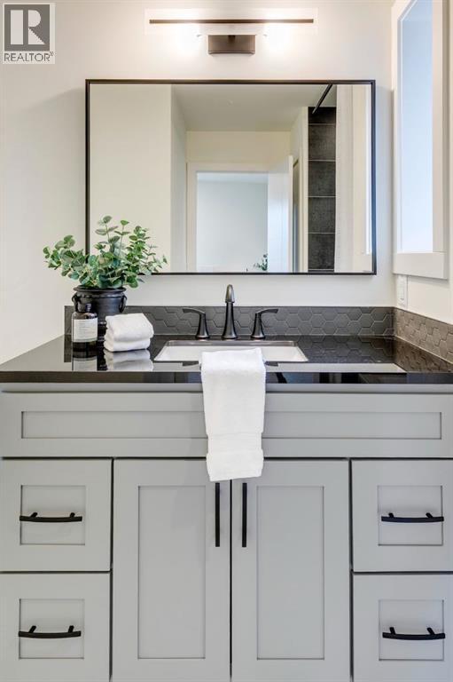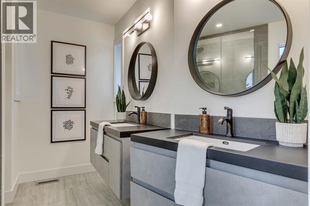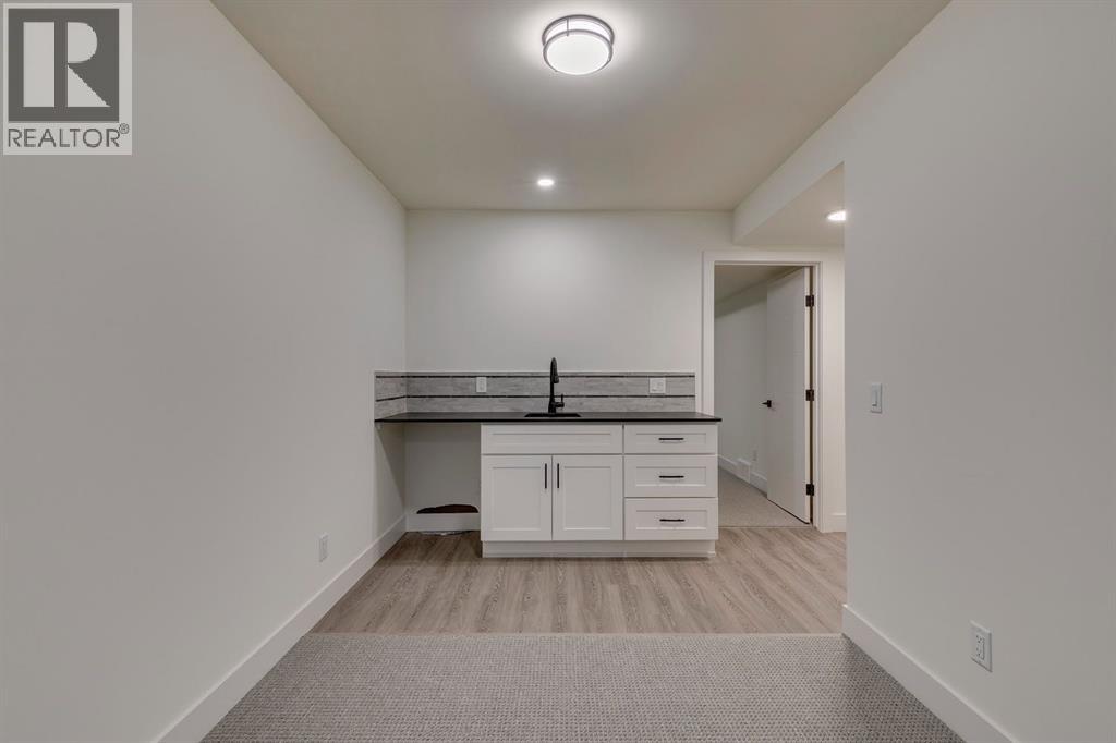 This stunning newly built detached home by Timberland Homes showcases exceptional craftsmanship and modern design throughout. The main floor features a striking brick feature wall and a spacious living room with a linear gas fireplace and sleek tile surround. The chef-inspired kitchen offers new stainless steel appliances, quartz countertops, a large island with an eat-up counter, and a stylish, functional pull-out pantry. Adjacent to the kitchen is a bright dining area, perfect for everyday meals or entertaining guests. A rare double attached garage leads into a practical mudroom, adding convenience to daily life. Upstairs, you’ll find two generous bedrooms, a four-piece bathroom, and a cozy home office nook. The primary bedroom is a private retreat with vaulted ceilings, a luxurious four-piece ensuite, and access to a serene private balcony—ideal for morning coffee or quiet evenings. The upper floor also includes a conveniently located laundry area. The fully finished lower level is filled with natural light from large windows and includes a third bedroom, a three-piece bathroom, a bar area, and a spacious family room—ideal for relaxing or entertaining. Throughout the home, you’ll find high-quality finishes such as solid core doors, LED lighting, and superior attention to detail. This home is only minutes away from the trendy shops and cafes in Bowness, offering the perfect balance of quiet residential living and vibrant urban amenities. (id:53676)