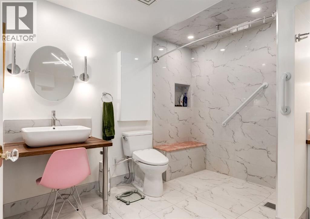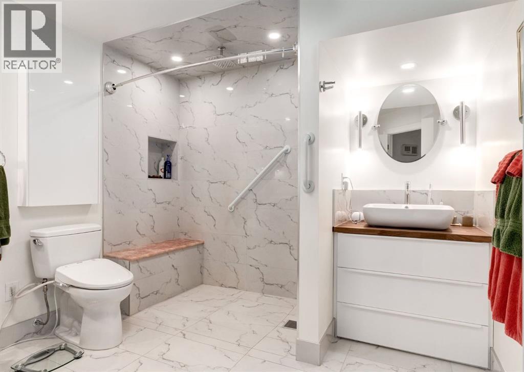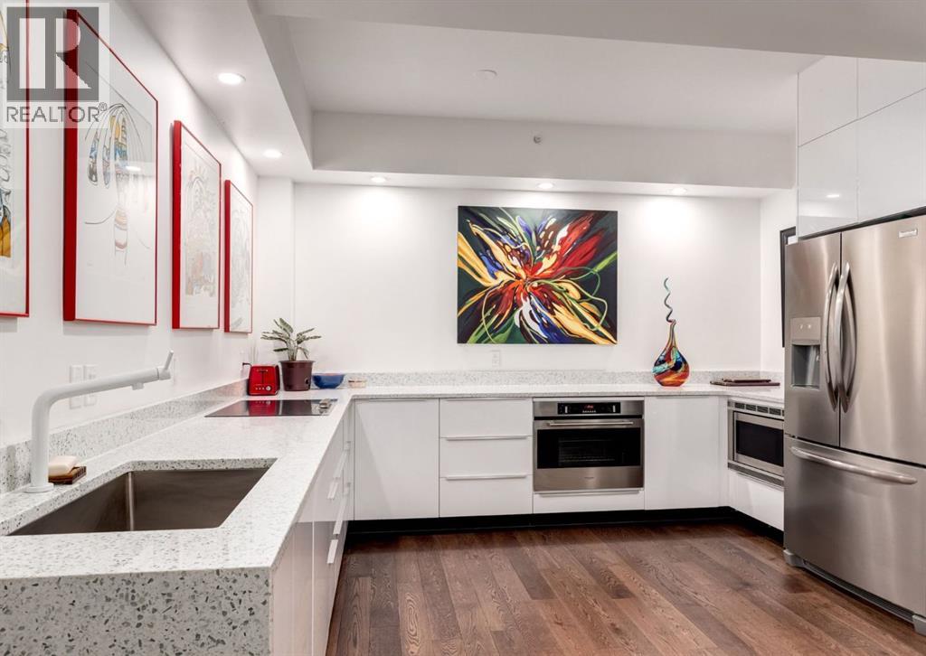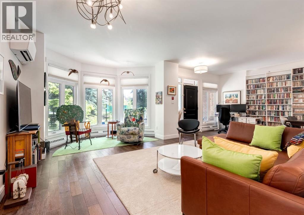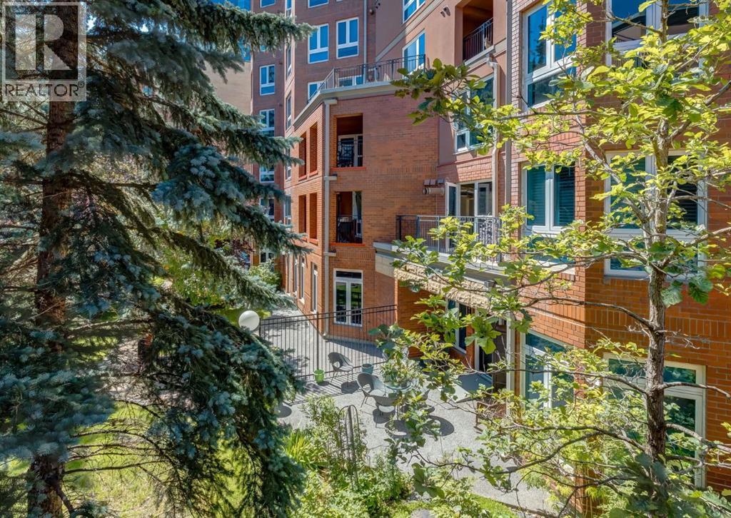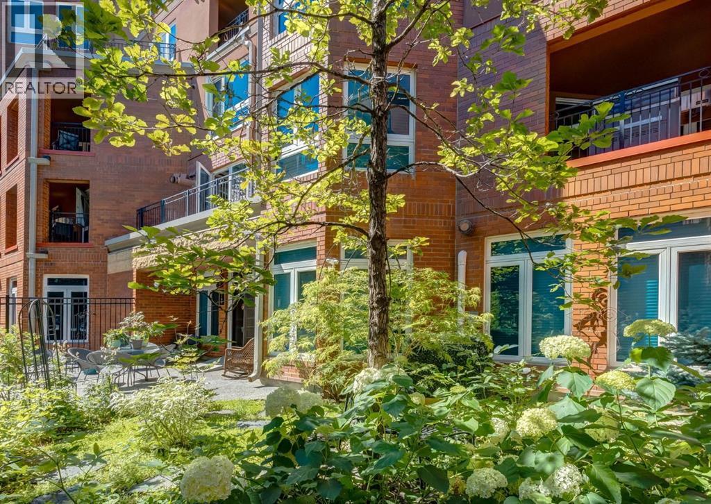 Rare Garden-Level Bungalow in Eau Claire with a private yard, professionally renovated interior, and exceptional accessibility. Offering over 1,400 square feet of refined single-level living, this home combines modern comfort, thoughtful design, and an unbeatable location. Step into a bright and open-concept living space with 9-foot ceilings, engineered hardwood floors, and garden-facing windows fitted with upgraded blinds. The spacious layout includes a 1-bedroom plus a den—perfect for a home office or overnight guests. The fully renovated kitchen is both stylish and functional, featuring quartz countertops, stainless steel appliances, induction cooktop, ample storage, and a generous sized pantry. The primary suite easily fits a king-sized bed with room to spare. The luxurious, handicap-accessible bathroom features a large barrier-free waterproofed shower with a stunning rose quartz bench, dual sinks, and elegant modern finishes. A dedicated mud room with full sized washer and dryer connects directly to the heated underground parkade, offering the convenience of private front and back entrances—ideal for pet owners, gardeners, or anyone seeking easy access. Outdoor living is just as impressive, with a private fenced yard, aggregate patio, gas line for BBQ, and beautiful flowers surrounded by mature trees—your own tranquil oasis in the city. This pet-friendly complex (with board approval) includes valuable amenities like a car wash bay, 27 indoor visitor parking stalls, onsite property manager, and a secure concrete structure for peace of mind. Additional highlights include air conditioning, titled underground parking directly outside of the unit, assigned storage locker, and condo fees that include all utilities (water, power, gas). Whether you're downsizing from a house or seeking a posh, low-maintenance inner-city lifestyle, this exceptional home offers comfort and convenience in one of Calgary’s most desirable communities. Floor plans and a 3D tour are readily available, providing a glimpse into this stylish condo! (id:53676)