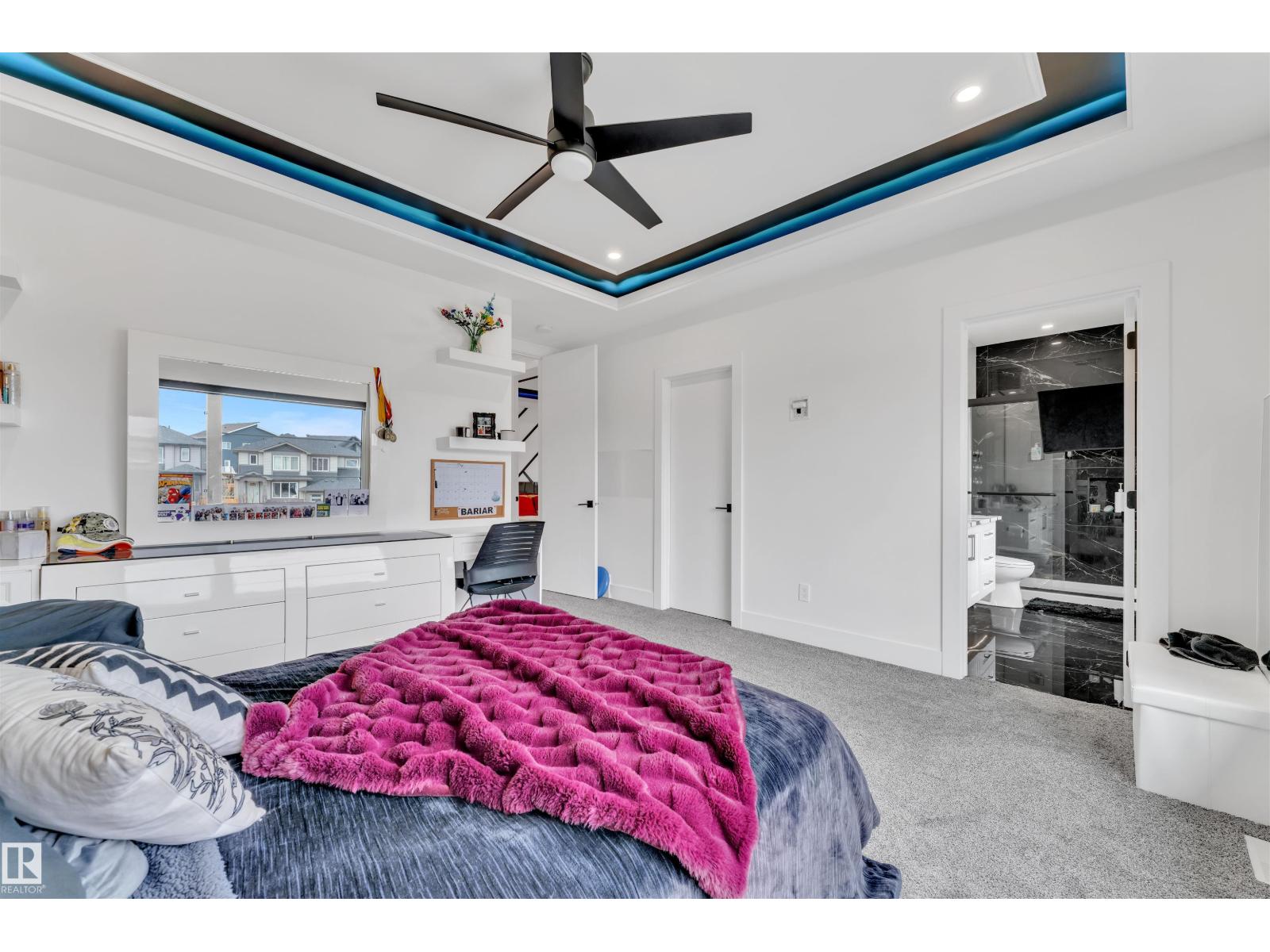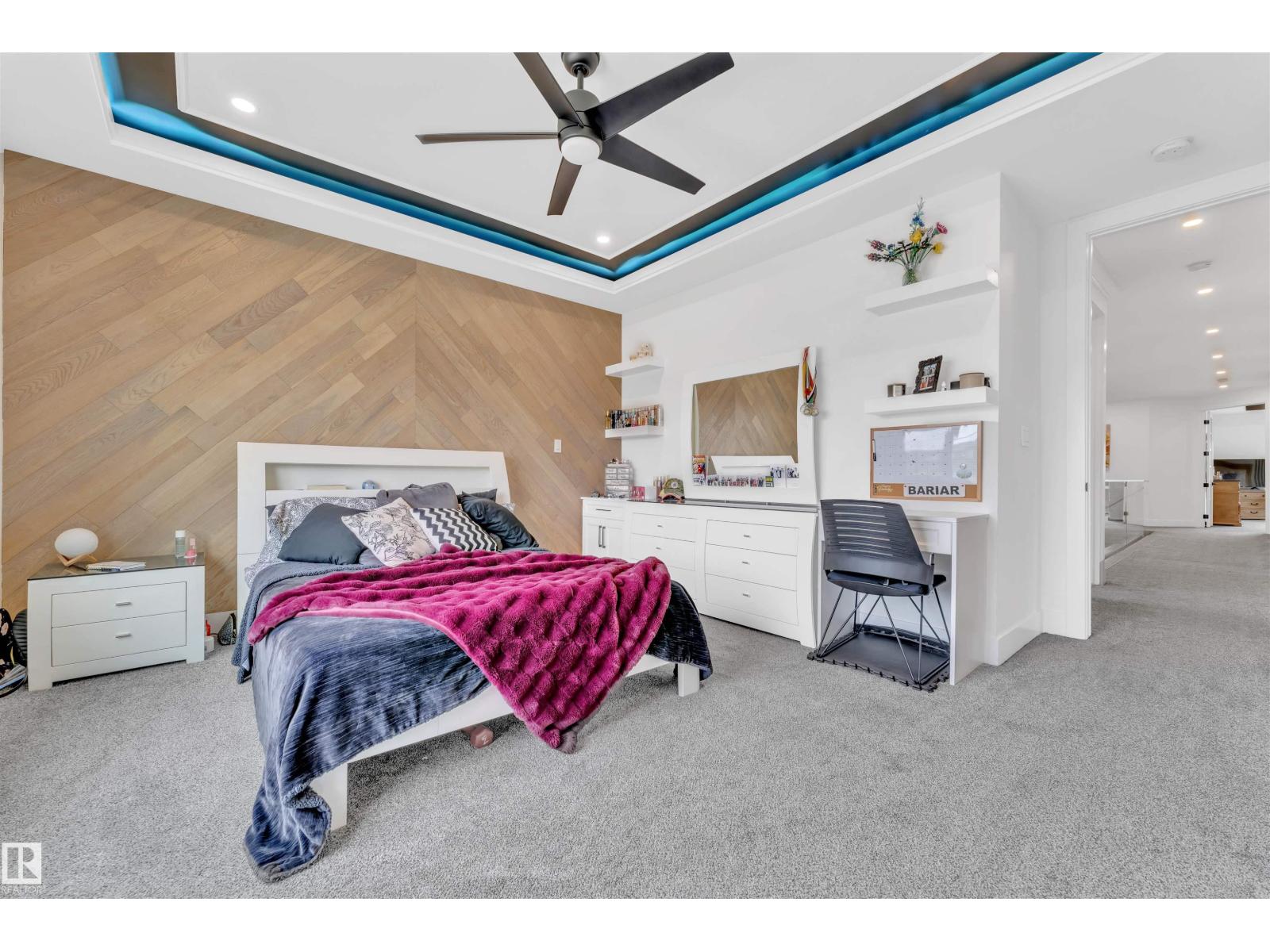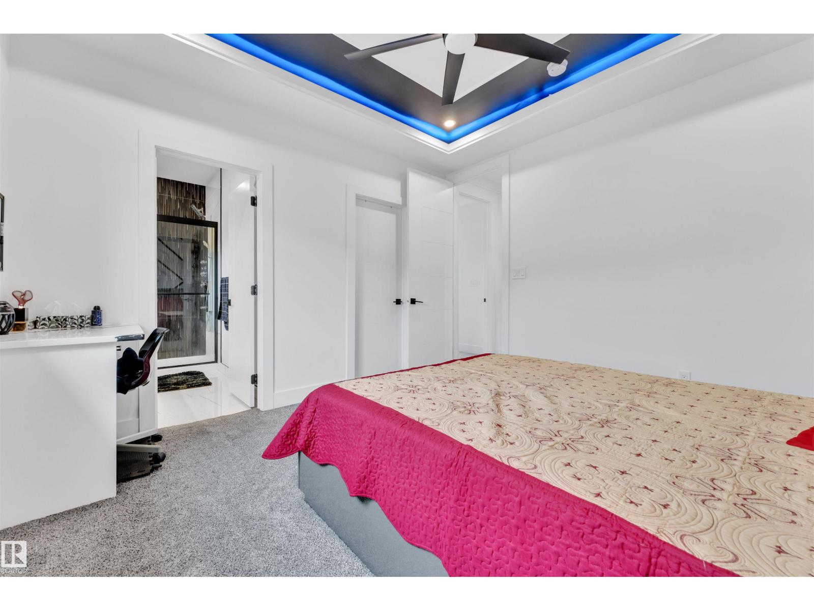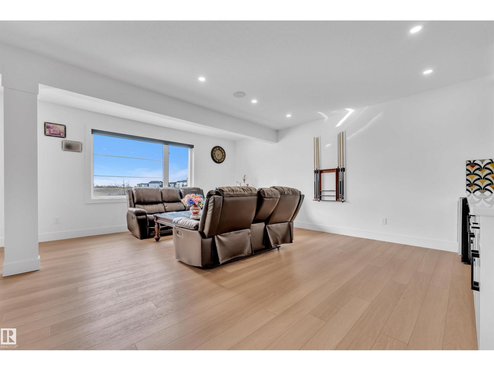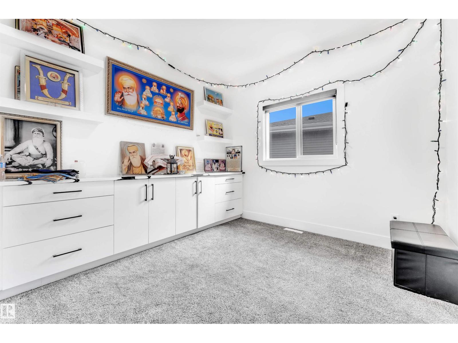 Experience luxury living in this stunning 3,920 sq. ft. walkout home featuring a rare triple garage and serene pond views. The main floor impresses with a bright open-to-below living room, a cozy family area, and a versatile bedroom or den paired with a full 3-piece bath—perfect for guests or multigenerational living. A thoughtfully designed mudroom adds everyday convenience, while the chef-inspired main kitchen showcases elegant quartz countertops, complemented by a fully equipped separate spice kitchen. Upstairs, discover four generously sized bedrooms, each with its own private ensuite, along with a convenient laundry room, a spacious bonus room, and an additional prayer or storage space. The fully finished walkout basement is an entertainer’s dream, offering two additional bedrooms, two full bathrooms, a dedicated theatre room, a second kitchen, a wet bar, and a large recreation area—ideal for hosting or extended family living. (id:53676)