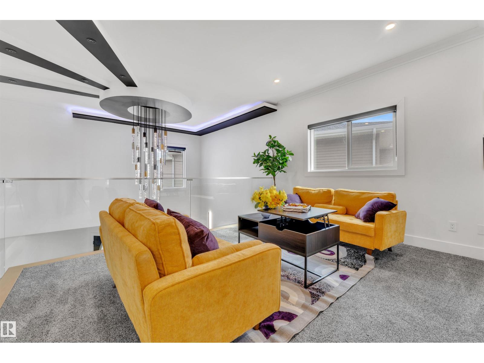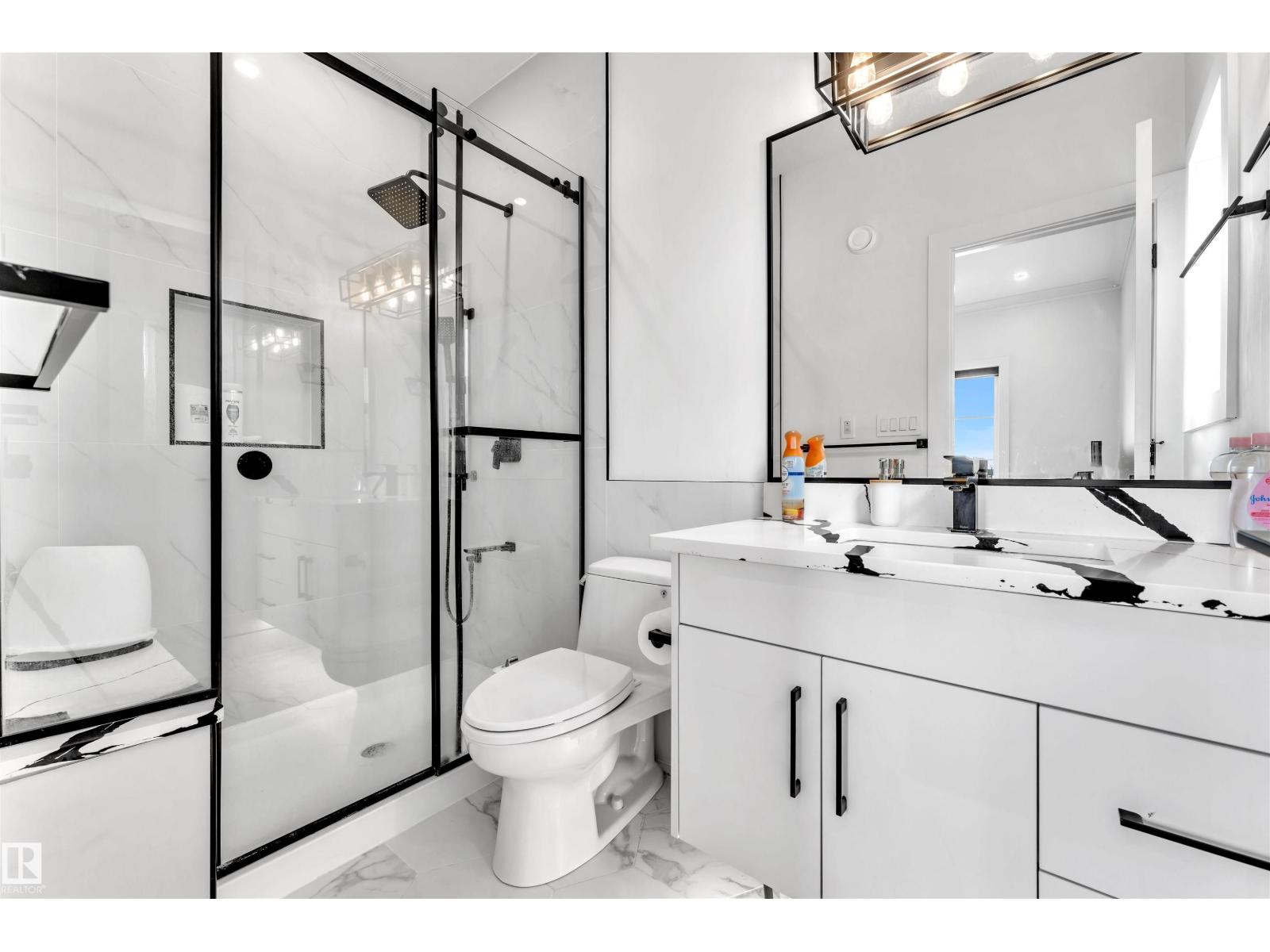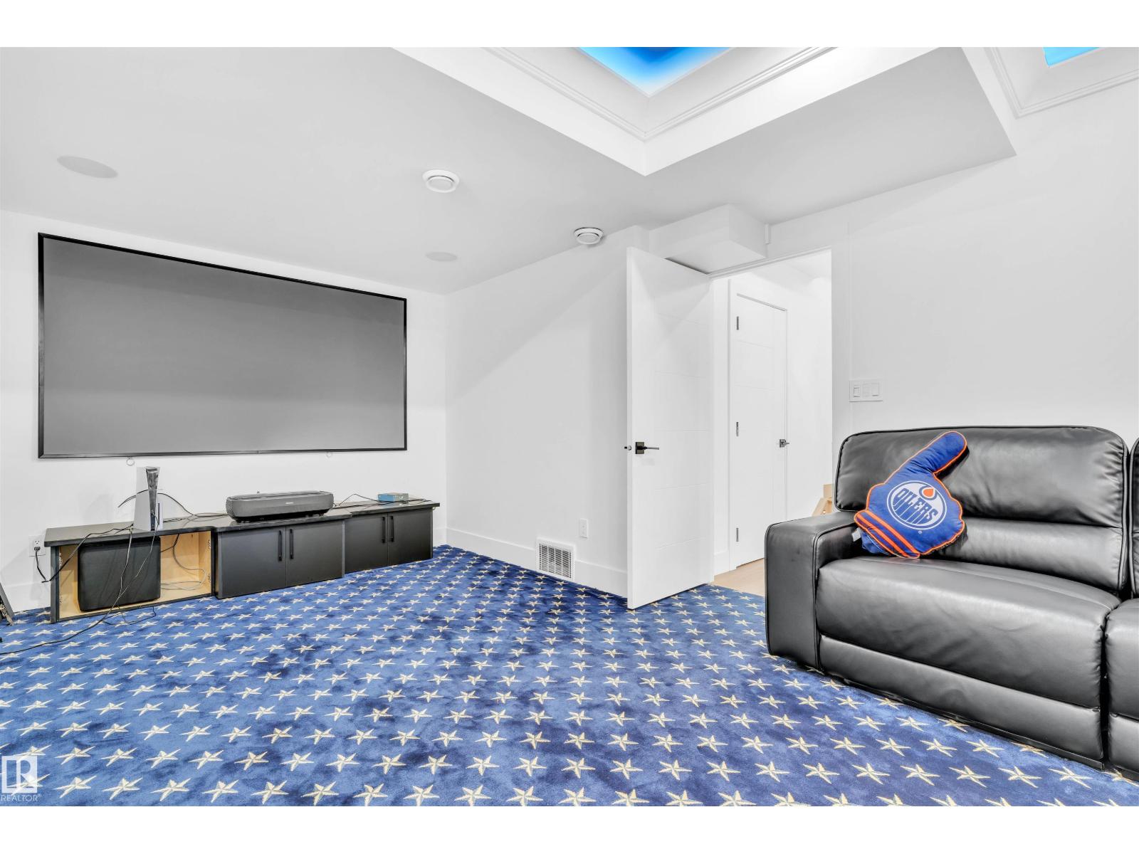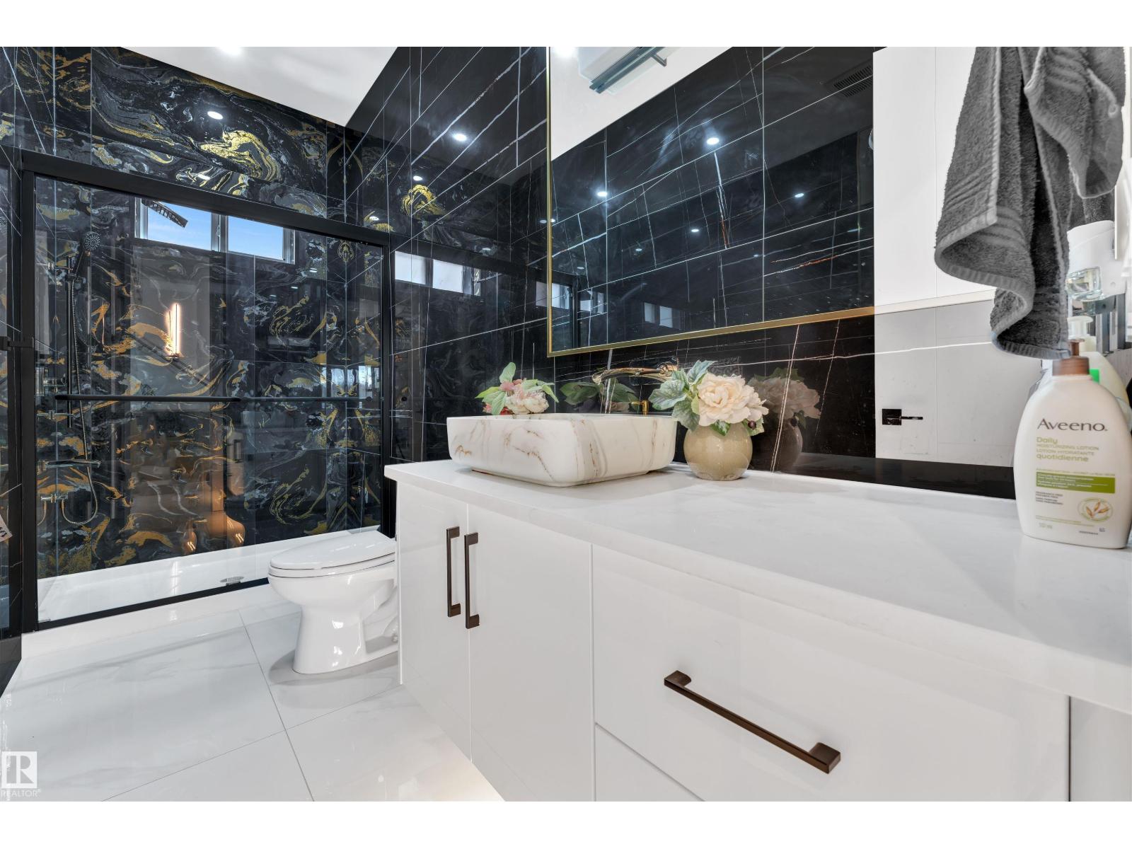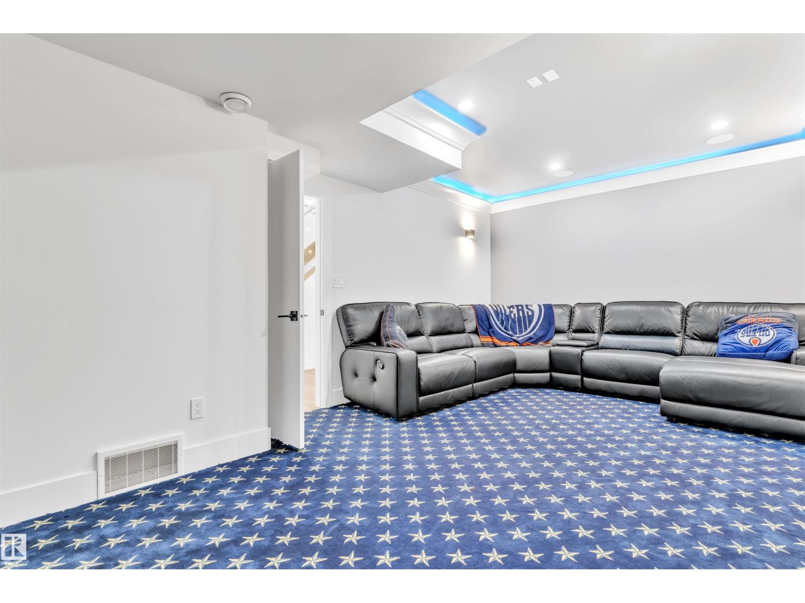 Experience luxury living in this stunning 3,920 sq. ft. walkout home featuring a rare triple garage and serene pond views. The main floor impresses with a bright open-to-below living room, a cozy family area, and a versatile bedroom or den paired with a full 3-piece bath—perfect for guests or multigenerational living. A thoughtfully designed mudroom adds everyday convenience, while the chef-inspired main kitchen showcases elegant quartz countertops, complemented by a fully equipped separate spice kitchen. Upstairs, discover four generously sized bedrooms, each with its own private ensuite, along with a convenient laundry room, a spacious bonus room, and an additional prayer or storage space. The fully finished walkout basement is an entertainer’s dream, offering two additional bedrooms, two full bathrooms, a dedicated theatre room, a second kitchen, a wet bar, and a large recreation area—ideal for hosting or extended family living. (id:53676)